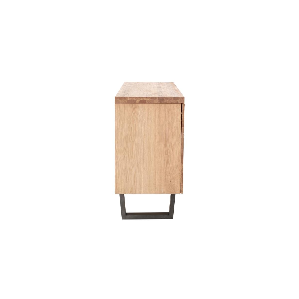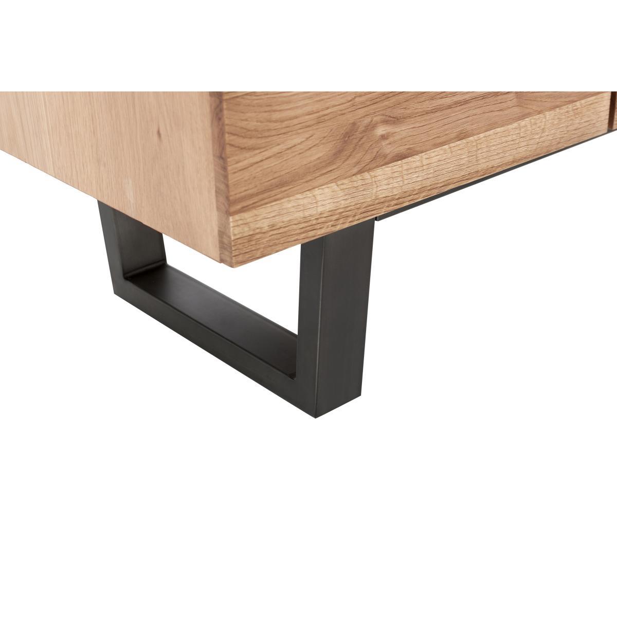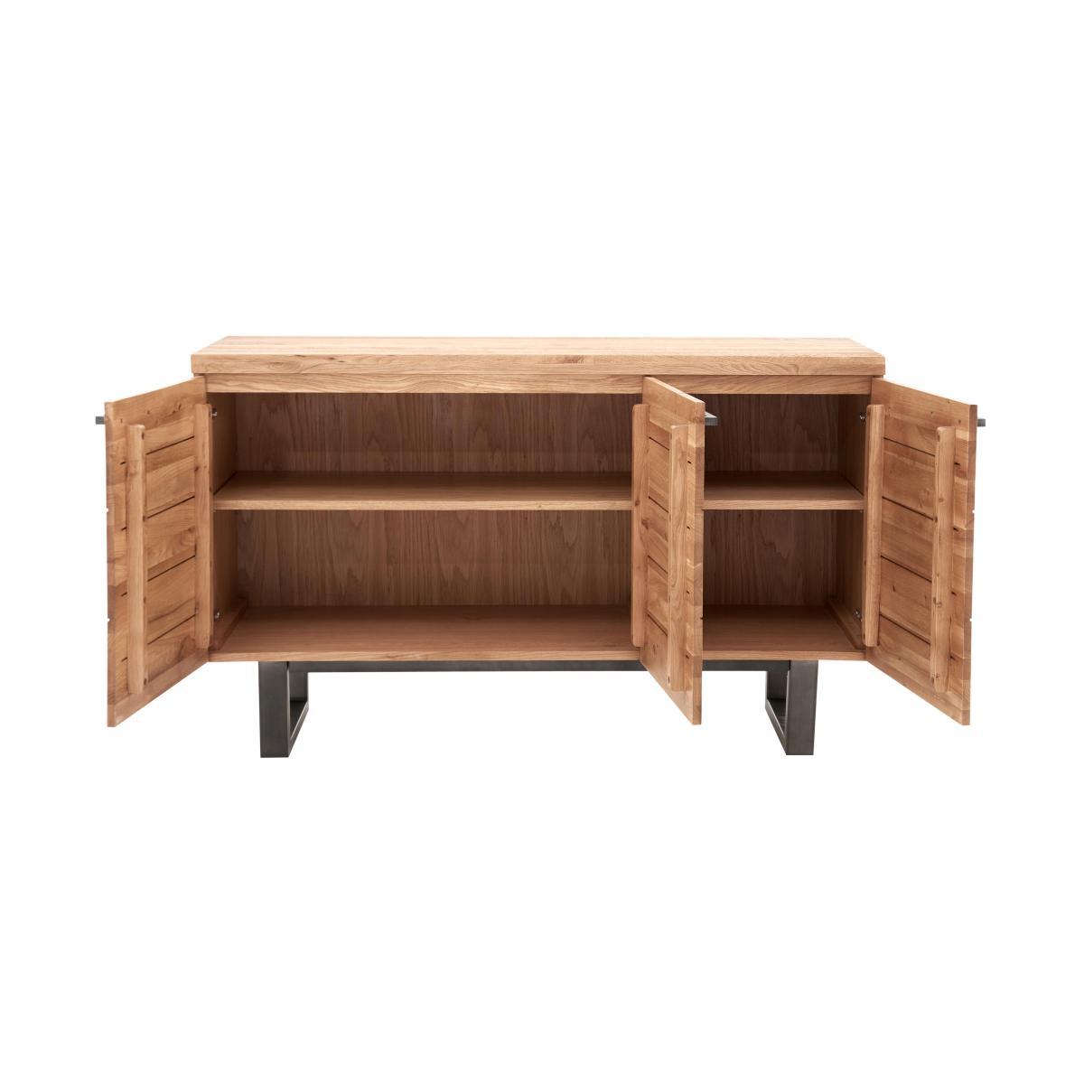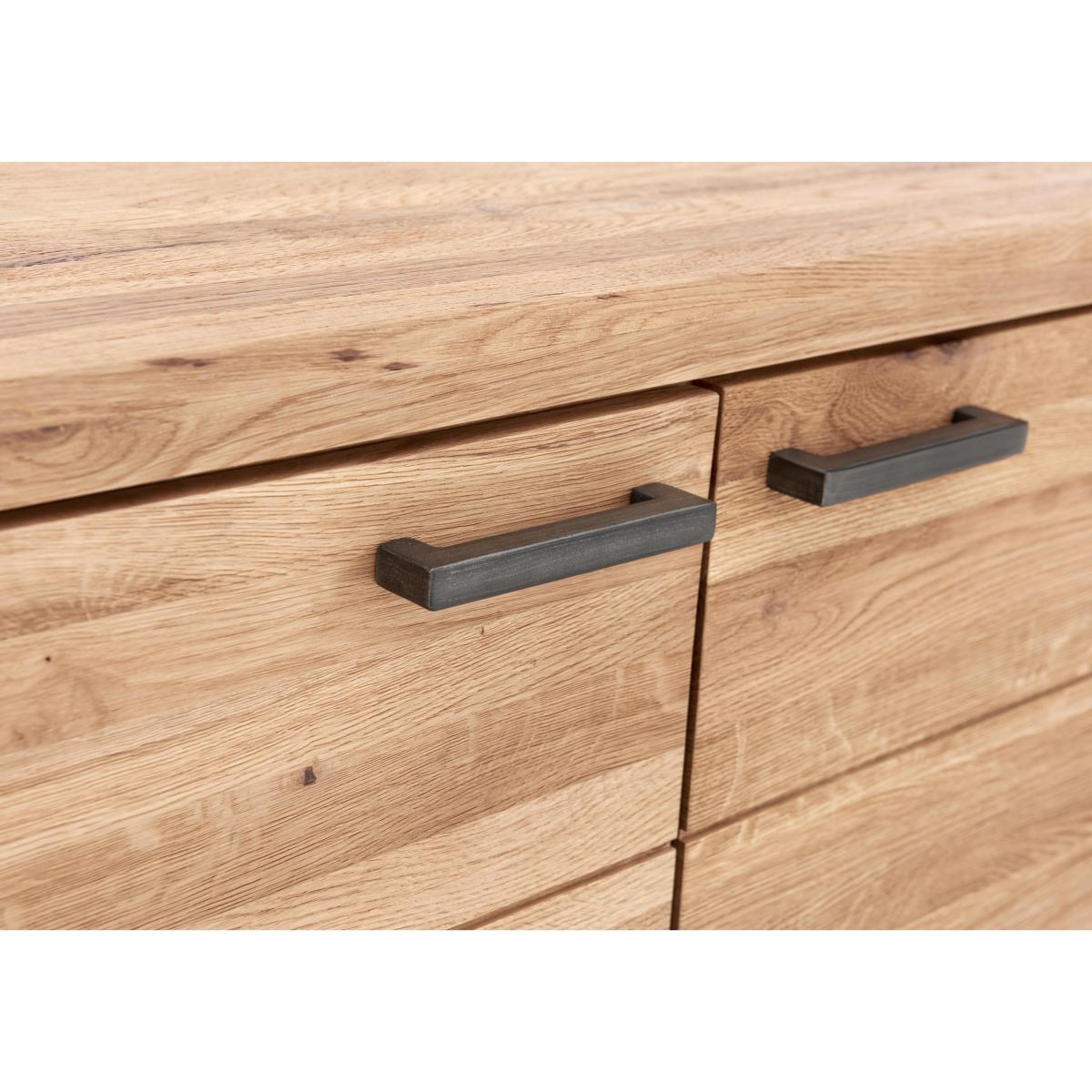 Modern, versatile and excellent value, Earth combines solid oak and oak veneer surfaces with powder-coated steel legs in a collection of beautifully-crafted industrial-style furniture. Dining tables are available in two sizes and optional extension leaves create a huge range of size possibilities. Choose either an upholstered retro-style dining chair or practical bench seating – or mix and match the two for a comfortable and contemporary look. Complete your dining room with a choice of sideboards and continue this on trend theme in the living room with useful shelving and stylish occasional pieces. The Earth large sideboard combines modern industrial style with exceptional craftsmanship – at an amazing value price. Crafted from solid oak and oak veneer, this sideboard features one double door cupboard and one single door cupboard. Each cupboard has a single shelf. Doors have a striking planked appearance and are finished with liner metal handles. Set on bold U-shaped powder-coated grey steel legs, this piece offers roomy dining room storage that’s so stylish. The Earth large sideboard is part of the Earth collection of living and dining room furniture. Choose from two sizes of dining table – both can be extended at either end by the addition of the optional Earth dining table extension leaf. Coordinating living room pieces include spacious and practical shelving units and a selection of occasional tables. The Earth lamp table shares the same bold and stylish aesthetic. Did you know?. Because oak is natural with characterful knots and markings, every Earth sideboardis unique.