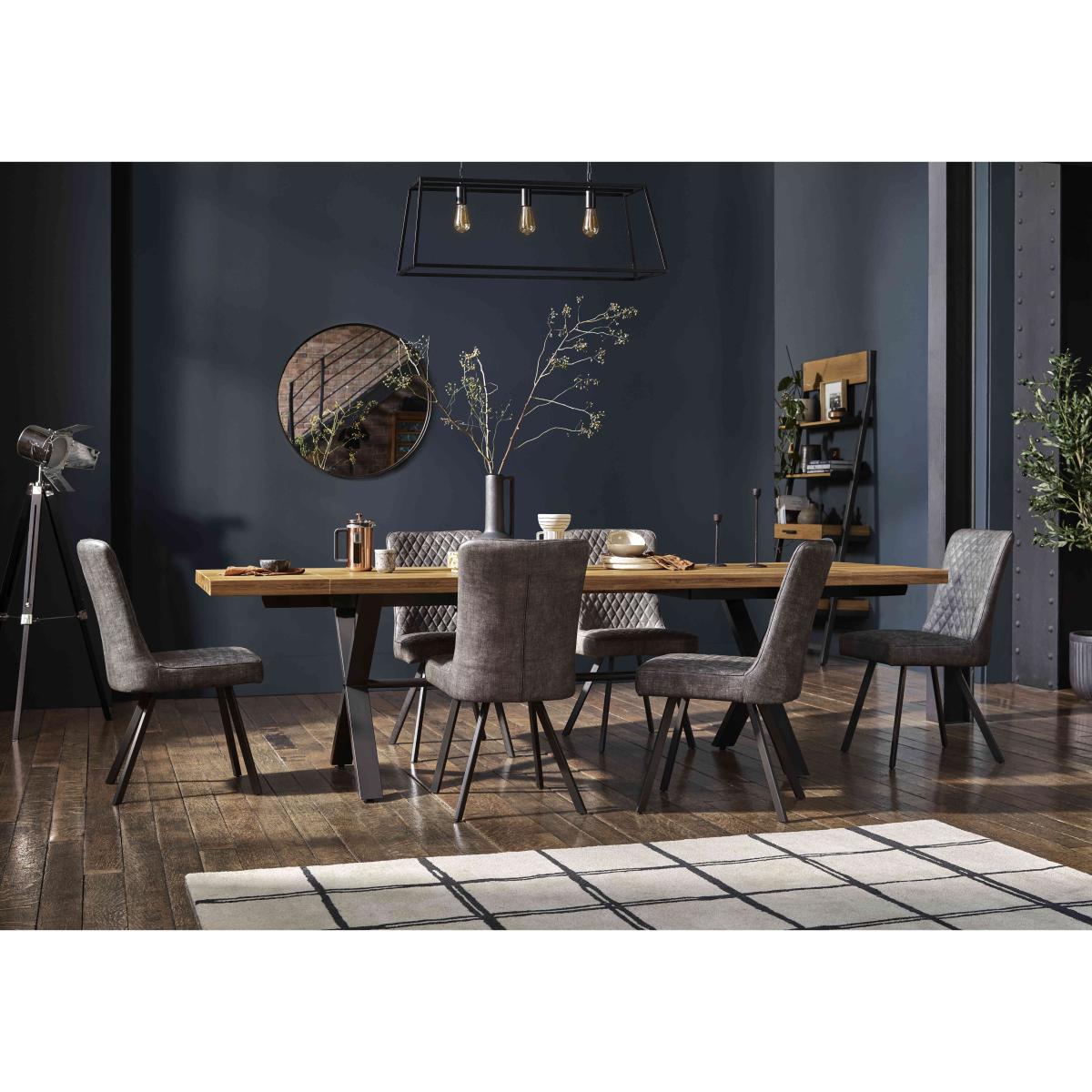 Modern, versatile and excellent value, Earth combines solid oak and oak veneer surfaces with powder-coated steel legs in a collection of beautifully-crafted industrial-style furniture. Dining tables are available in two sizes and optional extension leaves create a huge range of size possibilities. Choose either an upholstered retro-style dining chair or practical bench seating – or mix and match the two for a comfortable and contemporary look. Complete your dining room with a choice of sideboards and continue this on trend theme in the living room with useful shelving and stylish occasional pieces. The solid oak and powder-coated metal dining table in this dining set makes a striking centrepiece in any stylish dining room. This dining set includes six dining chairs. Why you'll love it Cool industrial style at a great-value price. With a solid natural oak top, the table in this dining set is one of a kind. Rustic wire-brushed and oiled finish. Metal X-shaped legs have a grey powder-coated finish. This dining table can be extended. Extension leaves are available separately. This dining set includes 6 dining chairs. Soft faux leather upholstery with quilted-effect stitching. Black metal legs. This dining set is part of the Earth range. What you need to know Dining chairs have metal frames and legs, and foam seat cushioning. Dining table is made of solid oak and metal. Large 190 cm dining table seats 8. Table can accommodate 2 extension leaves, available separately, to seat 4 more. Every piece of natural wood has unique marks, knots and colour variation. It is normal for knots to be filled. Avoid placing in direct sunlight or close to a heat source. We recommend using coasters and placemats at all times. Use a clean, damp cloth to clean the oak top. Apply wax periodically to protect the surface.