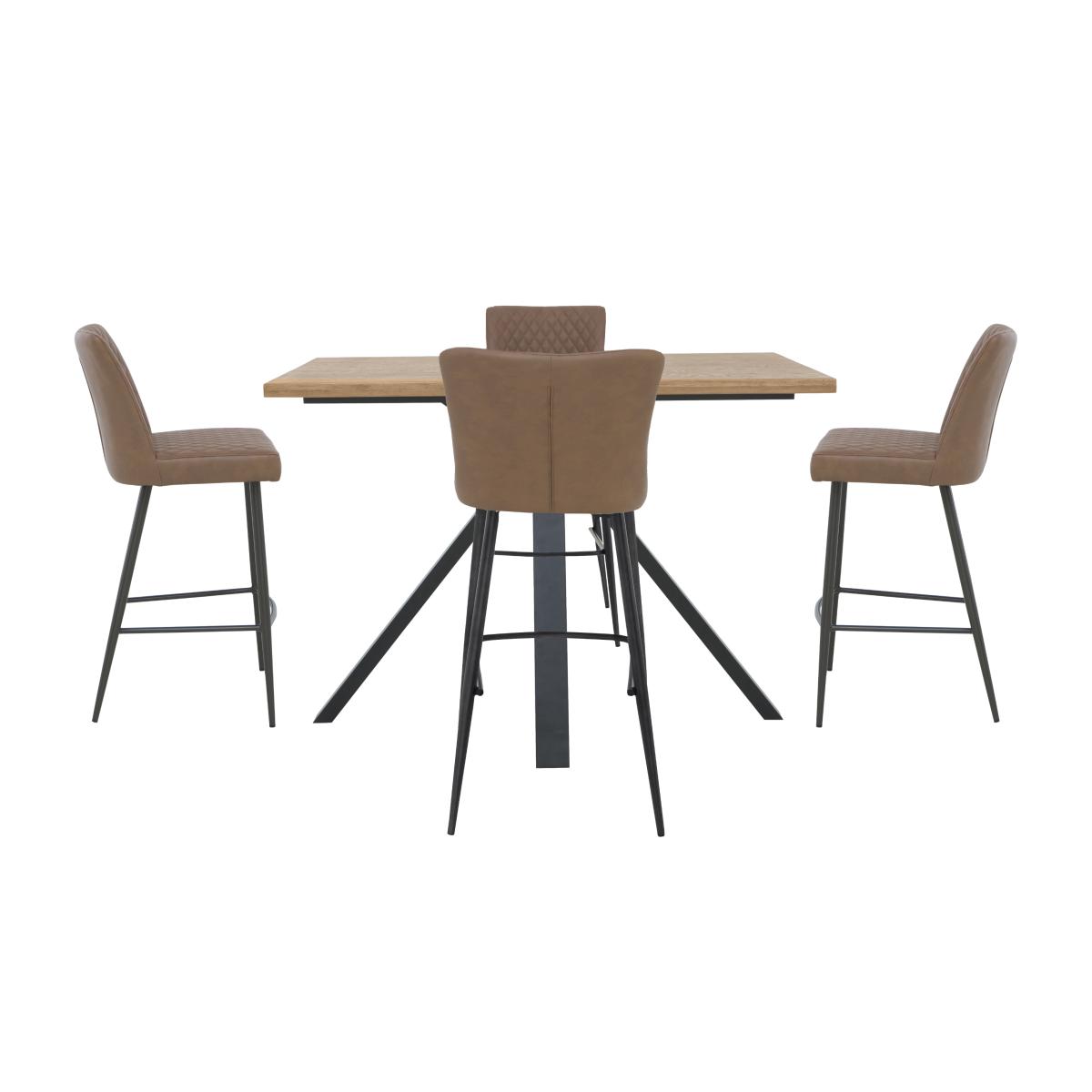 Modern, versatile and excellent value, Earth combines solid oak and oak veneer surfaces with powder-coated steel legs in a collection of beautifully-crafted industrial-style furniture. Dining tables are available in two sizes and optional extension leaves create a huge range of size possibilities. Choose either an upholstered retro-style dining chair or practical bench seating – or mix and match the two for a comfortable and contemporary look. Complete your dining room with a choice of sideboards and continue this on trend theme in the living room with useful shelving and stylish occasional pieces. Dine in on-trend industrial style – even if your dining room is your kitchen. This stunning bar table dining set comprises a rustic oak-topped bar table and four eye-catching bar stools. Why you'll love it Cool industrial style at a great-value price. Make the most of a smaller dining space. With a solid natural oak top, this large bar table is one of a kind. Rustic wire-brushed and oiled finish. Metal star-shaped base with a grey powder-coated finish. This bar table dining set comes with 4 stylish bar stools. Supportive back and footrest ensure the diner’s comfort. Soft faux leather upholstery in a choice of colours. Quilted-effect stitching accentuates the well-cushioned seats. Black metal legs. This bar table dining set is part of our Earth range. What you need to know Bar stools have metal frames and legs, and foam seat cushioning. Bar table is made of solid oak and metal. This 130 cm bar table seats 6. Every piece of natural wood has unique marks, knots and colour variation. It is normal for knots to be filled. Avoid placing in direct sunlight or close to a heat source. We recommend using coasters and placemats at all times. Use a clean, damp cloth to clean the oak top. Apply wax periodically to protect the surface.