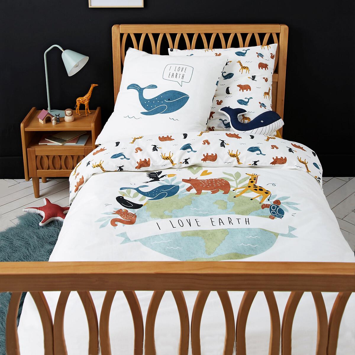 Sing a song for our beautiful planet by celebrating with your favourite creatures!Cotton is part of our daily lives. We love it for its suppleness and softness. Easy Care, it is ideal for the beds of young and old alike!Product Details • 100% cotton • Organic cotton • 144 thread count • Planet earth and animals printed on the front, mini prints on the back • Envelope-style opening. Care Advice • Machine washable at 60°C • By washing your laundry at 40°C instead of 60°C, you limit energy consumption. Dimensions • 140 x 150cm: Adjustable bed • 140 x 200cm: Single • Cotton from organic farming. Organic farming does not use any chemicals, pesticides, insecticides or GMOs. Produced with minimal impact on biodiversity. • OEKO-TEX® Standard 100. Standard 100 certification by OEKO-TEX® tests textile products for harmful substances via an independent, international label.