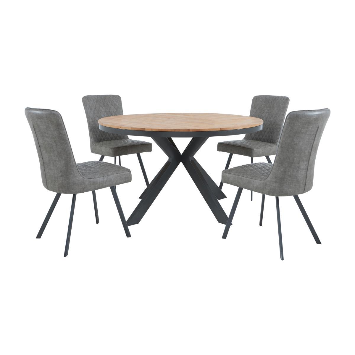 Modern, versatile and excellent value, Earth combines solid oak and oak veneer surfaces with powder-coated steel legs in a collection of beautifully-crafted industrial-style furniture. Dining tables are available in two sizes and optional extension leaves create a huge range of size possibilities. Choose either an upholstered retro-style dining chair or practical bench seating – or mix and match the two for a comfortable and contemporary look. Complete your dining room with a choice of sideboards and continue this on trend theme in the living room with useful shelving and stylish occasional pieces. This industrial-style dining set delivers one sophisticated twist in that splayed-leg pedestal base – and then another in the coordinating faux leather dining chairs. For us, it’s the perfect mix of luxury finish and urban style. Why you'll love it. Fantastic-value round dining table set is the perfect size for modern homes. Cool and characterful industrial style. Dining table has a solid oak top. Striking splayed-leg pedestal base in grey powder-coated steel. With 4 Earth dining chairs upholstered in soft faux leather. Choice of upholstery colour. Chairs have black metal legs and quilted-effect stitching. Crafted from real oak, every Earth dining set is unique. What you need to know. Table is 130 cm diameter and seats 6. Dining chair seat cushioning is made of foam. As oak is a natural material, knots and markings are to be expected. Avoid placing in direct sunlight, and take care to use coasters and placemats. Part of the well-crafted Earth furniture collection.