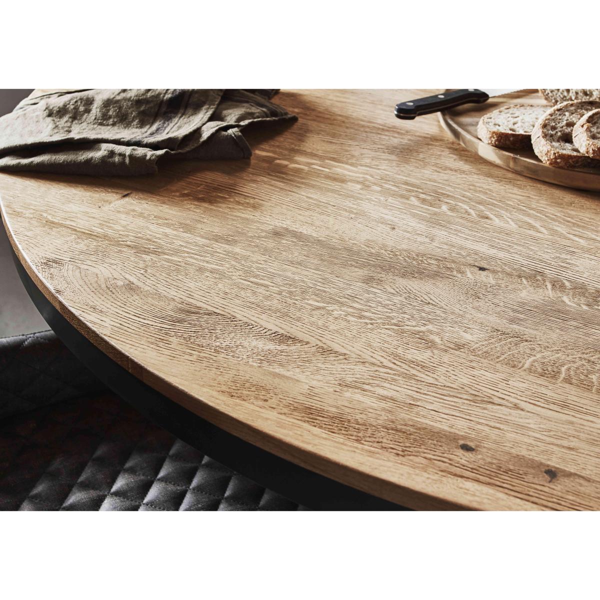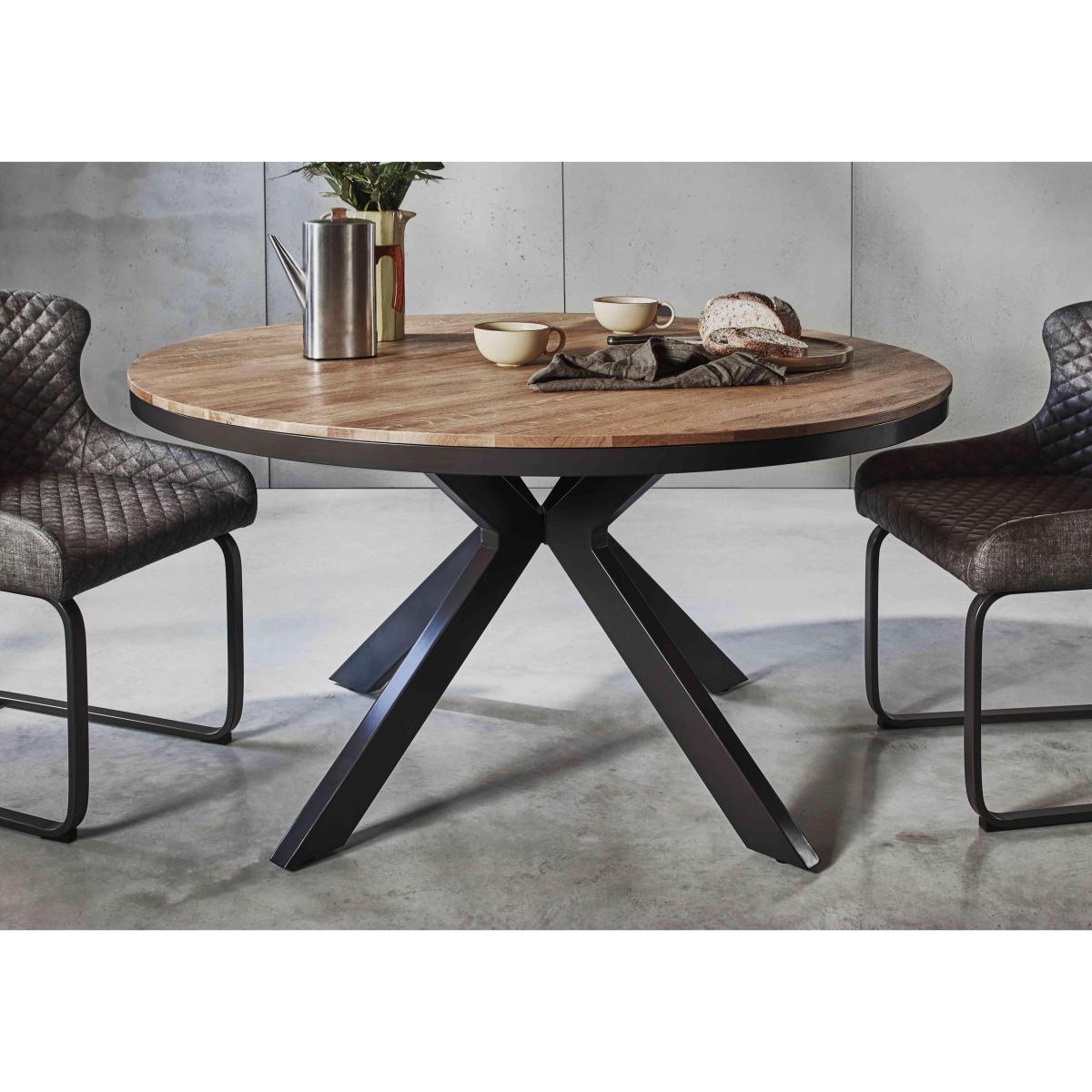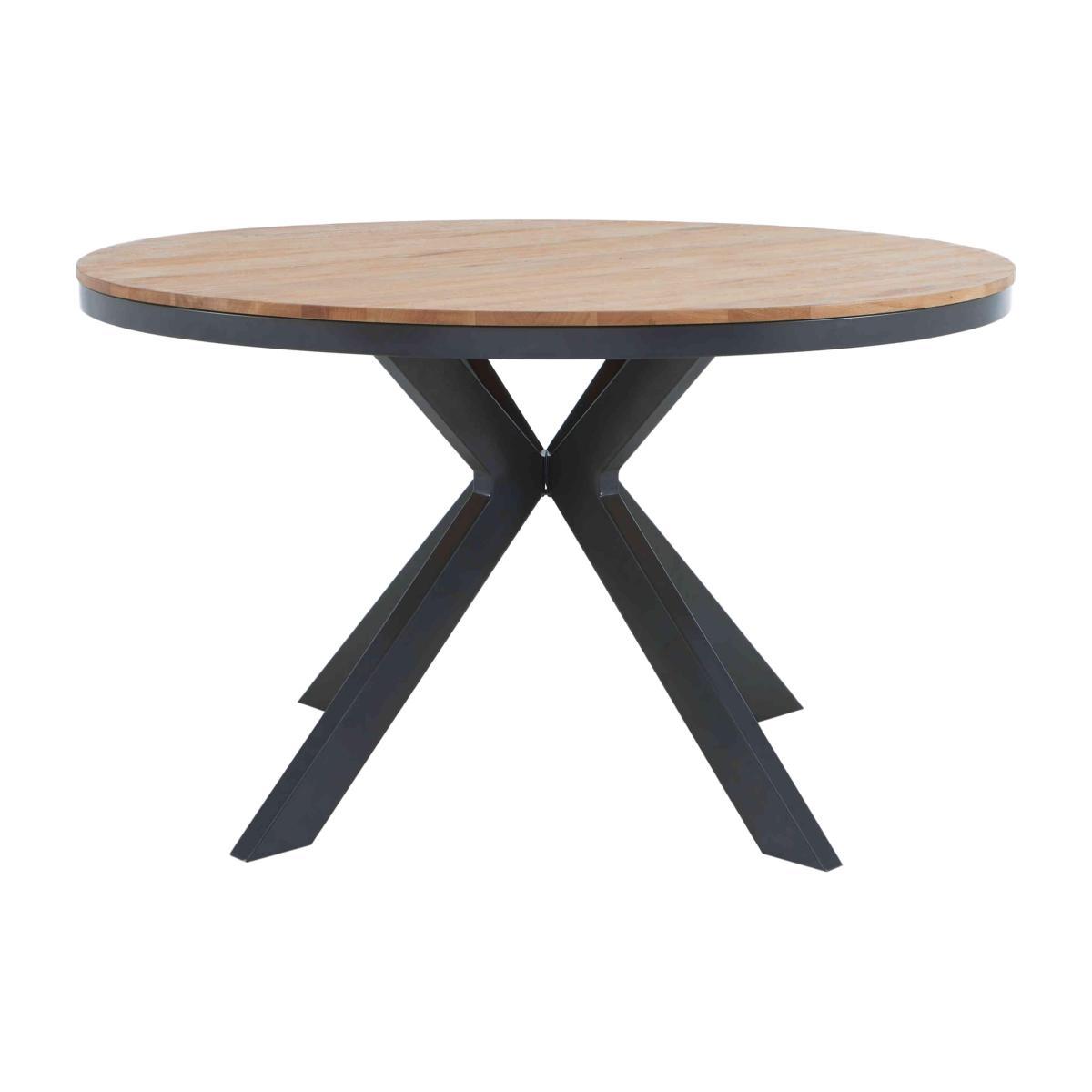 Modern, versatile and excellent value, Earth combines solid oak and oak veneer surfaces with powder-coated steel legs in a collection of beautifully-crafted industrial-style furniture. Dining tables are available in two sizes and optional extension leaves create a huge range of size possibilities. Choose either an upholstered retro-style dining chair or practical bench seating – or mix and match the two for a comfortable and contemporary look. Complete your dining room with a choice of sideboards and continue this on trend theme in the living room with useful shelving and stylish occasional pieces. This cool industrial style round dining table ticks all the boxes for style, value and functionality. Perfect for a smaller dining room or kitchen, it’s made of solid oak and powder-coated steel. Why you'll love it. Fantastic-value round dining table is the perfect size for modern homes. Cool and characterful industrial style. Solid oak top. Striking splayed-leg pedestal base is designed for dining comfort. Base is made of grey powder-coated steel. Crafted from real oak, every Earth dining set is unique. What you need to know. Table is 130 cm diameter and seats 6. As oak is a natural material, knots and markings are to be expected. Avoid placing in direct sunlight, and take care to use coasters and placemats. Part of the well-crafted Earth furniture collection.