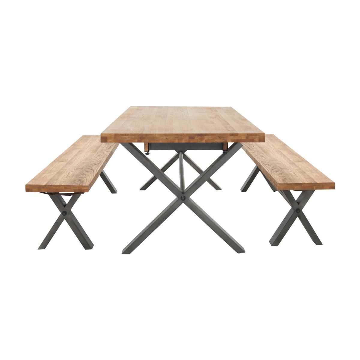 Modern, versatile and excellent value, Earth combines solid oak and oak veneer surfaces with powder-coated steel legs in a collection of beautifully-crafted industrial-style furniture. Dining tables are available in two sizes and optional extension leaves create a huge range of size possibilities. Choose either an upholstered retro-style dining chair or practical bench seating – or mix and match the two for a comfortable and contemporary look. Complete your dining room with a choice of sideboards and continue this on trend theme in the living room with useful shelving and stylish occasional pieces. Practicality meets fabulous industrial style in this well-designed dining set. Dining benches allow you to seat more people in less space, and the dining table is the perfect size for a modern kitchen diner. Why you'll love it. Fantastic-value dining set is the perfect size for modern homes. Cool and characterful industrial style. Solid oak top. Grey powder-coated steel X-shaped legs. With 2 Earth dining benches. Dining benches have solid oak seats and X-shaped metal legs. Each bench comfortably seats 2 adults or 3 children. Crafted from real oak, every Earth dining set is unique. What you need to know. 150 cm long, seats 6. As oak is a natural material, knots and markings are to be expected. Avoid placing in direct sunlight, and take care to use coasters and placemats. The Earth dining table extension leaf, available separately, extends the table by 50 cm. Part of the well-crafted Earth range of dining sets and storage furniture.