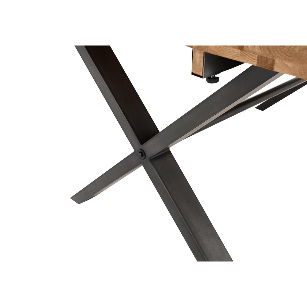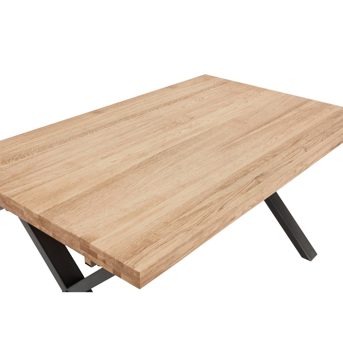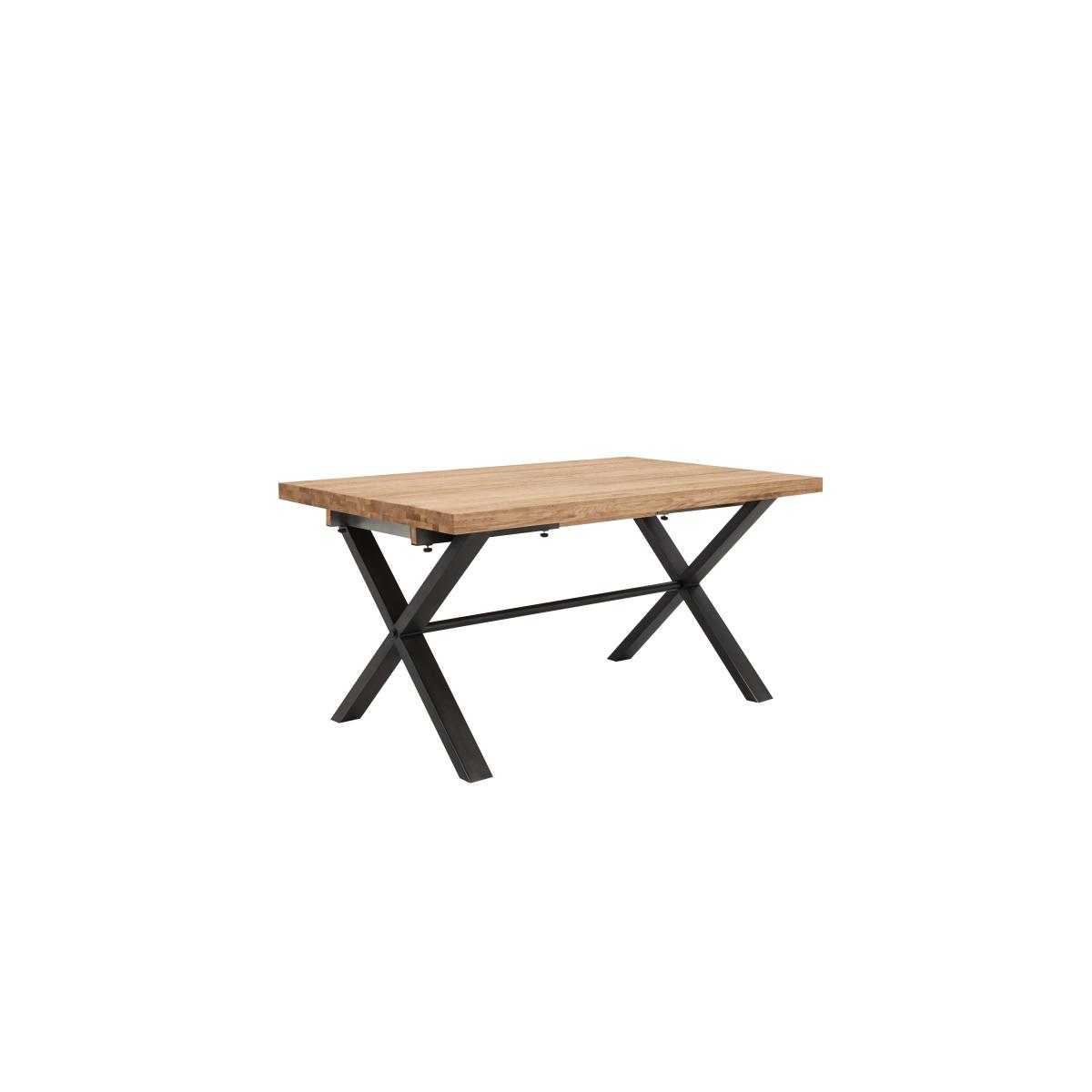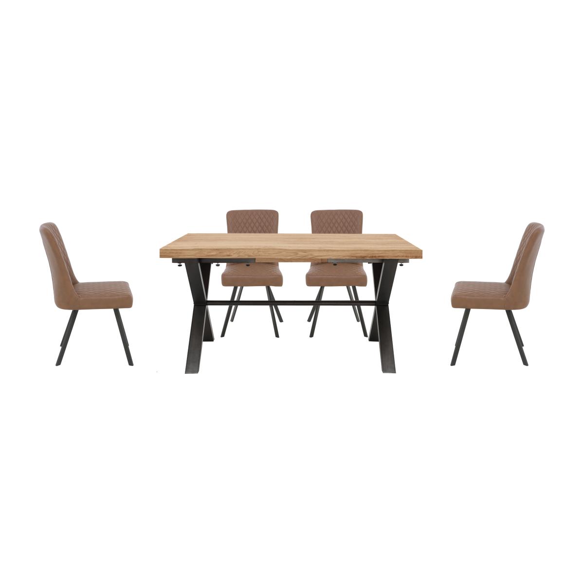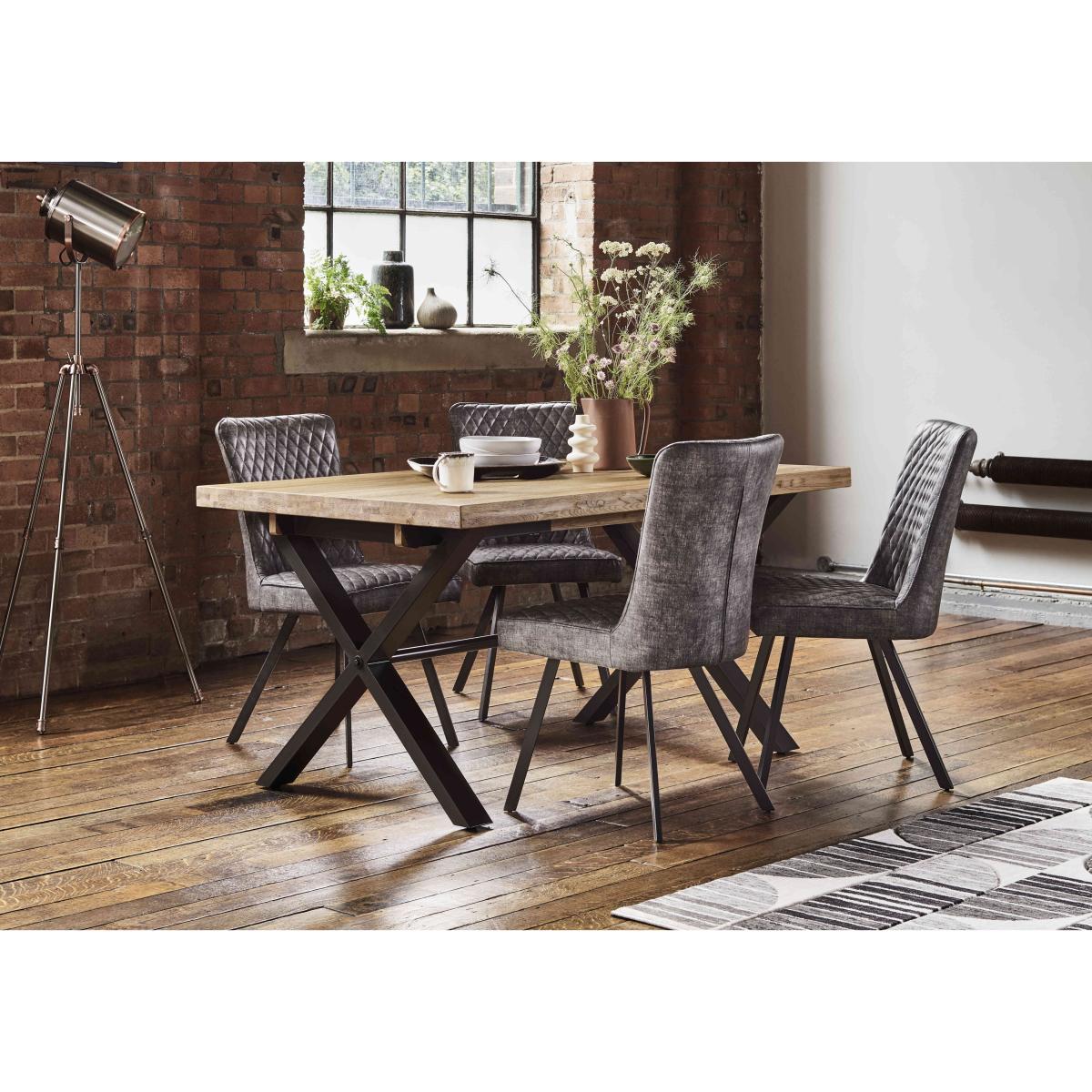 Modern, versatile and excellent value, Earth combines solid oak and oak veneer surfaces with powder-coated steel legs in a collection of beautifully-crafted industrial-style furniture. Dining tables are available in two sizes and optional extension leaves create a huge range of size possibilities. Choose either an upholstered retro-style dining chair or practical bench seating – or mix and match the two for a comfortable and contemporary look. Complete your dining room with a choice of sideboards and continue this on trend theme in the living room with useful shelving and stylish occasional pieces. Beautifully crafted with a solid rustic oak top, the dining table in this dining set is perfect for your industrial-style dining area. With four dining chairs. Why you'll love it Cool industrial style at a great-value price. With a solid natural oak top, the table in this dining set is one of a kind. Rustic wire-brushed and oiled finish. Metal X-shaped legs have a grey powder-coated finish. This dining table can be extended. Extension leaves are available separately. This dining set includes 4 dining chairs. Soft faux leather upholstery with quilted-effect stitching. Black metal legs. This dining set is part of the Earth range. What you need to know Dining chairs have metal frames and legs, and foam seat cushioning. Dining table is made of solid oak and metal. Small 150 cm dining table seats 6. Table can accommodate 2 extension leaves, available separately, to seat 4 more. Every piece of natural wood has unique marks, knots and colour variation. It is normal for knots to be filled. Avoid placing in direct sunlight or close to a heat source. We recommend using coasters and placemats at all times. Use a clean, damp cloth to clean the oak top. Apply wax periodically to protect the surface.