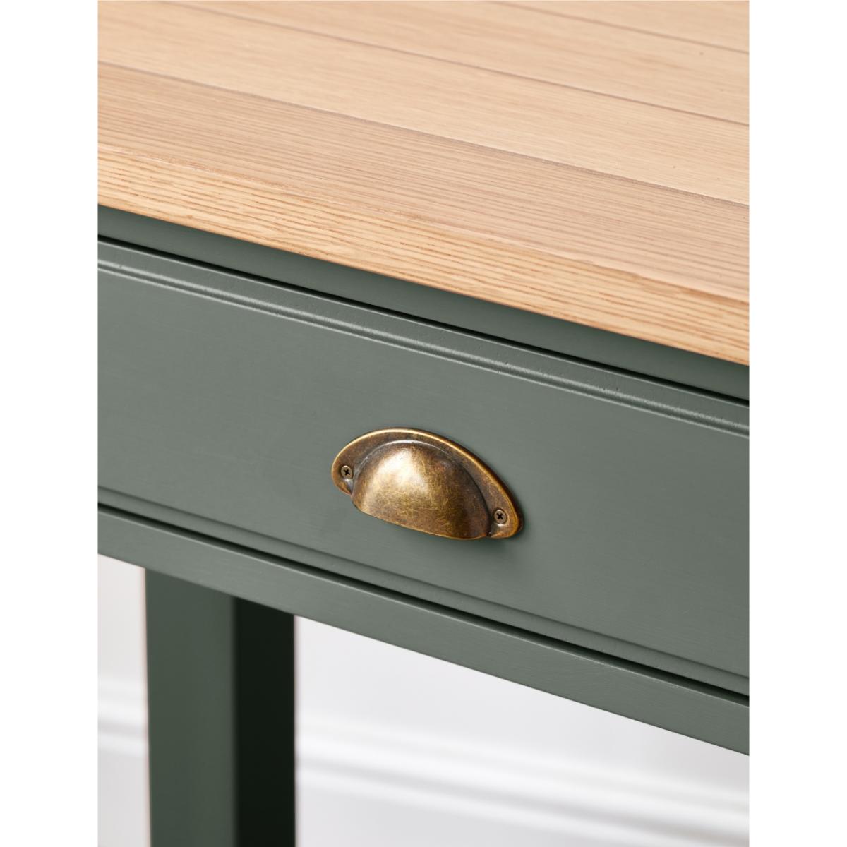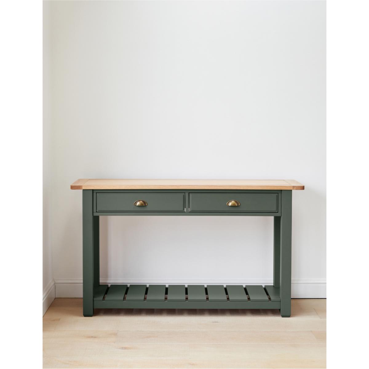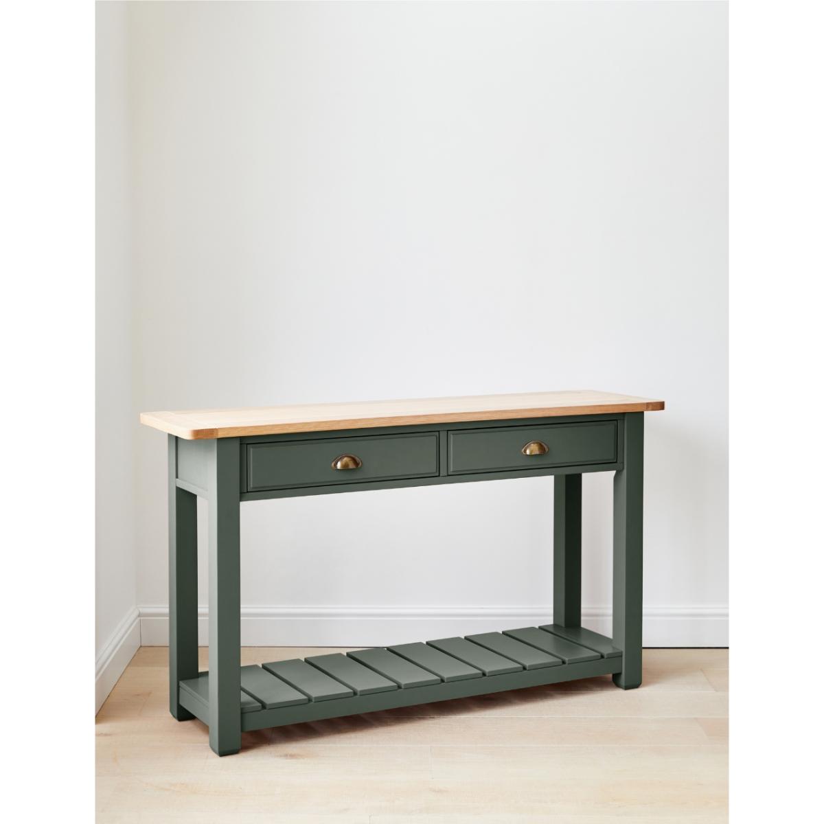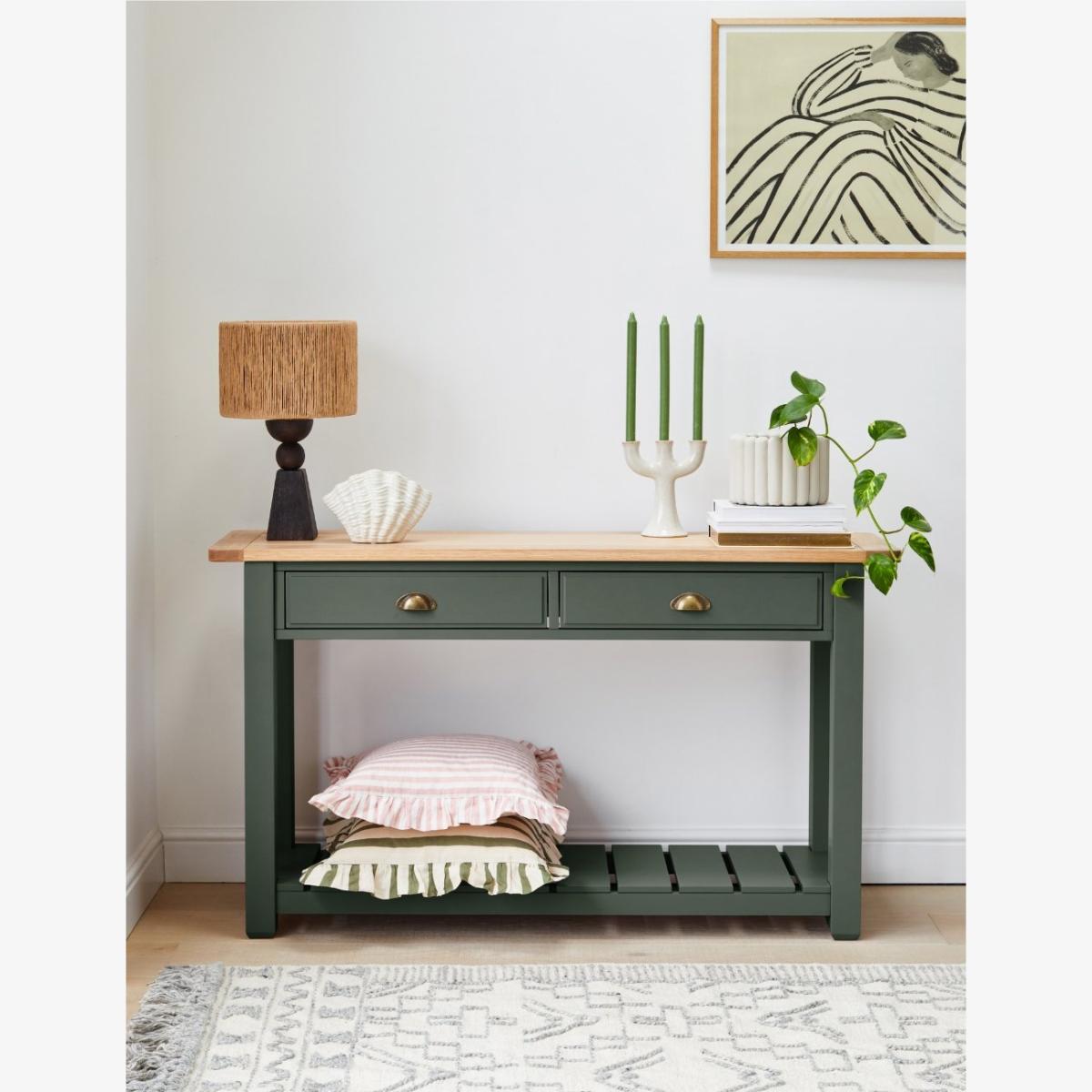 Keep your home organised and clutter-free with our Earthy Green Oak Console Table with Drawers. This beautiful console table has two drawers and a low shelf, making it a perfect storage solution for any corner of your home. Crafted with expertise, our console table is hand-painted with a textured finish that adds a touch of modernity to its country-style design. The sleek silhouette and earthy green tones contrast beautifully against the wooden open shelving unit to create a timeless and harmonious piece of furniture. It's the perfect addition to any room in your home, bringing style and functionality to your interior space.