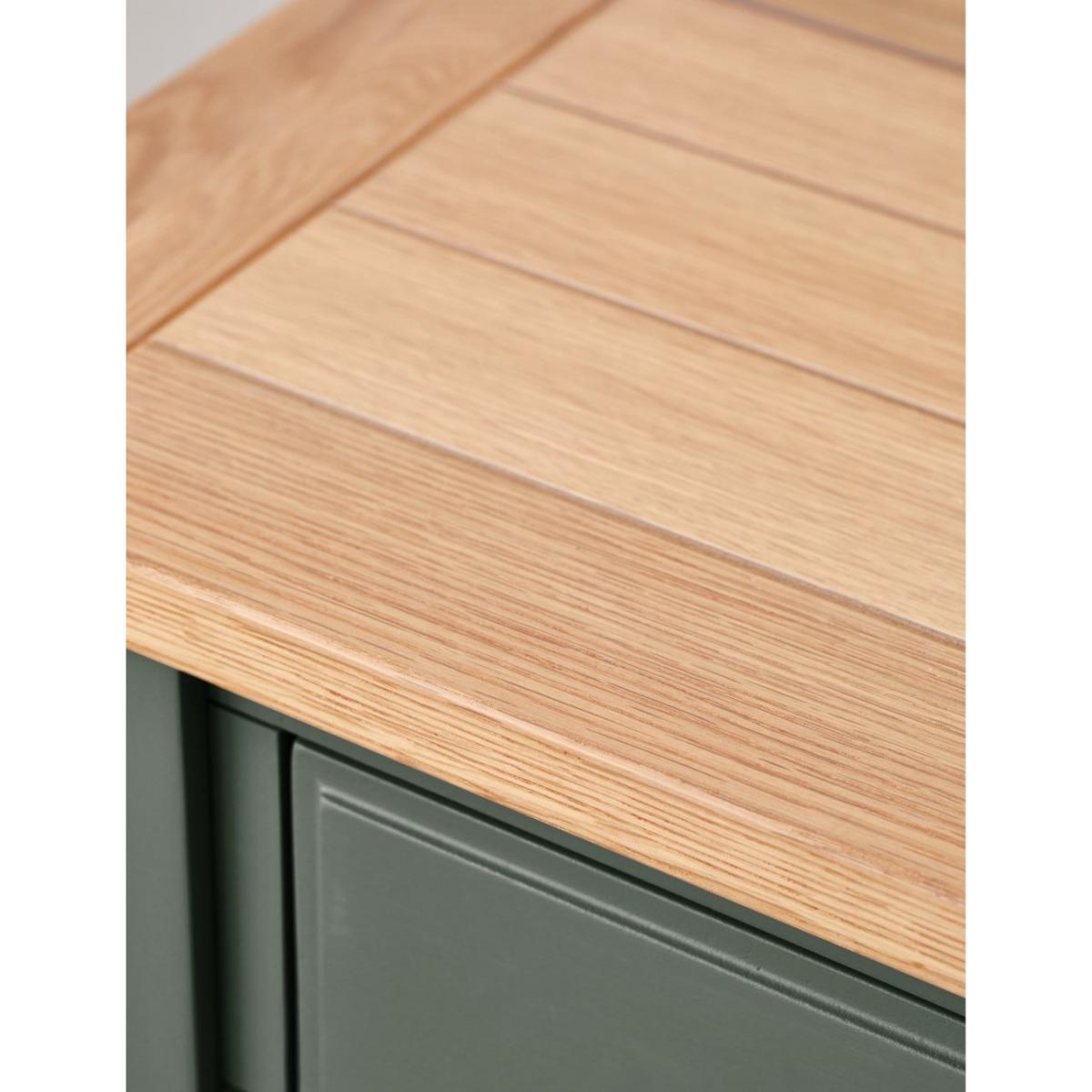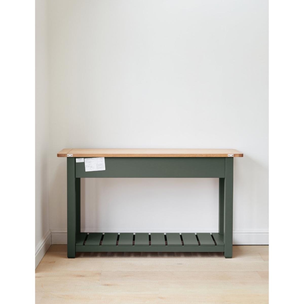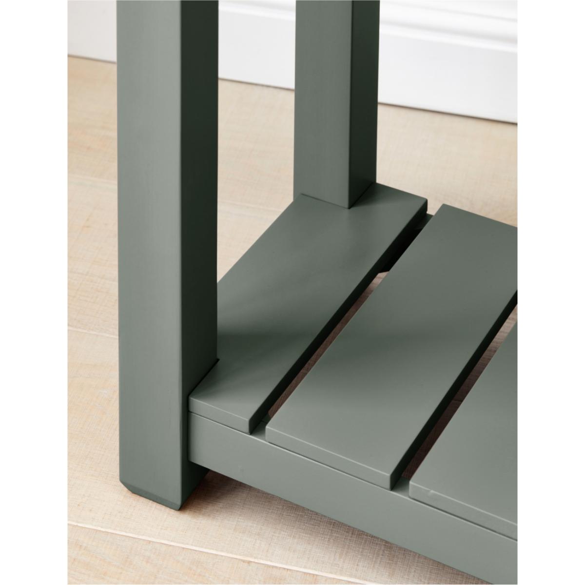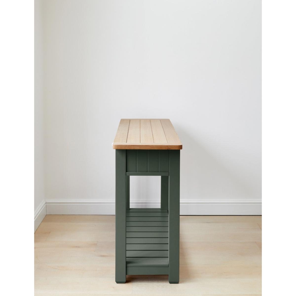 Keep your home organised and clutter-free with our Earthy Green Oak Console Table with Drawers. This beautiful console table has two drawers and a low shelf, making it a perfect storage solution for any corner of your home. Crafted with expertise, our console table is hand-painted with a textured finish that adds a touch of modernity to its country-style design. The sleek silhouette and earthy green tones contrast beautifully against the wooden open shelving unit to create a timeless and harmonious piece of furniture. It's the perfect addition to any room in your home, bringing style and functionality to your interior space.