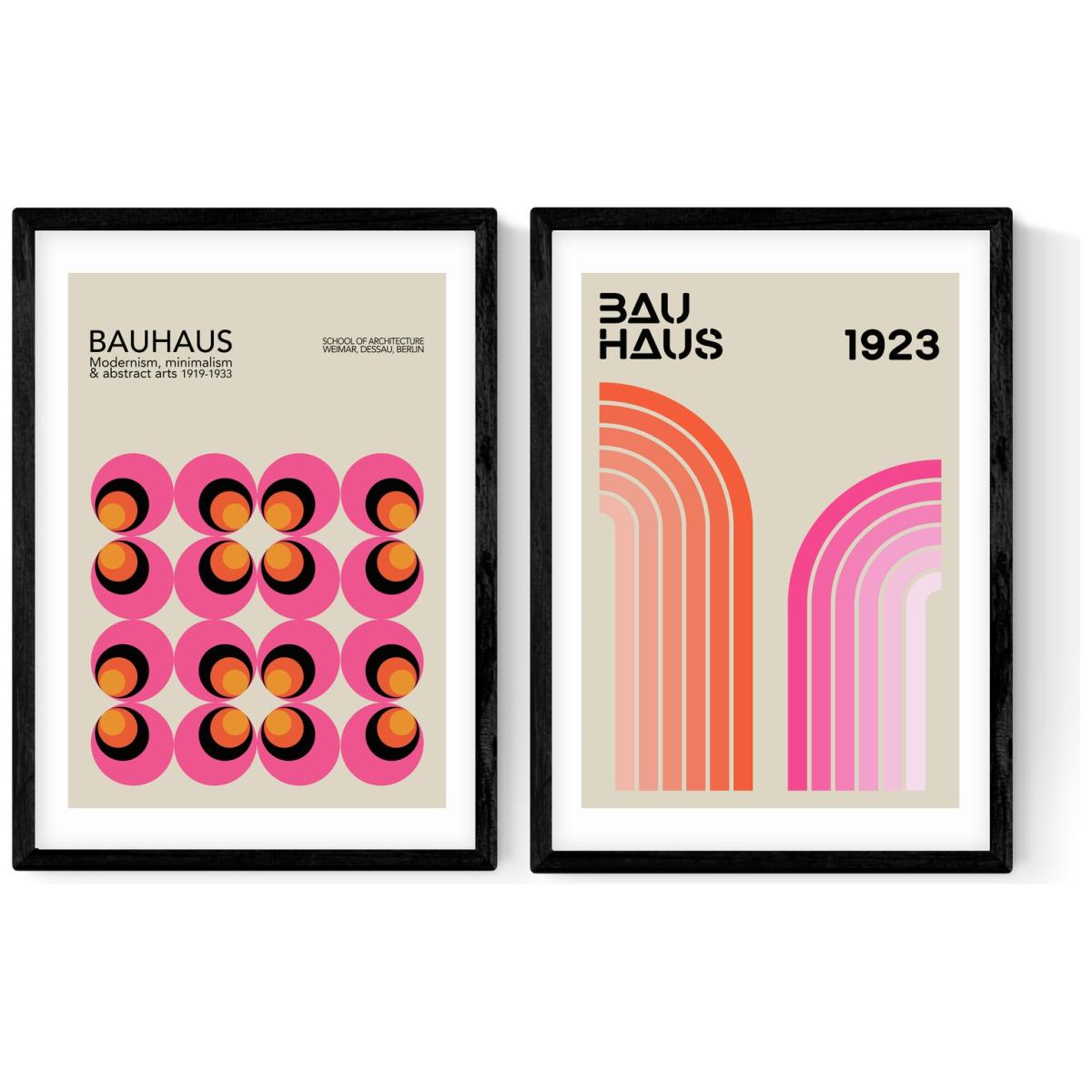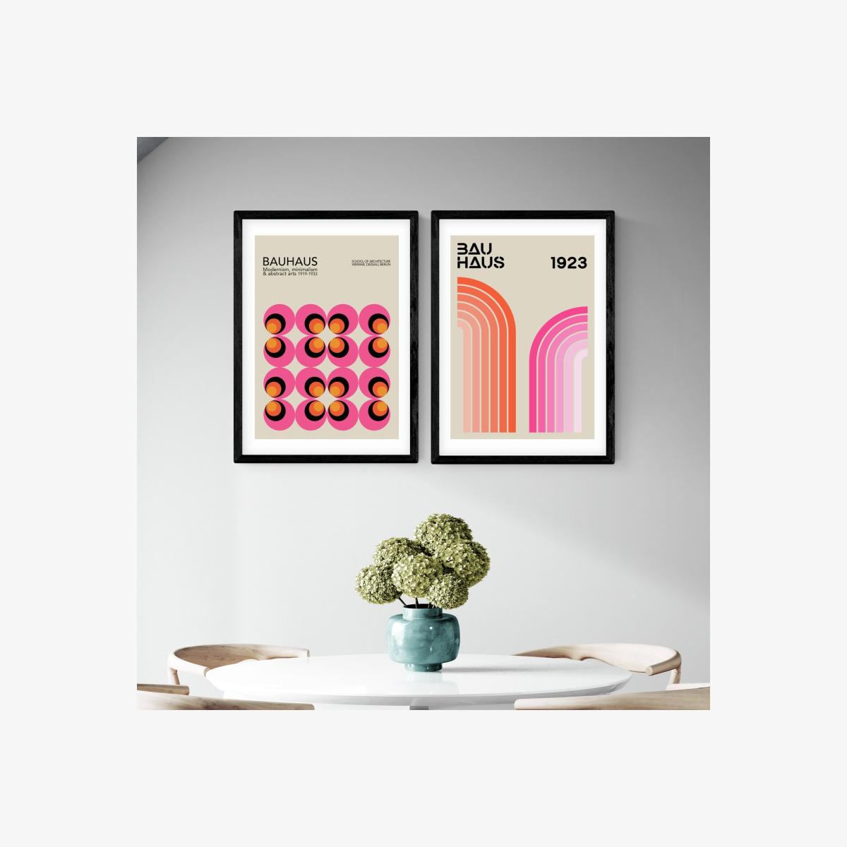 I love this set for its bold, graphic appeal and retro vibe, making it a versatile piece for a variety of interiors. The monochrome frames give it a sleek, contemporary edge that works particularly well in minimalist or modern spaces, but it can also provide a striking contrast in mid-century or eclectic settings. Practical styling tips include pairing the twin set with neutral or monochrome décors to really let the artwork stand out, or incorporating colour accents that echo the pinks and oranges within the prints. Placing it above a sideboard, console table, or even a bed headboard creates a focal point, and the size A3 makes it suitable for smaller walls without overwhelming the space. Overall, a smart choice for adding a touch of Bauhaus-inspired sophistication.