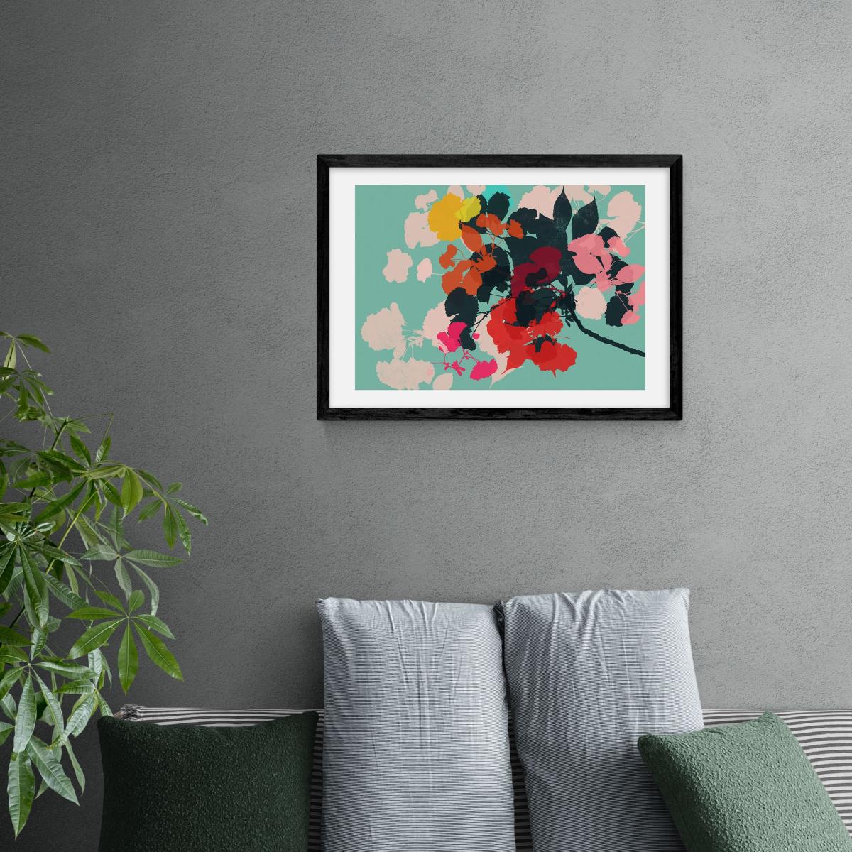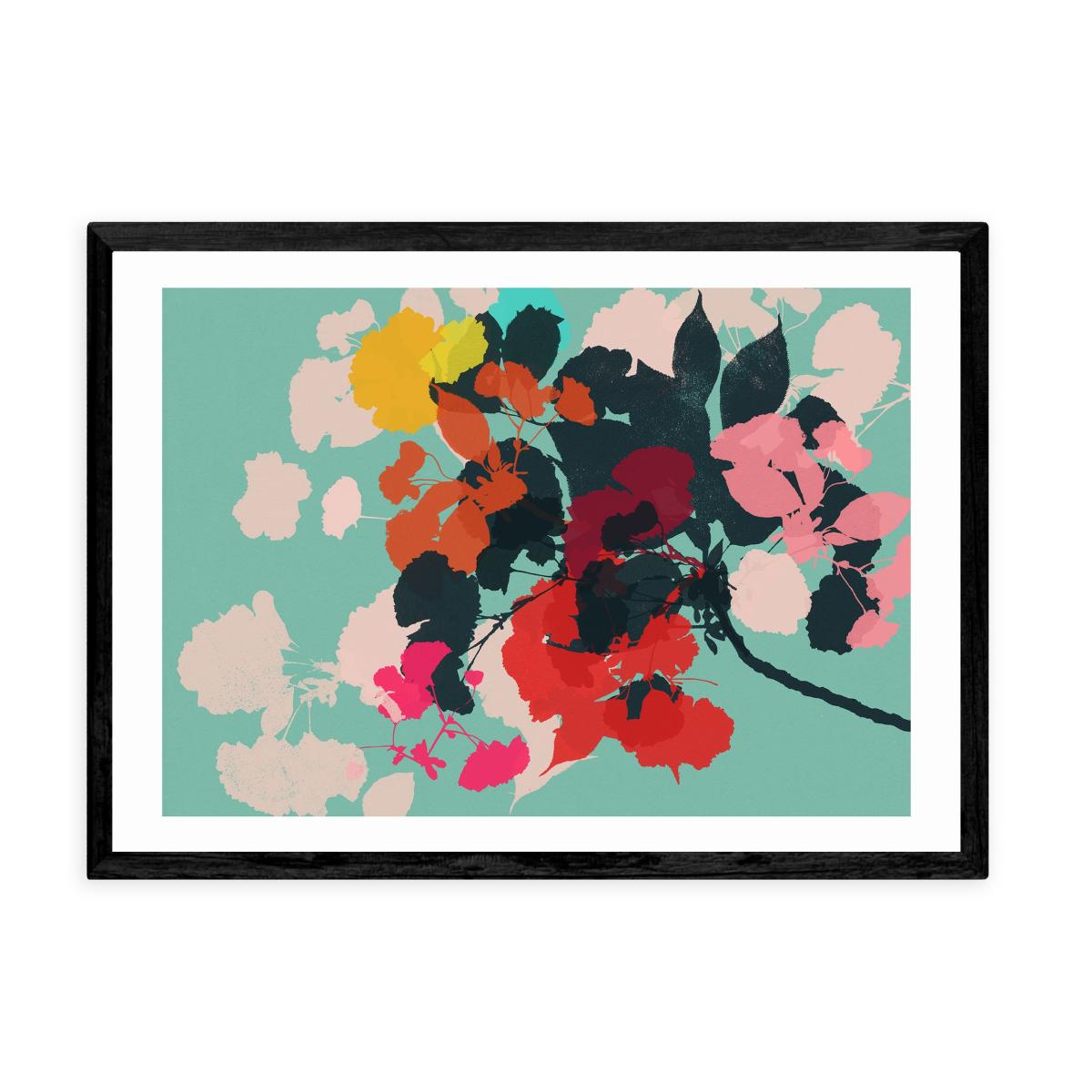 Refresh your living space with this floral themed print featuring a teal background and colourful vivid shapes. Made using a Giclee printing process to prevent fading, this wonderful print will stay vibrant for years to come. Each design is available in four print sizes and a variety of frame options, including unframed, so you can display your artwork however you wish.