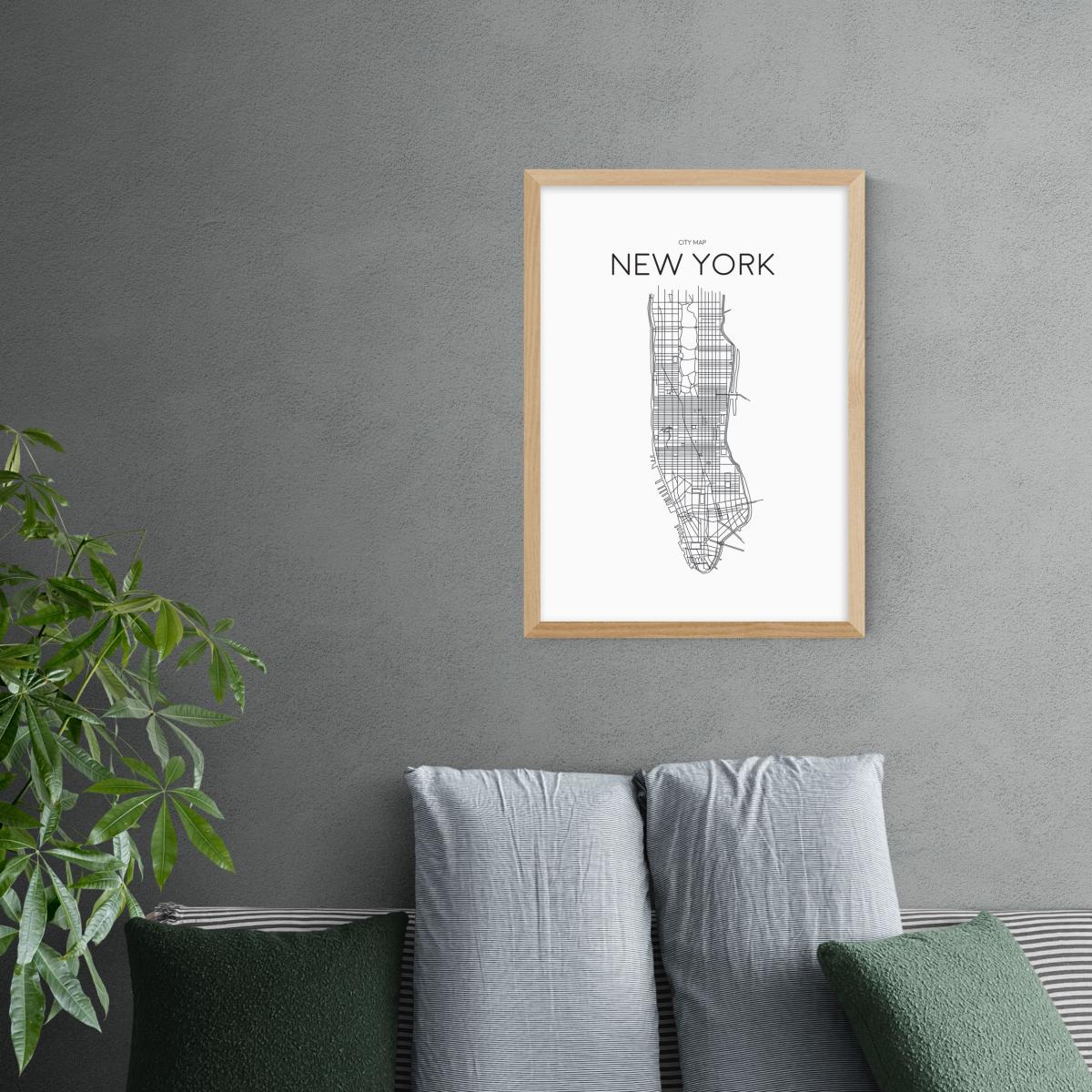 I love this city map print for its clean, modern aesthetic and monochrome palette, making it a versatile piece that can suit a range of interiors. It works particularly well in minimalist or contemporary spaces, adding an urban touch without overwhelming the surroundings. For styling, try pairing it with neutral tones or black accents to keep the look cohesive. It also makes a great feature above a sofa or in a gallery wall arrangement, where its graphic simplicity can stand out. To keep it fresh, consider framing it with a simple matte black or light wood frame to complement different décors, and place it where it can be appreciated without clutter nearby.