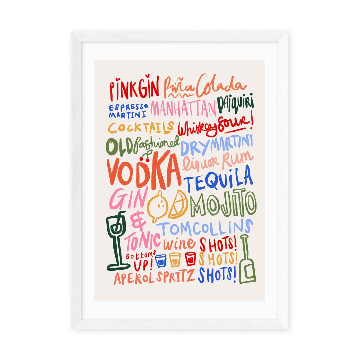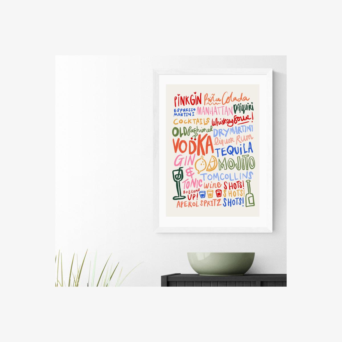 * Colourful typography design * Perfect for kitchens or entertaining spaces * Printed on 210gsm acid-free archival paper * Available in A1, A2, A3 & A4 size * Frame options: black, white and oak wood effect * Available in unframed option This bright and colourful print celebrates cocktails of all varieties in vibrant typography, and is fade-resistant to withstand the test of time. Available in a choice of sizes, framed or unframed, it's truly adaptable to best suit your walls, and would be a great addition to a kitchen or entertaining space.