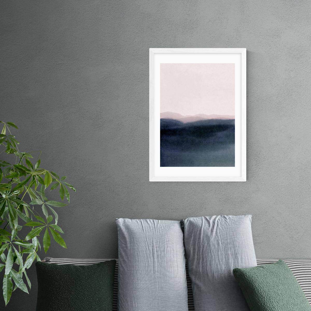 Bring an element of zen and relaxation to your space with this calming landscape scene with subtle dusty pink and dark tones. Perfect for bringing tranquillity and serenity to your space, this print is made to last as it uses a Giclee printing process to stay vibrant and prevent fading over years. Each design is available in four print sizes and a variety of frame options, including unframed, so you can display your artwork however you wish.