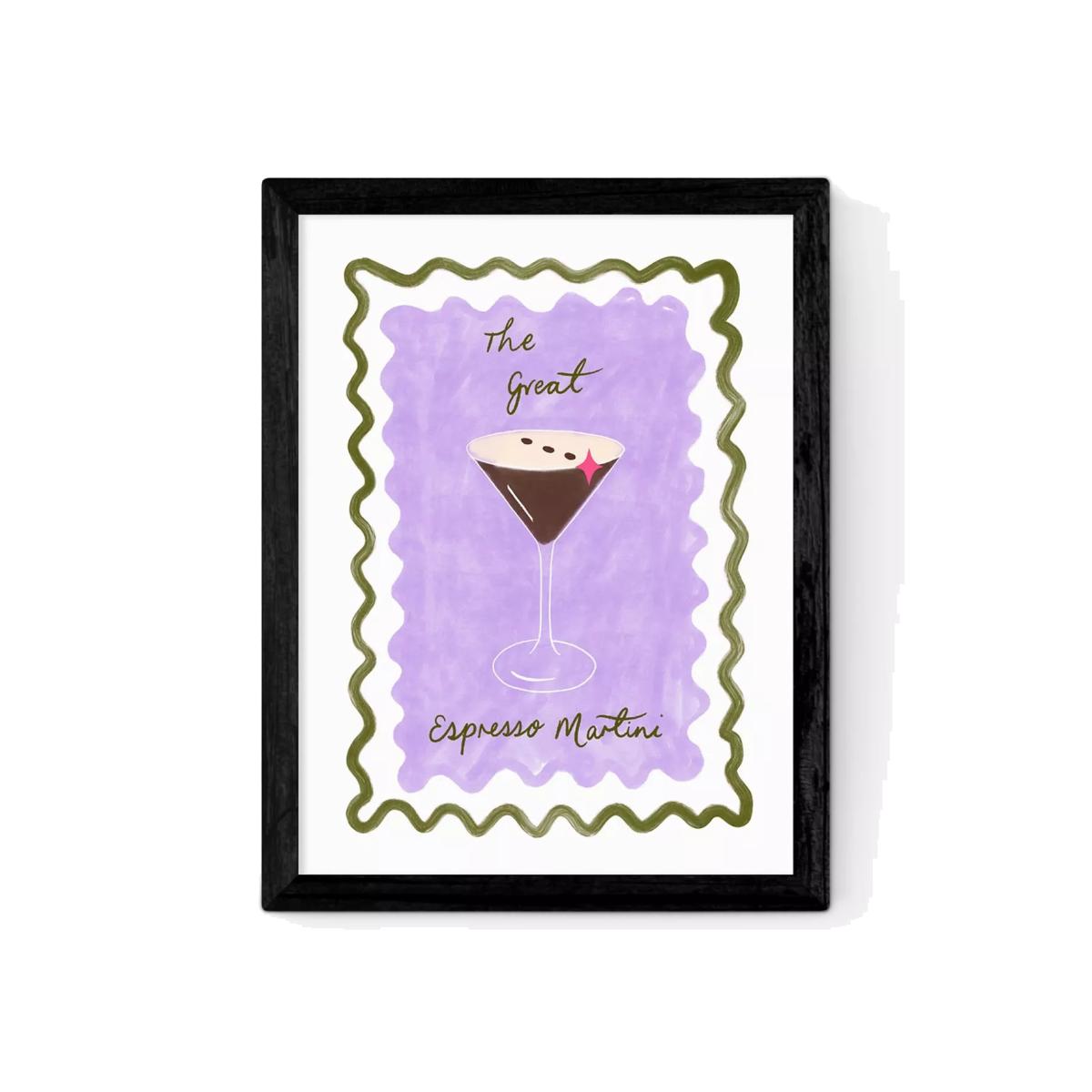 Drink up this colourful print from Emmy Lupin Studio for EAST END PRINTS with the slogan 'The Great Espresso Martini'. The giclée art printing process and 210gsm acid-free archival paper create an exhibition-quality art print with long-lasting colours that more closely resemble the artist's materials and tones. A digital form of the original work is stored and then printed using a commercial printer and pigment-based inks. Made in the UK, the print is presented with an acrylic glaze that's optically the same as glass yet lighter in weight making it easier and safer to hang. Ready to hang on your wall, it's framed in obeche wood in a choice of finishes. Have you thought about wall hooks and fittings? EAST END PRINTS picture frames are usually one of two frame widths: medium frame (2.2cm) and wide frame (3.5cm). The frame width varies across the range. The medium frame measures 2.2cm across and comes in the following four sizes: 33.4 x 28.4cm 43.4 x 33.4cm 53.4 x 43.4cm 83.4 x 63.4cm The wide frame measures 3.5cm across and comes in the following four sizes: 36 x 31cm 46 x 36cm 56 x 46cm 86 x 66cm