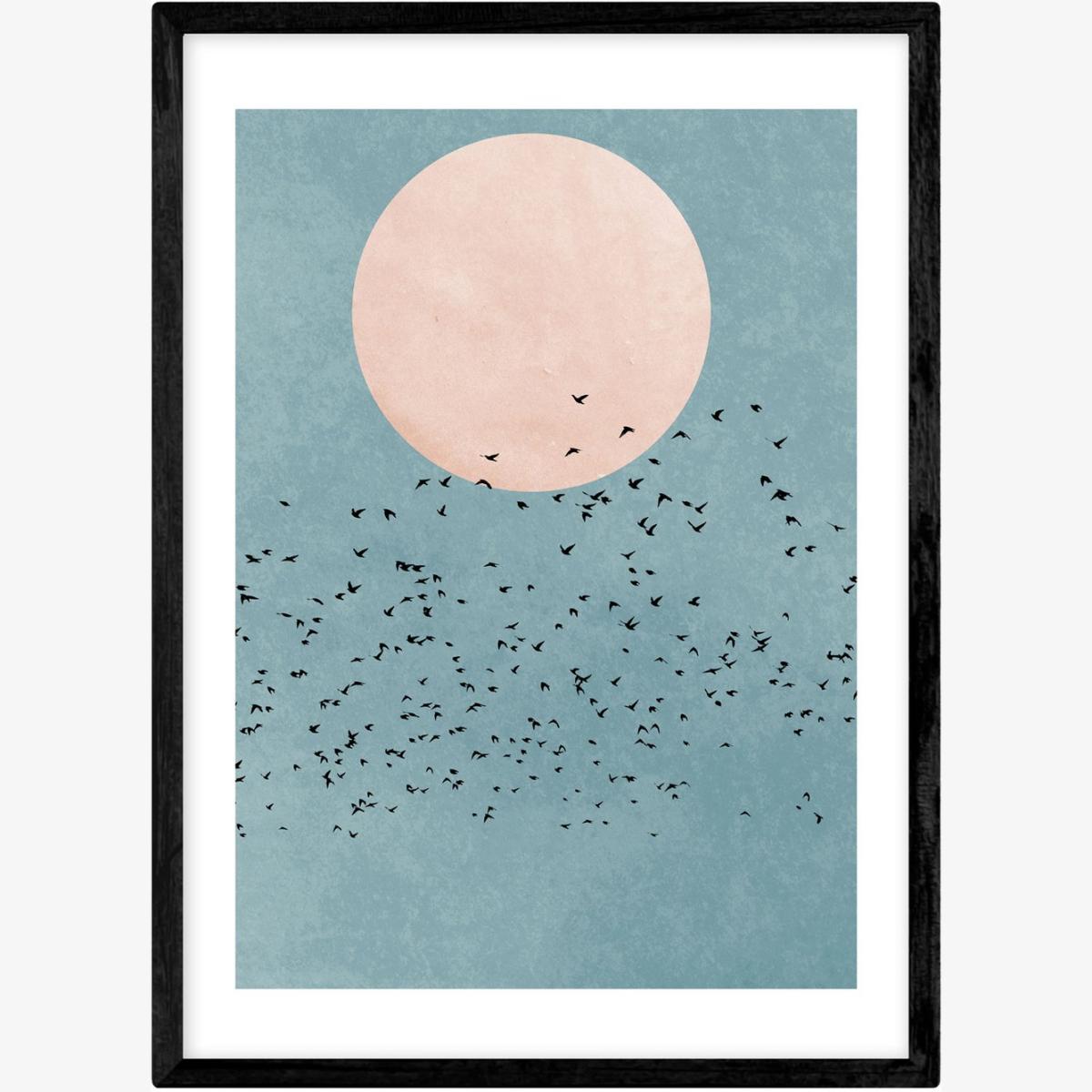 This print is great for adding a calming, atmospheric touch to a variety of interiors. I love it in minimalist or modern spaces where its soft colour palette can stand out without overwhelming, and it works equally well in living rooms, bedrooms, or even a home office. The large moon and flock of birds evoke a sense of freedom and tranquility, making it a versatile piece for creating a relaxed vibe. For styling, pair it with sleek black or natural wood frames for a clean look, and consider hanging it above a sofa or bed to anchor the space. Keeping surrounding decor simple allows this artwork to truly shine as a focal point.