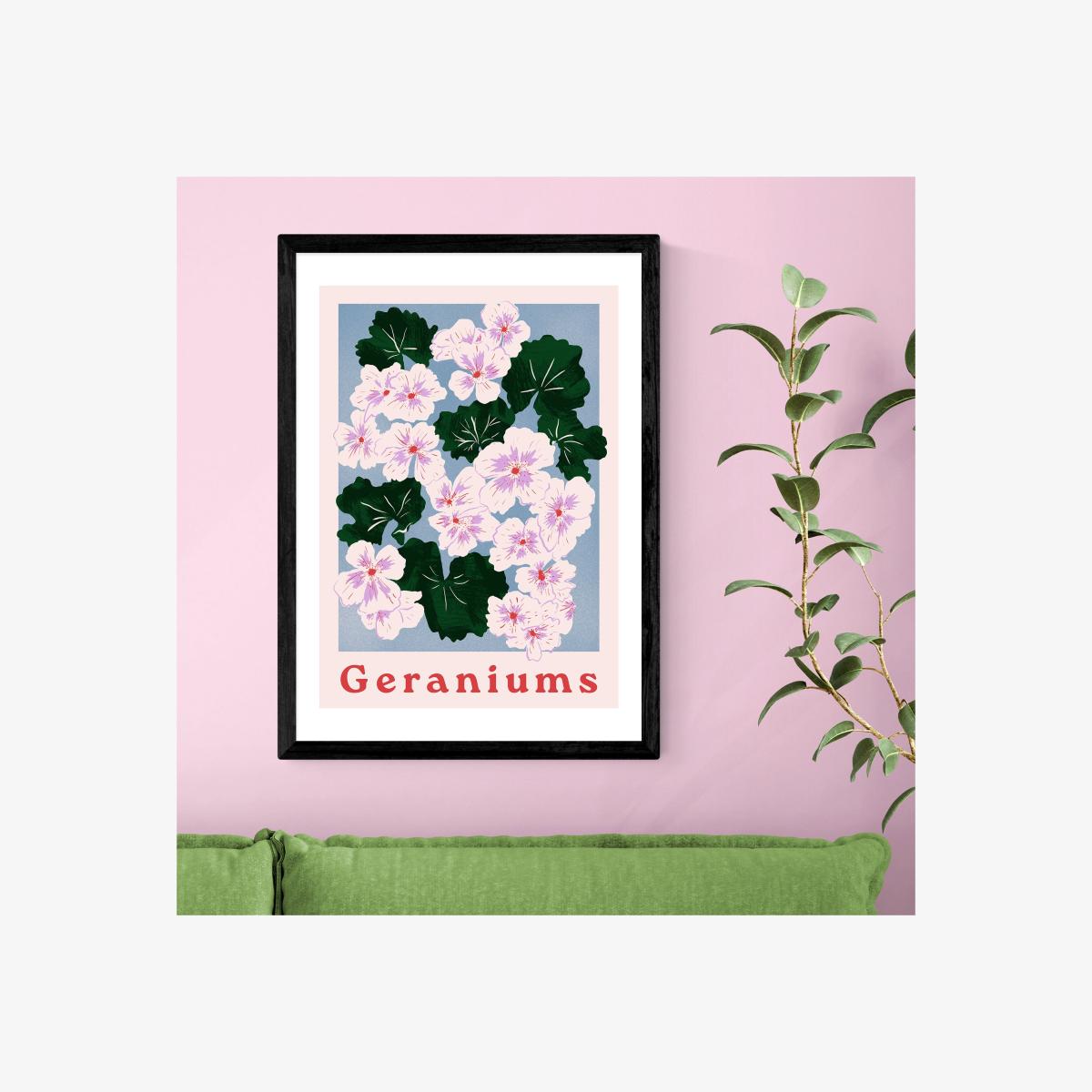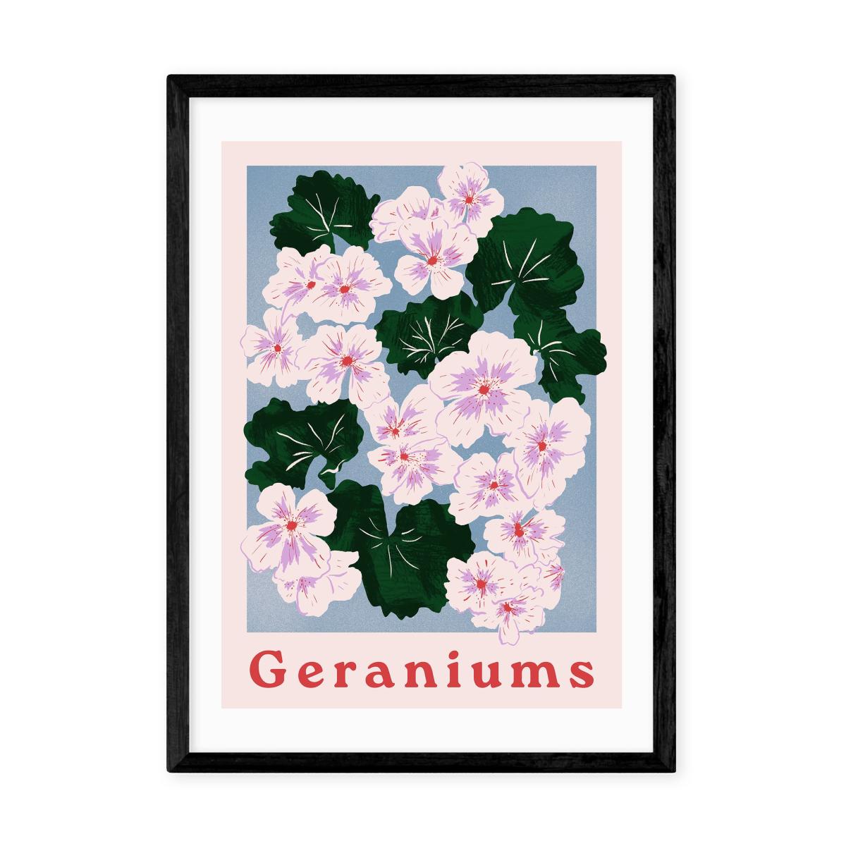 * Geraniums floral print * Soft colourway * Printed on 210gsm acid-free archival paper * Available in A1, A2, A3 & A4 size * Frame options: black, white and oak wood effect * Available in unframed option Soft florals are the champion here, with this attractive Geraniums print in a relaxed colour palette. Perfect for a range of decor styles, it's printed using a fade-resistant process to ensure it stays bright and crisp. Choose from a range of sizes and solid Obeche wood frame options, or unframed to best suit your wall space.