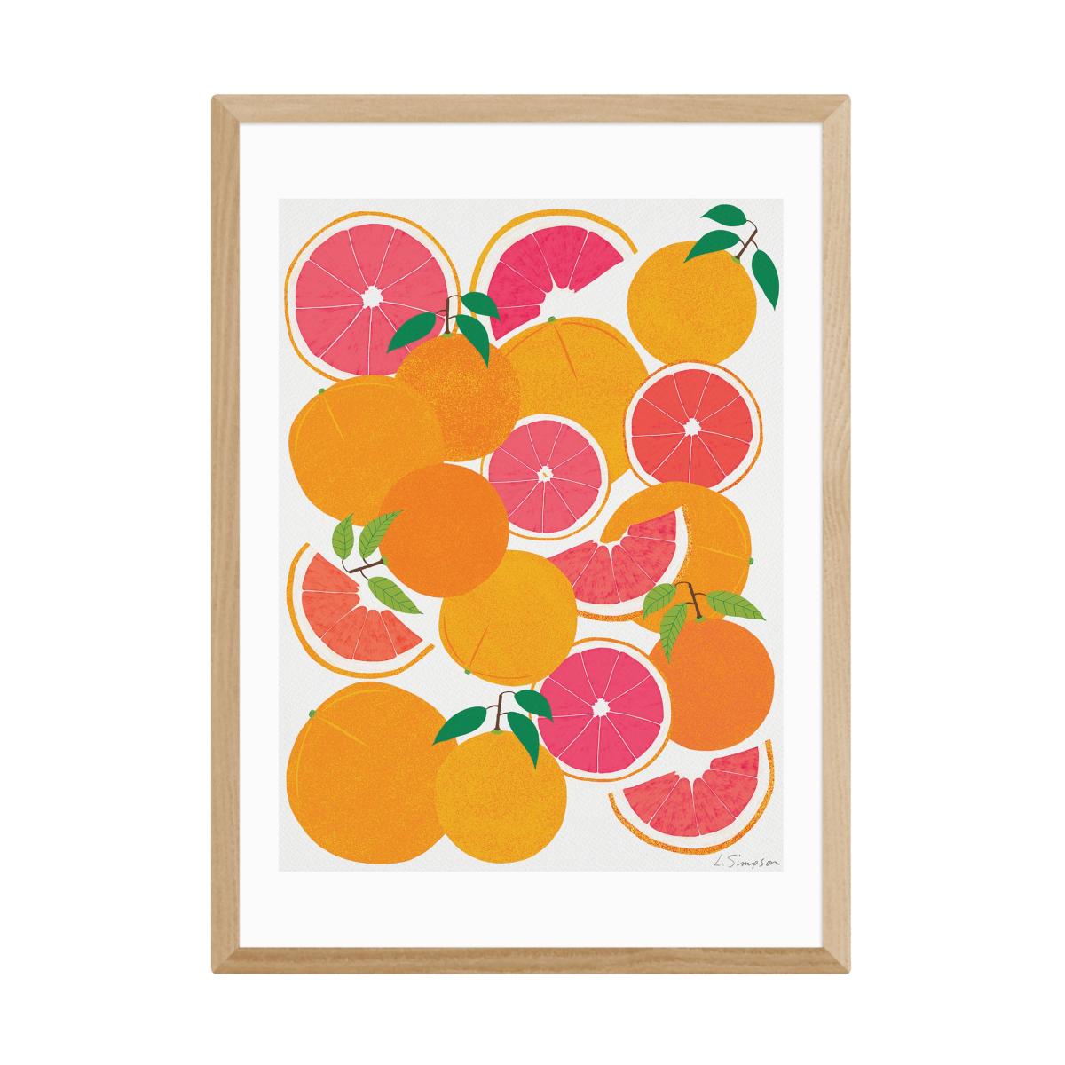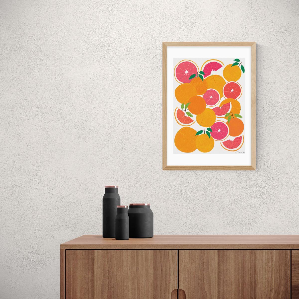 I love this grapefruit harvest print because of its vibrant, fresh colour palette-perfect for adding a pop of nature-inspired energy to any space. It works particularly well in kitchens, dining areas, or even bright, casual living rooms where a cheerful tone is desired. When styling, consider pairing it with minimalist furniture or neutral backgrounds to let the artwork stand out. Practical tips include using a simple frame like the light wood one shown, which complements its colourful design without overwhelming the space. It’s a great piece to inject a touch of playful sophistication, especially in interiors aiming for a modern, light-filled vibe.