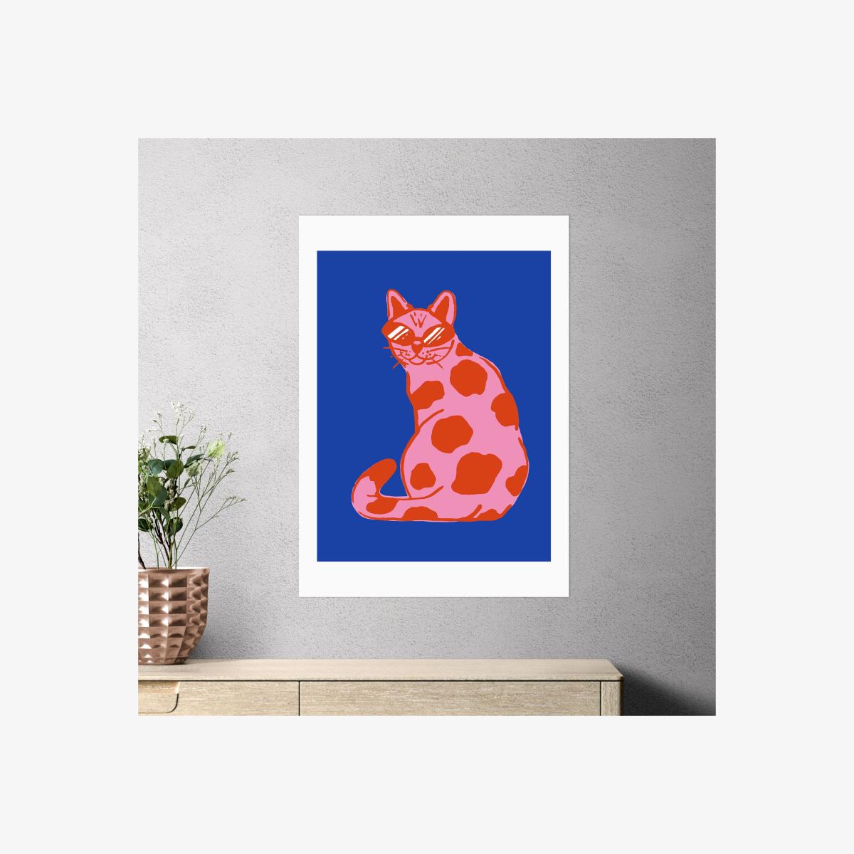 * High contrast, clashing colour * Modern artwork * Cat design * Available in A1, A2, A3 & A4 sizes * Choice of black, white and oak effect Obeche wood frames * You can buy the print unframed too! * Giclee printed on 210gsm acid free archival paper This eye-catching print features clashing colours of blue, pink and red for an impactful statement. The groovy cat complete with sunglasses brings a playful and fun aspect to this décor piece, great for a bold design choice in your space. You can customise the size and frame for this print! Choose from a variety of frame options and then pick your size. This way you can find the best design to suit your home interior. Each piece of artwork has gone through a giclee printing process which will help the print stay vibrant for years to come, keeping your home looking fresh. For every print sold, a percentage of profit is donated to Cool Earth, a charity combating deforestation in the rainforest.