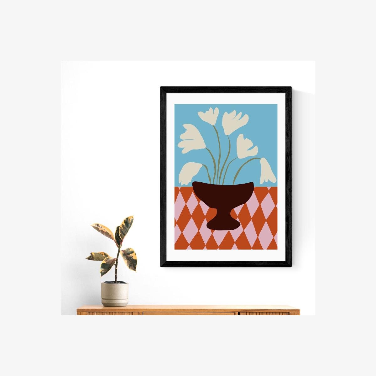 * Colourful floral design * Fade-resistant print * Printed on 210gsm acid-free archival paper * Available in A1, A2, A3 & A4 size * Frame options: black, white and oak wood effect * Available in unframed option This colourful floral print is a great way to add effortless style and vibrant hues to your walls, with an eye-catching diamond design backing the floral subject. Available in a range of colours and frame options, it's a fuss-free and easy way to update your decor. Choose unframed so that you can display it in a different way - the choice is yours!