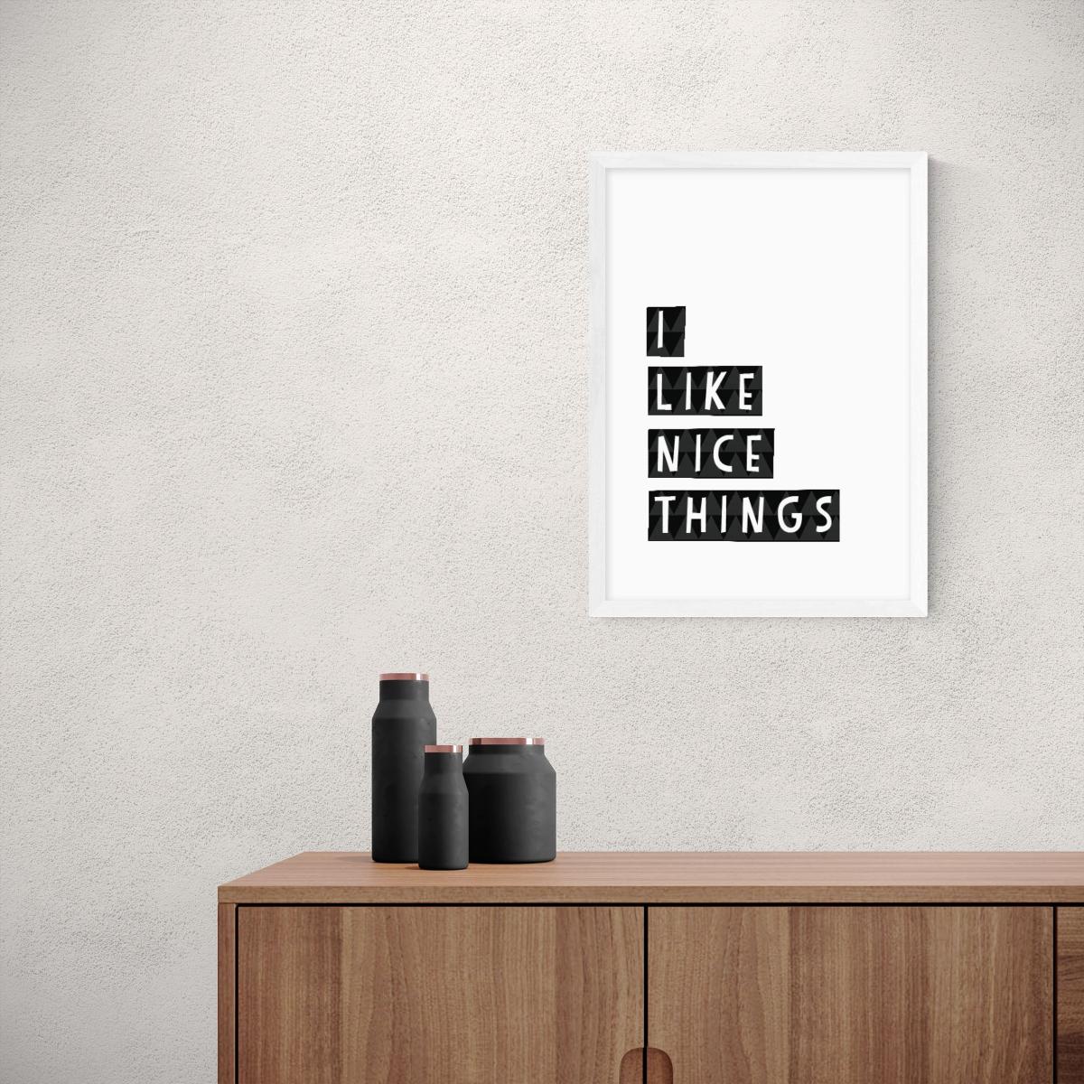 Simple and quirky, the statement, “I like nice things” is ideal motivation for placing in your bedroom or closet to encourage and inspire those nice things in your house. This typographic print by Seventy Tree uses a Giclee printing process to prevent fading, so this artwork will remain fresh for years to come. Each design is available in four print sizes and a variety of frame options, including unframed, so you can display your artwork however you wish.