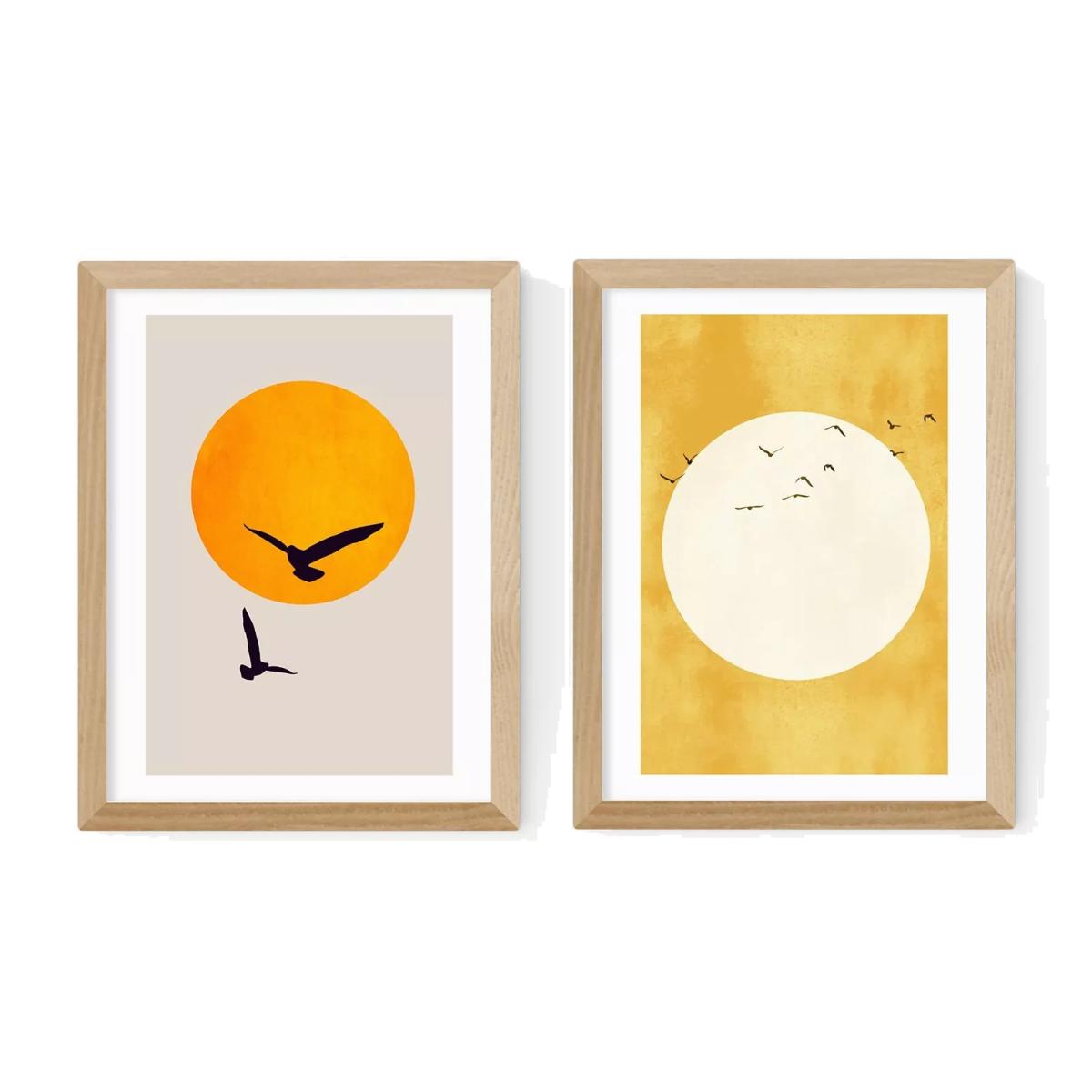 A pair of golden sun prints by Kubistika. The giclée art printing process and 210gsm acid-free archival paper create an exhibition-quality art print with long-lasting colours that more closely resemble the artist's materials and tones. A digital form of the original work is stored and then printed using a commercial printer and pigment-based inks. Made in the UK, each print is presented with an acrylic glaze that's optically the same as glass yet lighter in weight making it easier and safer to hang. Ready to hang on your wall, it's framed in obeche wood in a choice of finishes. Berlin-based designer Boris Draschoff, known as Kubistika, creates art that follows the literal translation from Greek of the word 'kaleidoscope', meaning 'observation of beautiful forms'. Simplifying subjects, he reduces them to their essentials. Whether he is restructuring shapes and colours along cubist lines, or creating awesomely outrageous pop-artsy collages in a playground of pastels, he can always be trusted to turn your perspective around. Have you thought about wall hooks and fittings? EAST END PRINTS picture frames are usually one of two frame widths: medium frame (2.2cm) and wide frame (3.5cm). The frame width varies across the range. The medium frame measures 2.2cm across and comes in the following four sizes: 33.4 x 28.4cm 43.4 x 33.4cm 53.4 x 43.4cm 83.4 x 63.4cm The wide frame measures 3.5cm across and comes in the following four sizes: 36 x 31cm 46 x 36cm 56 x 46cm 86 x 66cm