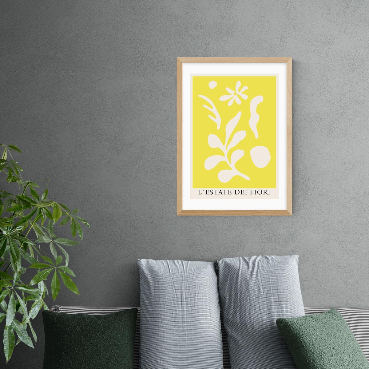 I love this bright yellow print because it injects a cheerful, fresh vibe into any space. It works particularly well in minimal or Scandinavian interiors, adding a pop of colour without overwhelming the overall look. For practical styling, consider framing it in a simple, clean-lined frame to keep the focus on the artwork, and hang it at eye level above a sofa or sideboard. Pairing it with neutral cushions or accessories can help it stand out, while layering with other artworks in similar colour tones can create a cohesive gallery wall. This piece is a great way to bring a bit of sunshine indoors, especially in rooms that could do with a touch of warmth and vitality.
