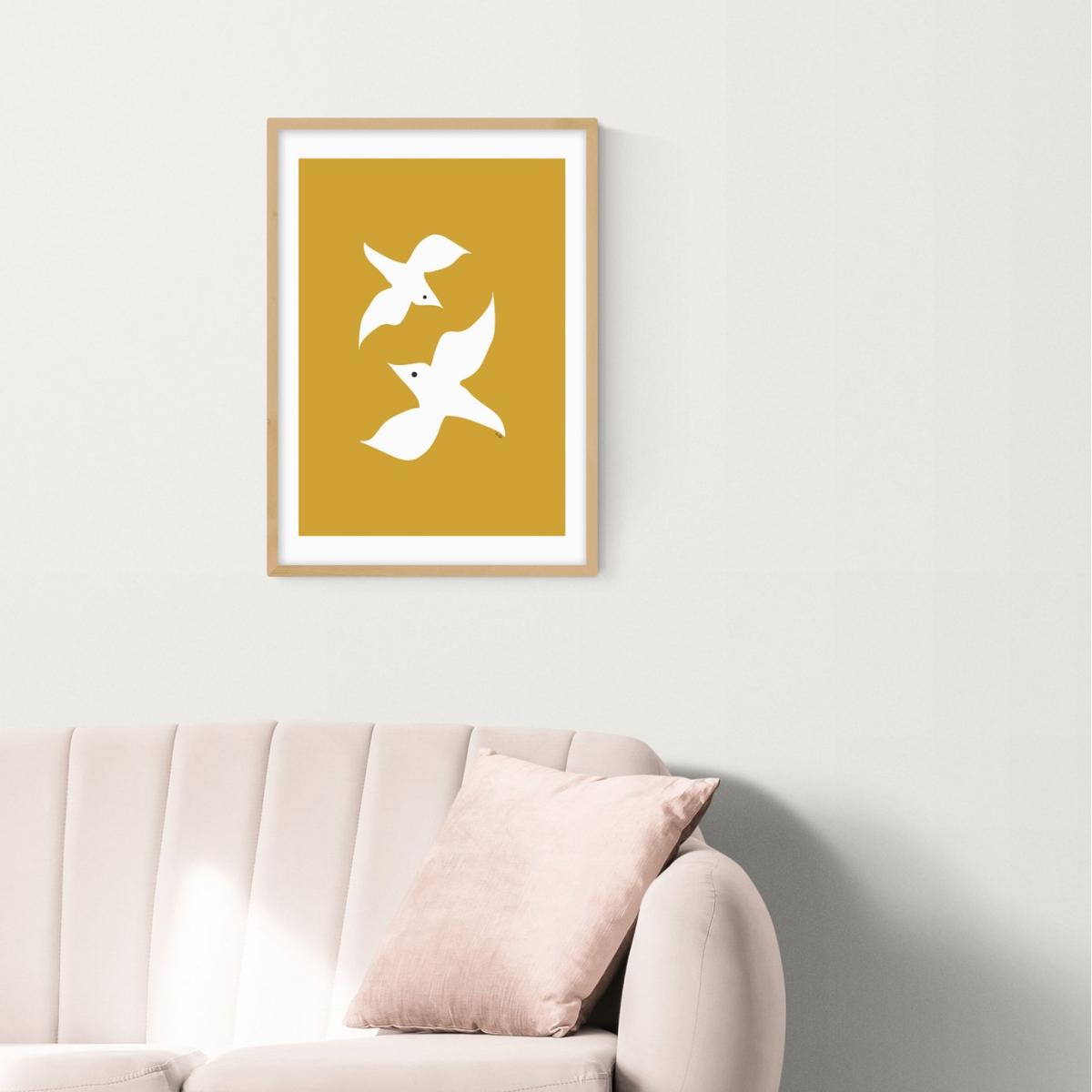 Dare to be simple with this distinct mustard yellow birds stencil print by Linda Gobeta. Published by East End Prints. Printed on 210gsm acid-free, archival paper and framed in obeche wood with an acrylic glaze. Overall size H61.4, W44, D2.2cm. Weight 2.7kg. Framed print. Rectangular. Obeche wood frame included.