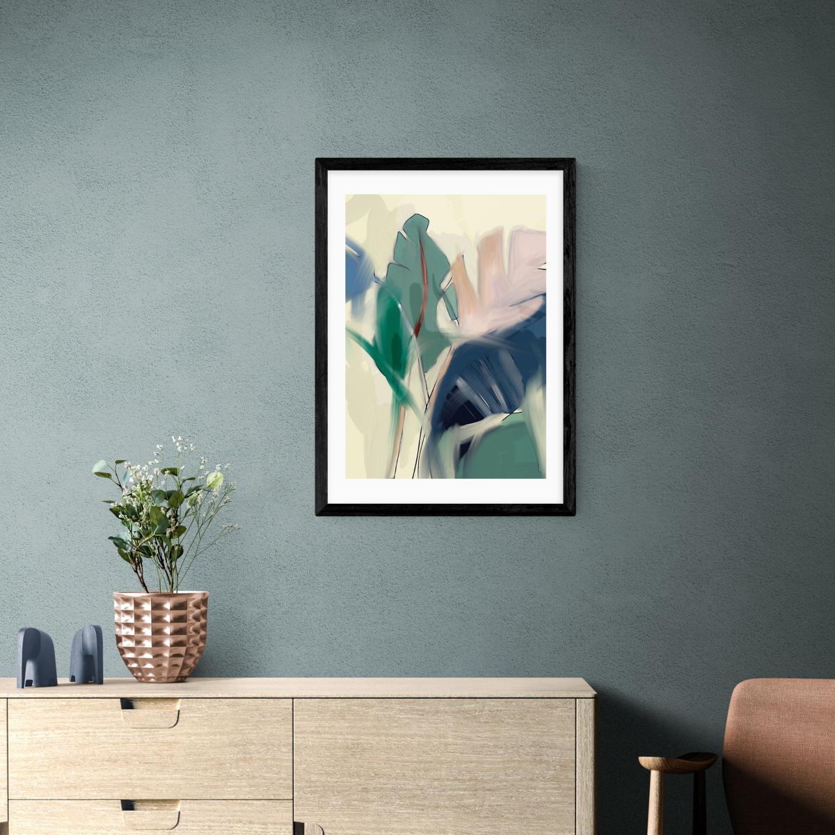 I love this print because of its soft pastel palette and modern botanical vibe, making it a great statement piece without feeling overwhelming. It works especially well in contemporary and minimalist interiors, adding a touch of colour and serenity. For styling, consider pairing it with other light-toned or neutral accessories to keep the look cohesive, and hang it at eye level above a sideboard or sofa for maximum impact. It also pairs nicely with natural textures like rattan or linen, giving the space a fresh, relaxed feel. This piece is versatile enough to slot into various rooms, from living areas to bedrooms, where it can bring a gentle splash of colour and nature-inspired calm.