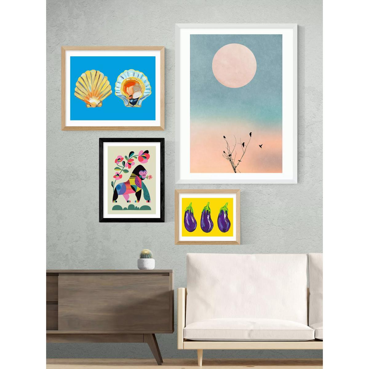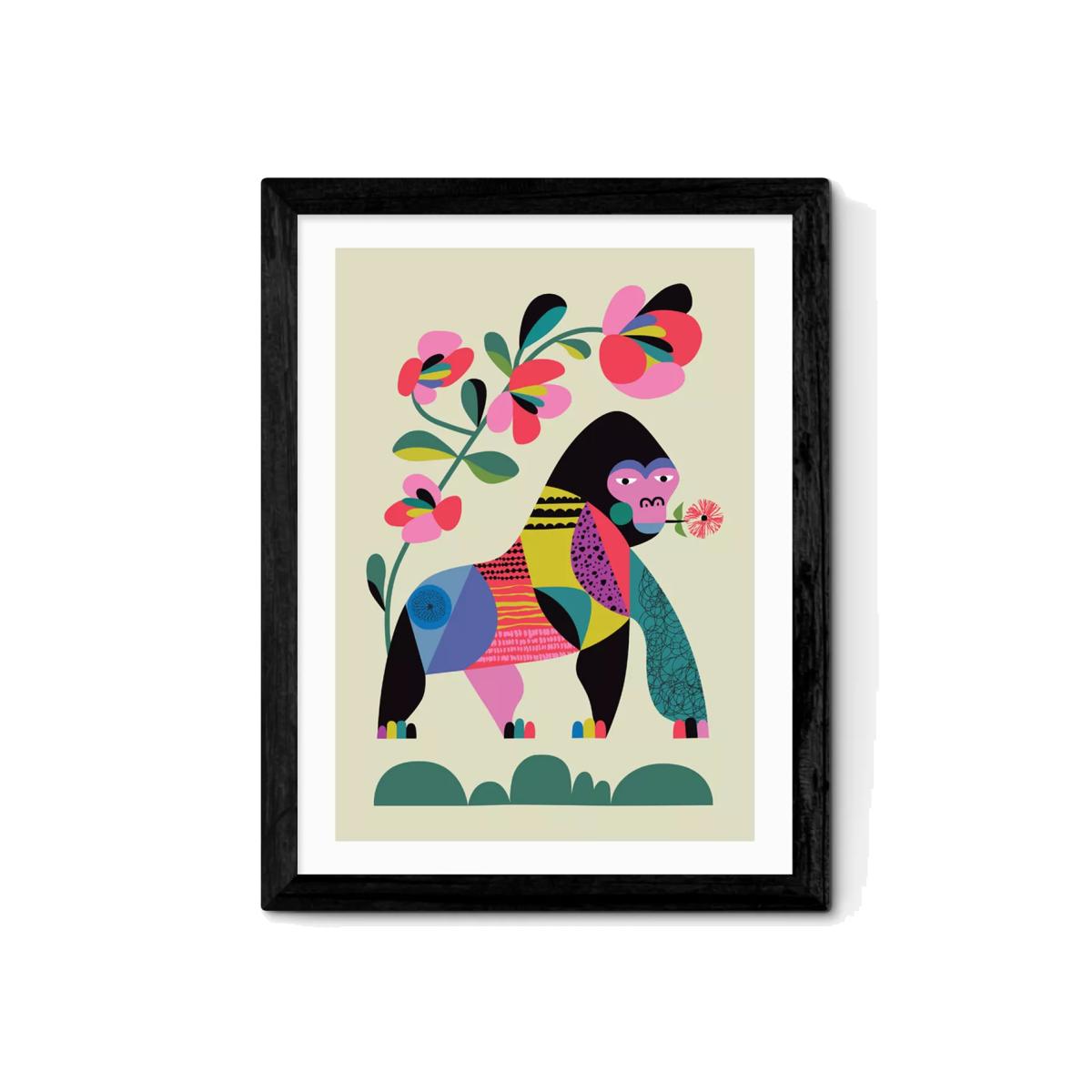 Could there be a more gentle giant than Rachel Lee's beautiful technicolour floral 'Gorilla', perfect for a nature lover's bedroom wall? The giclée art printing process and 210gsm acid-free archival paper create an exhibition-quality art print with long-lasting colours that more closely resemble the artist's materials and tones. A digital form of the original work is stored and then printed using a commercial printer and pigment-based inks. The print is presented with an acrylic glaze that's optically the same as glass yet lighter in weight, making it easier and safer to hang. Ready to hang on your wall, it's made in the UK and framed in obeche wood in a choice of finishes. Rachel Lee is a Sydney-based illustrator originally from Hong Kong. She is inspired by nature and wildlife and creates art with a modern take on Mid-century folk art. Being a mother of two children, colour and vibrancy run through her work. She takes inspiration from her kids, along with a love of travelling and dogs. Have you thought about wall hooks and fittings? EAST END PRINTS picture frames are usually one of two frame widths: medium frame (2.2cm) and wide frame (3.5cm). The frame width varies across the range. The medium frame measures 2.2cm across and comes in the following four sizes: 33.4 x 28.4cm 43.4 x 33.4cm 53.4 x 43.4cm 83.4 x 63.4cm The wide frame measures 3.5cm across and comes in the following four sizes: 36 x 31cm 46 x 36cm 56 x 46cm 86 x 66cm