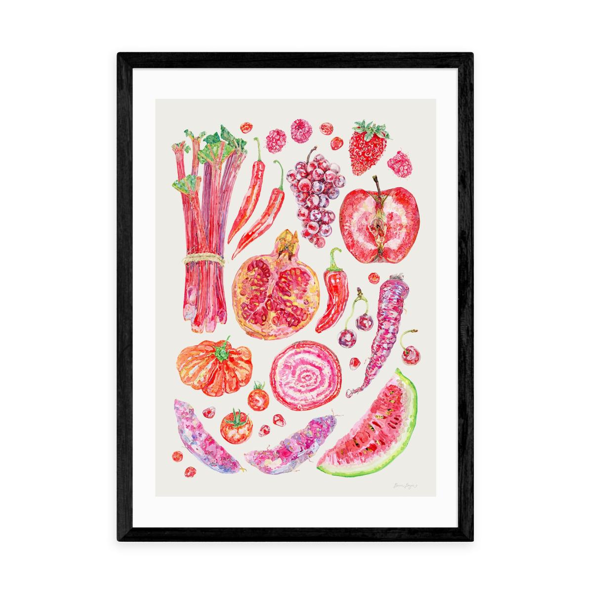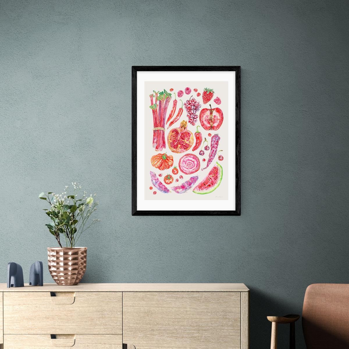 Bold with red fruit and vegetables, this print is sure to bring some colour into your kitchen. You are able to customise the size and frame for this print! Choose from a variety of frame options and then pick your size. This way you can find the best design to suit your home interior. Each piece of artwork has gone through a giclee printing process which will help the print stay vibrant for years to come to keep your home looking fresh.