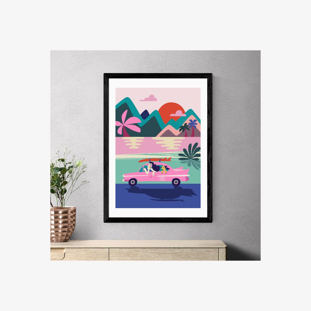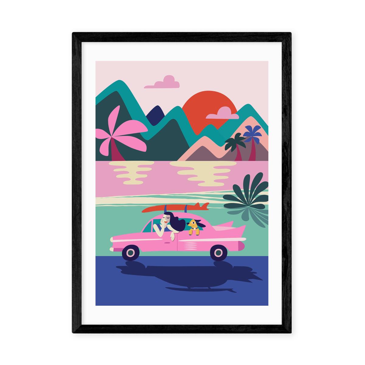 * Vibrant, colourful design * Playful and fun * Available in A1, A2, A3 & A4 sizes * Choice of black, white and oak effect Obeche wood frames * You can buy the print unframed too! * Giclee printed on 210gsm acid free archival paper Get ready for adventure with this colourful, vibrant print depicting a carefree road trip. This will make a bold and fun statement in your space, with a riot of colour and a block print design. You can customise the size and frame for this print! Choose from a variety of frame options and then pick your size. This way you can find the best design to suit your home interior. Each piece of artwork has gone through a giclee printing process which will help the print stay vibrant for years to come, keeping your home looking fresh. For every print sold, a percentage of profit is donated to Cool Earth, a charity combating deforestation in the rainforest.