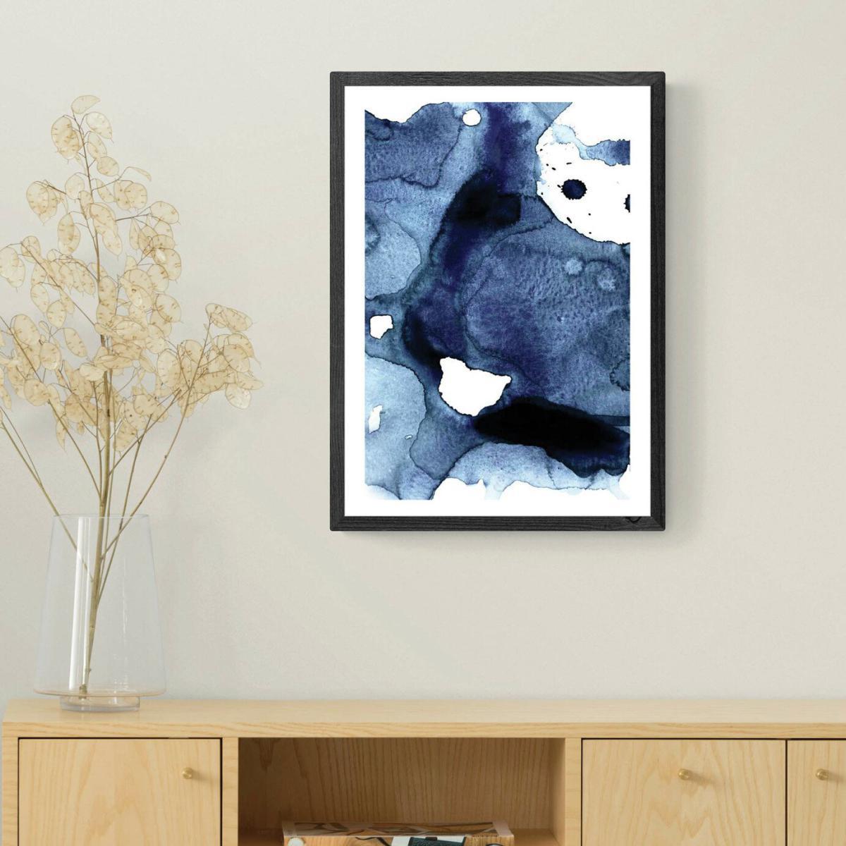 This print is a versatile piece that works well in a range of interiors, particularly those with a modern, minimalist, or contemporary aesthetic. I love its abstract design and cool blue tones, which can introduce a calming vibe to living spaces or bedrooms. For styling, try pairing it with simple, streamlined furniture and metallic accents to let the artwork stand out. It looks particularly striking if displayed as part of a gallery wall or above a neutral sofa or console table. In smaller rooms, placing it in a frame with a simple black border enhances its clean look, while larger walls can benefit from a bold statement piece like this to add colour and visual interest.