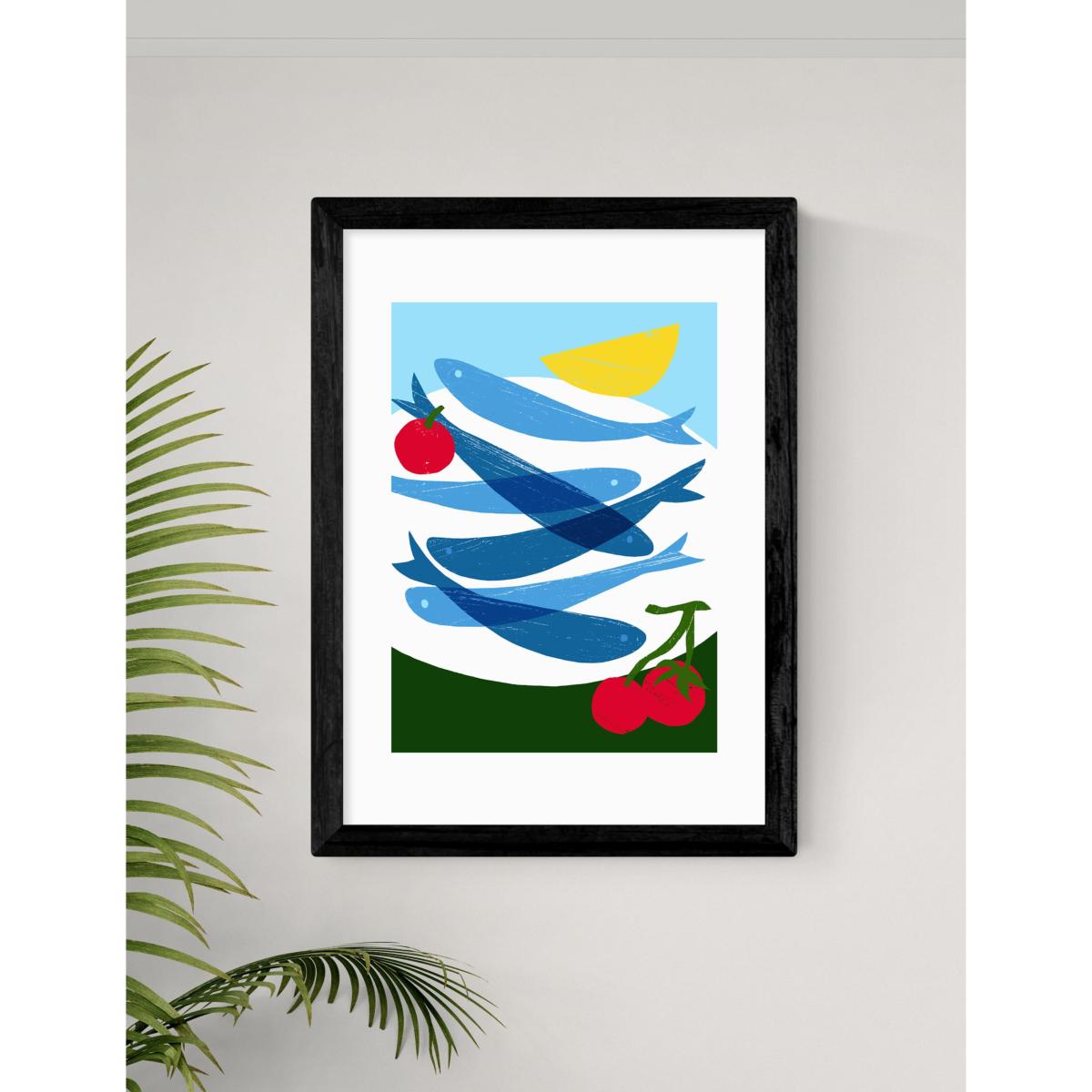 I really like the small fish print-it’s a fun, contemporary piece that works well in both casual and modern interiors. The simplified, colourful design makes it a versatile option for a kitchen or a child's room, where a pop of art can add personality without overpowering the space. For styling, consider pairing it with minimalistic furniture and maybe a few accessories in complementary colours to enhance its vibrant palette. Because of its size, it’s perfect for placing on a side wall or above a shelf where it can add interest without dominating the space. Framing it in a sleek black ensures it remains adaptable, fitting seamlessly into various colour schemes and styles.