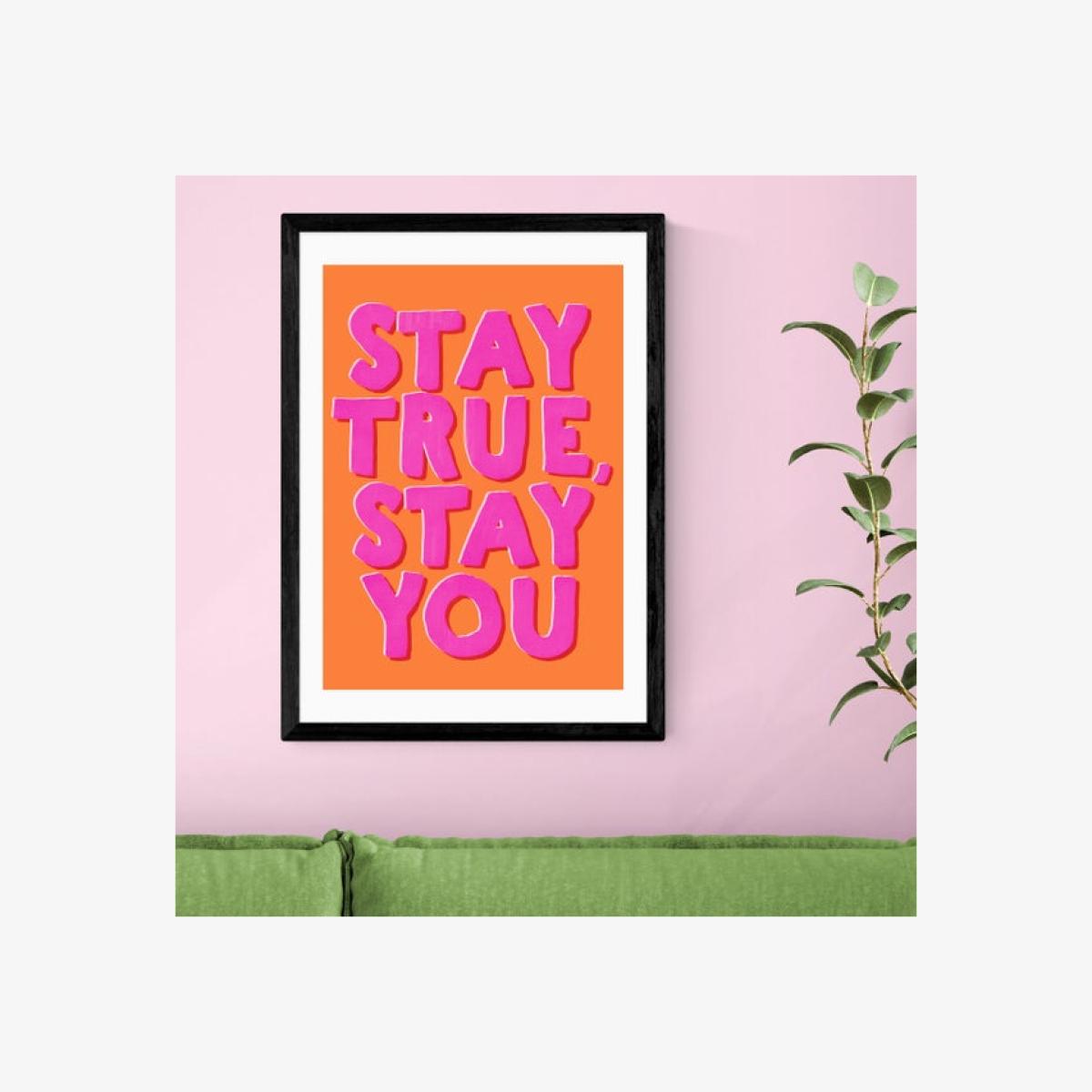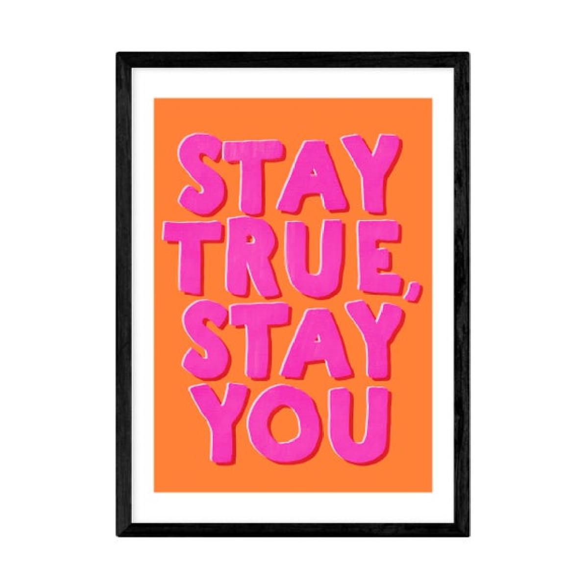 * Fun, Colourful Design * Printed on 210gsm Acid-Free Paper * Available in A1, A2, A3, & A4 Sizes * Frame Options: Black, White, Oak * Available in Unframed Option * Made in the UK Celebrate self-expression with the Stay True Stay You Print by Amber May Art. Featuring a striking typography design, this piece is available in A1, A2, A3 & A4 sizes and printed on 210gsm acid-free archival paper using a giclée technique for long-lasting vibrancy. Choose from black, white, or oak effect frames, or opt for an unframed version. Made in the UK with a royalty paid to the artist for every print sold.