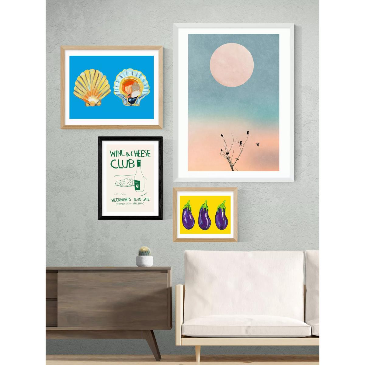 Join the tastiest club there is, with this quirky illustrative print from Stephie Cardona. The giclée art printing process and 210gsm acid-free archival paper create an exhibition-quality art print with long-lasting colours that more closely resemble the artist's materials and tones. A digital form of the original work is stored and then printed using a commercial printer and pigment-based inks. The print is presented with an acrylic glaze that's optically the same as glass yet lighter in weight, making it easier and safer to hang. Ready to hang on your wall, it's made in the UK and framed in obeche wood in a choice of finishes. Stephie Cardona is a self-taught artist and the creative force behind the brand Kunstby. Stephie. She's a US-born, Berlin-based artist known for her digital illustrations that blend humour, whimsy and playfulness. Inspired by her love of good food, drinks and a touch of nostalgia from her travels, she weaves together delightful visuals that evoke a sense of playfulness and naivety. Stephie's fondness for hand-drawn motifs and typography is also evident in her work, adding a distinctive charm. Her ability to seamlessly embrace ever-changing trends ensures her art remains at the vanguard and brings a fresh perspective to the art scene. hooks and fittings EAST END PRINTS picture frames are usually one of two frame widths: medium frame (2.2cm) and wide frame (3.5cm). The frame width varies across the range. The medium frame measures 2.2cm across and comes in the following four sizes: 33.4 x 28.4cm 43.4 x 33.4cm 53.4 x 43.4cm 83.4 x 63.4cm The wide frame measures 3.5cm across and comes in the following four sizes: 36 x 31cm 46 x 36cm 56 x 46cm 86 x 66cm