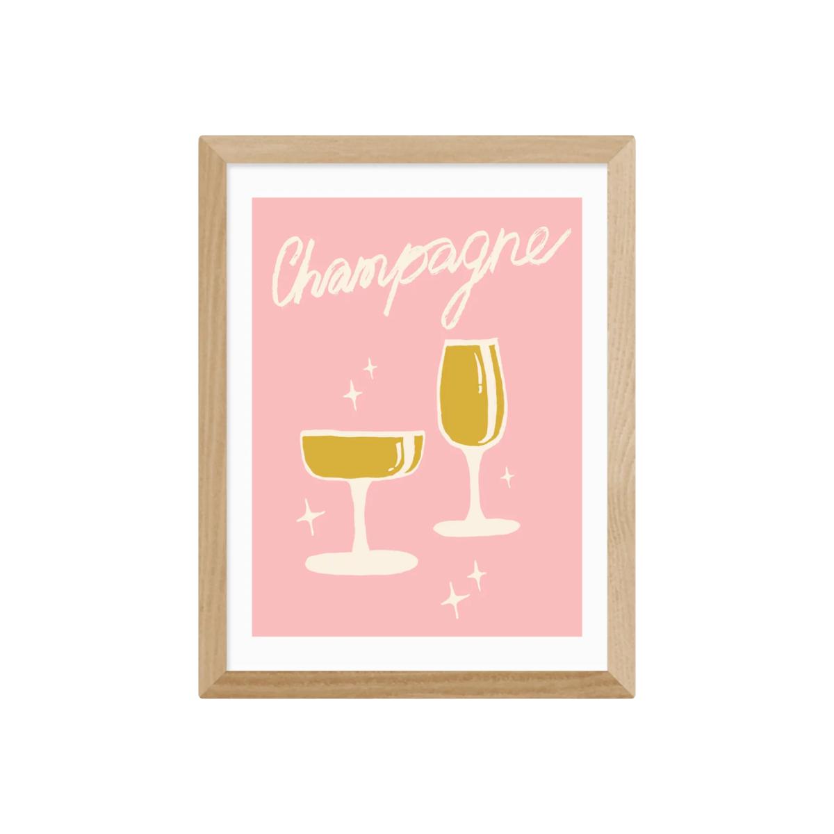 Add a touch of elegant chic to your dining space with this pretty pink champagne print by Tartagain. This fine art-quality print on 210gsm acid-free archival paper is framed in obeche wood in a choice of finishes. The acrylic glaze is light in weight and optically the same as glass. Made in the UK, it's ready to hang on your wall. Have you thought about wall hooks and fittings?EAST END PRINTS picture frames are usually one of two frame widths: medium frame (2.2cm) and wide frame (3.5cm). The frame width varies across the range. The medium frame measures 2.2cm across and comes in the following four sizes:33.4 x 28.4cm 43.4 x 33.4cm 53.4 x 43.4cm 83.4 x 63.4cm The wide frame measures 3.5cm across and comes in the following four sizes: 36 x 31cm 46 x 36cm 56 x 46cm 86 x 66cm