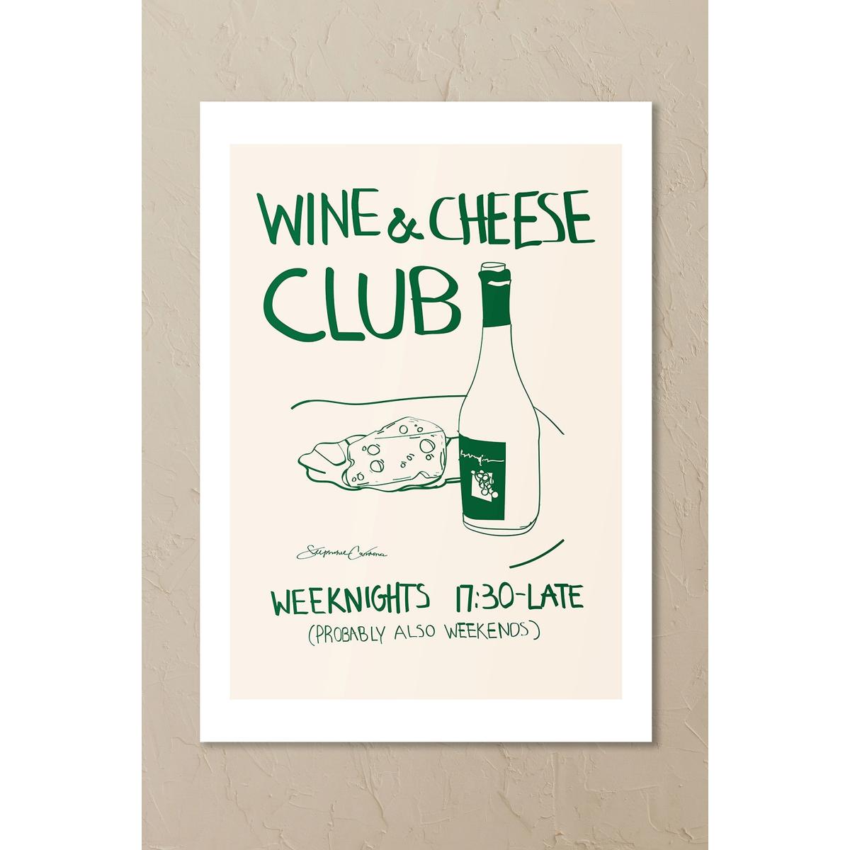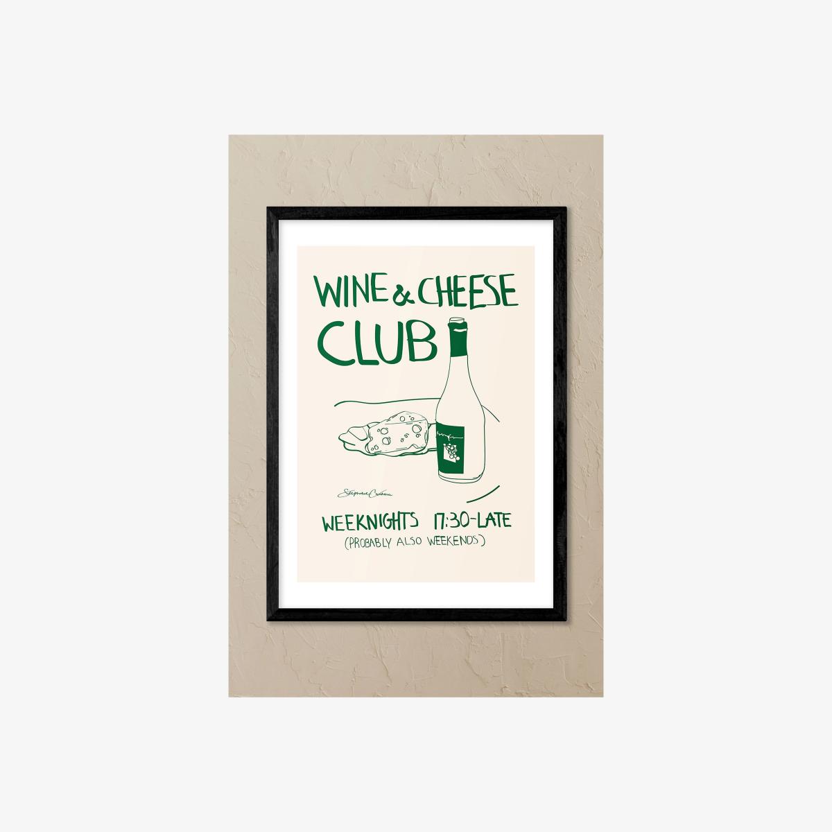The perfect pairing? Wine and cheese. This print will look as good on your wall as it tastes! * Artwork by Stephie Cardona * Giclée printed on 210gsm acid-free archival paper * Optional obeche wood frame, acrylic glaze * Wipe clean with dry, soft cloth * Made in UK