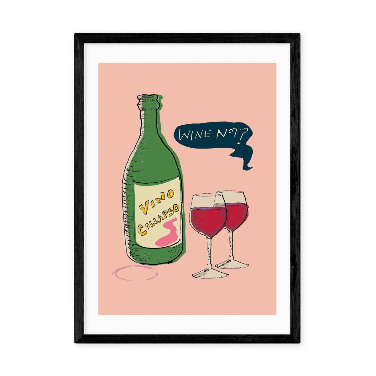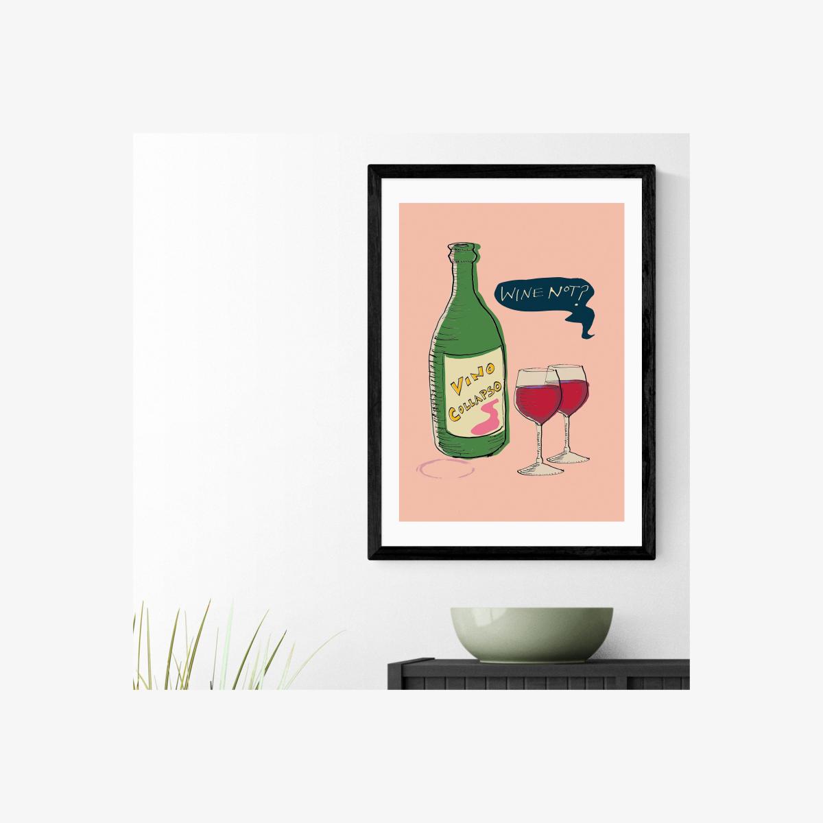 * 'Wine Not' print * Perfect for those relaxed evenings * Printed on 210gsm acid-free archival paper * Available in A1, A2, A3 & A4 size * Frame options: black, white and oak wood effect * Available in unframed option This 'Wine Not' print is the perfect companion for those relaxed evenings with friends. The tongue-in-cheek design adds a touch of playfulness to your decor, and it's printed on archival paper for a fade-resistant finish. It's available in a choice of sizes and solid obeche wood frame options, including unframed, so that you can display it in the best way to suit your space.