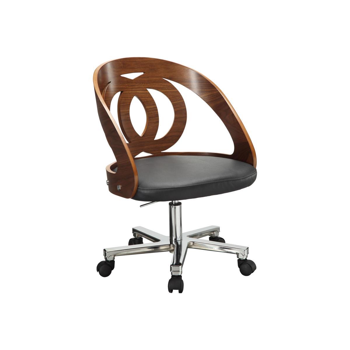 Beautifully curved and with a smooth walnut veneer finish, each piece in the East Street collection brings understated elegance to any home office. Choose from a range of desks in different sizes and designs, and pair your favourite with either the fixed chair or the swivel chair with stunning cut-out veneer back. Drawer units and a bookcase complete this collection of furniture that combines everyday functionality with creative contemporary design. Order by 3.00 pm for fast next working day delivery. Most pieces require easy self-assembly. A Furniture Village online exclusive. Bring the wow factor to the working day with the incredible-value – and incredibly stylish –East Street swivel chair. Beautifully designed and made, this comfortable office chair features a stunning and curvaceous walnut veneer back with an elegant cut-out design. The seat is well-padded and upholstered in black faux leather and the swivel base has a chrome-effect finish. This gorgeous chair is the perfect choice for a living room work station, as it blends comfortable functionality with distinctive contemporary style. Part of the East Street collection of home office and storage furniture, the East Street swivel chair is yours with fast, next working day delivery – just order by 3.00 pm. Pair it with the East Street large desk and create a place to work that’s just more inspiring.