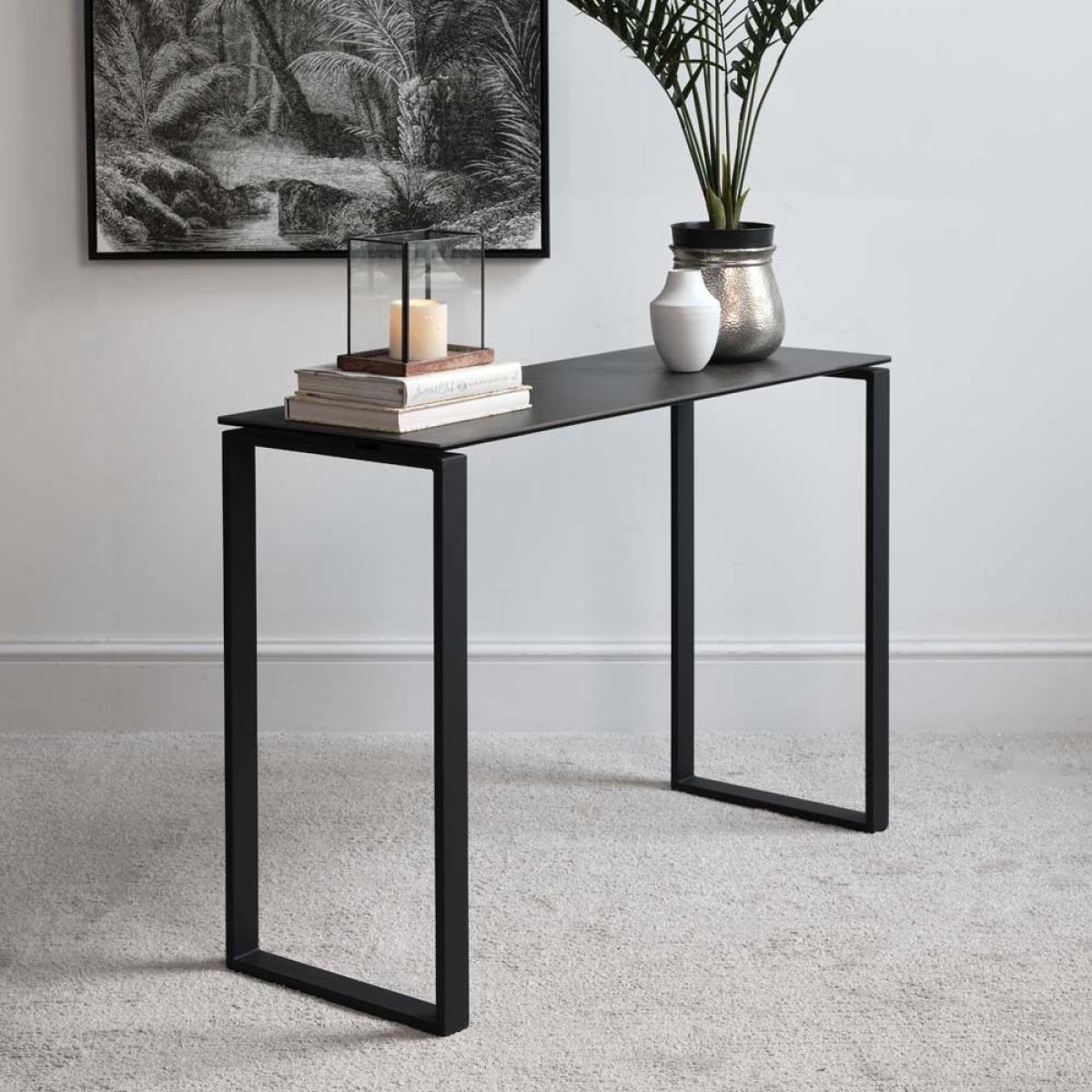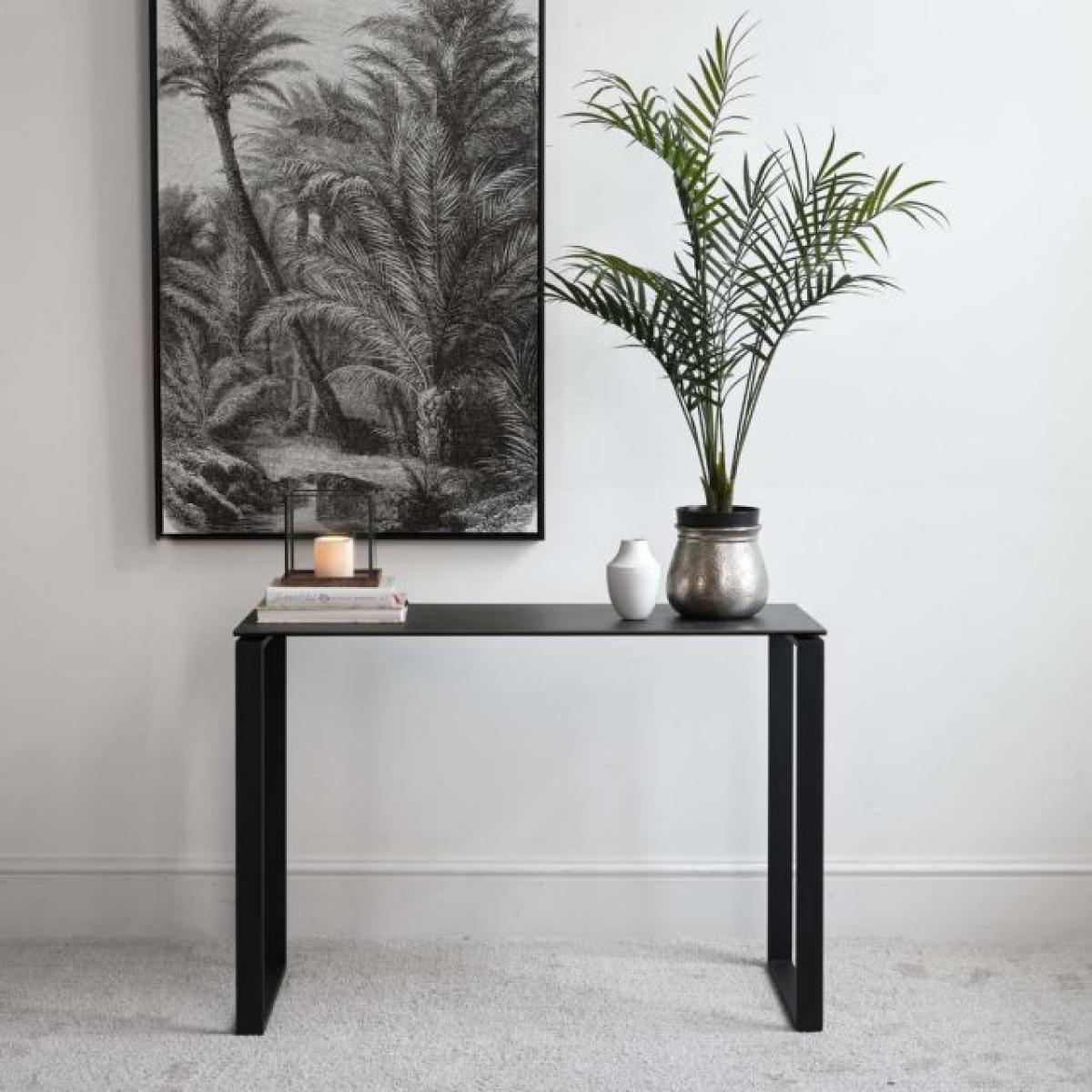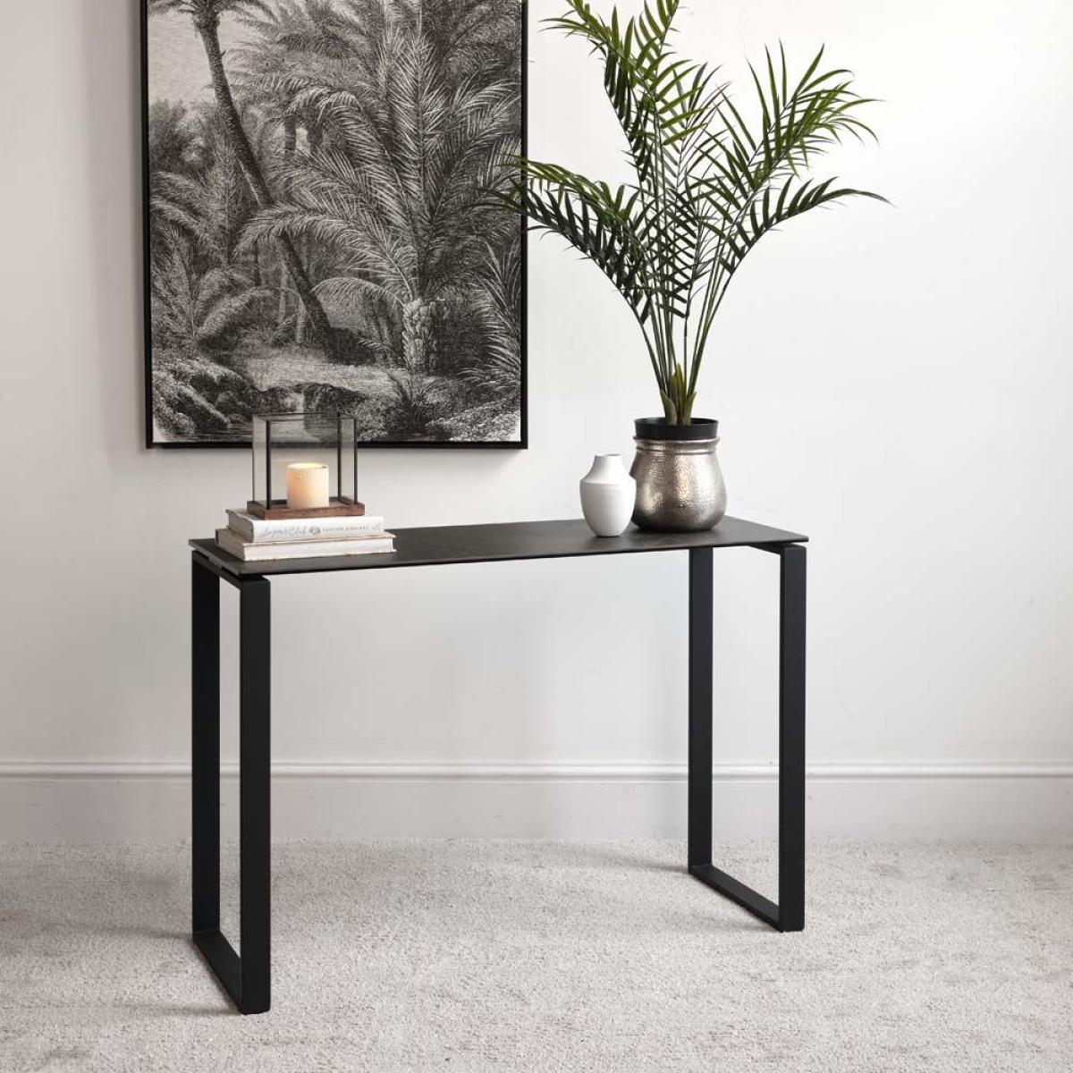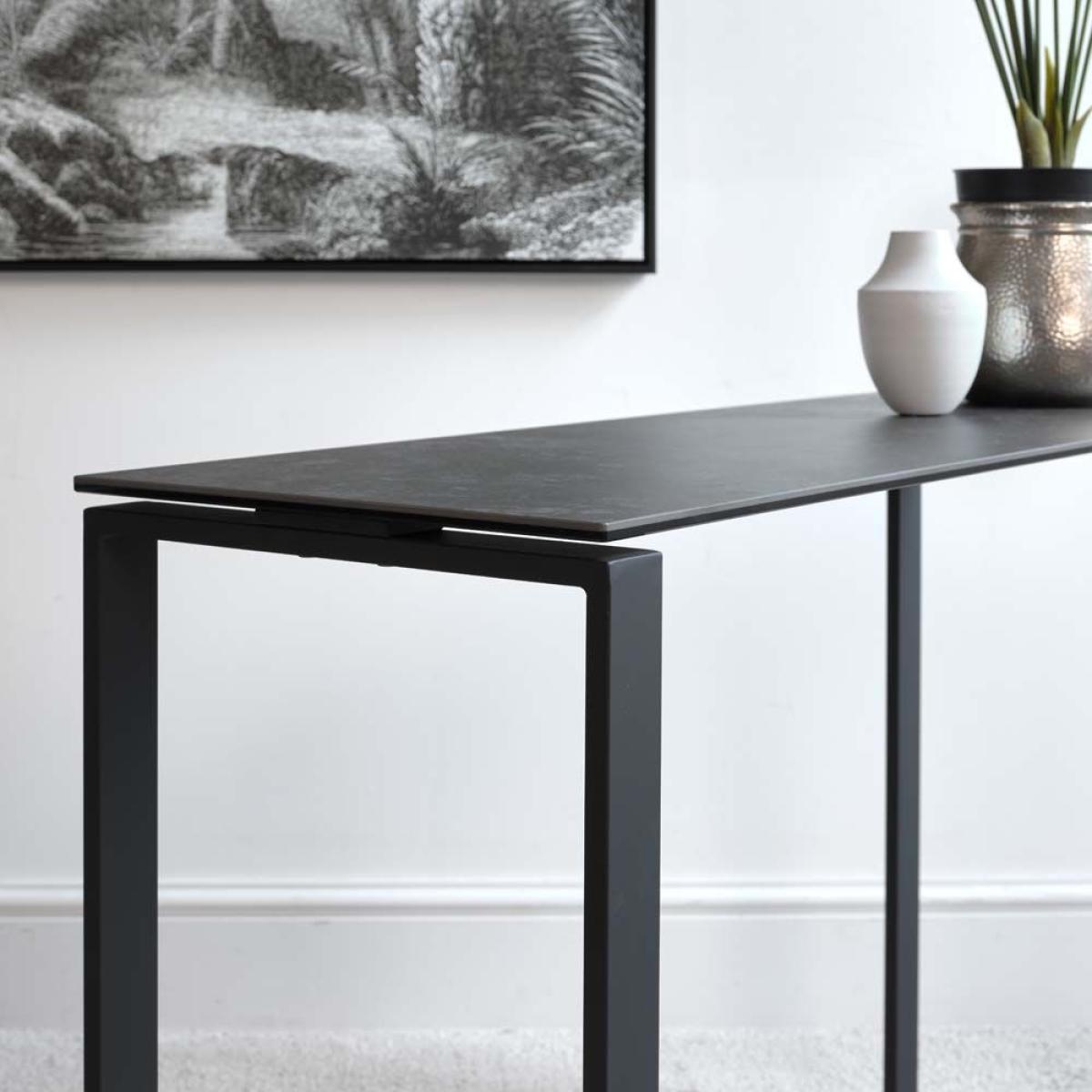 The Eastcote ceramic top console table is a cool and sophisticated addition to the sitting room or hallway. Part of the beautiful Eastcote Collcetion, the top surface is a distressed ceramic black finish, smooth to the touch, and layered on top of a sheet of tempered glass. The table is supported by two black powder-coated metal hoop legs. The ceramic material on the top of this console table is very hard wearing, and is scratch and stain resistant, unlike a natural stone finish. However, we would recommend care when using heavy and rough finish items to not drag things across it.