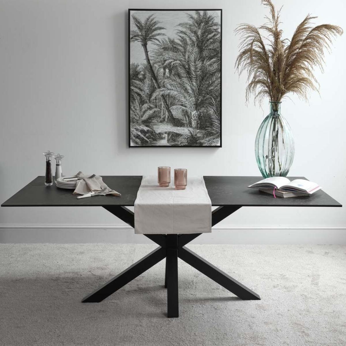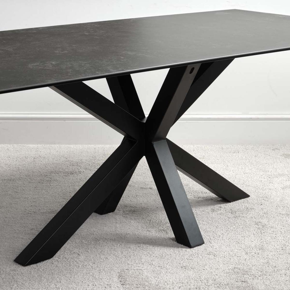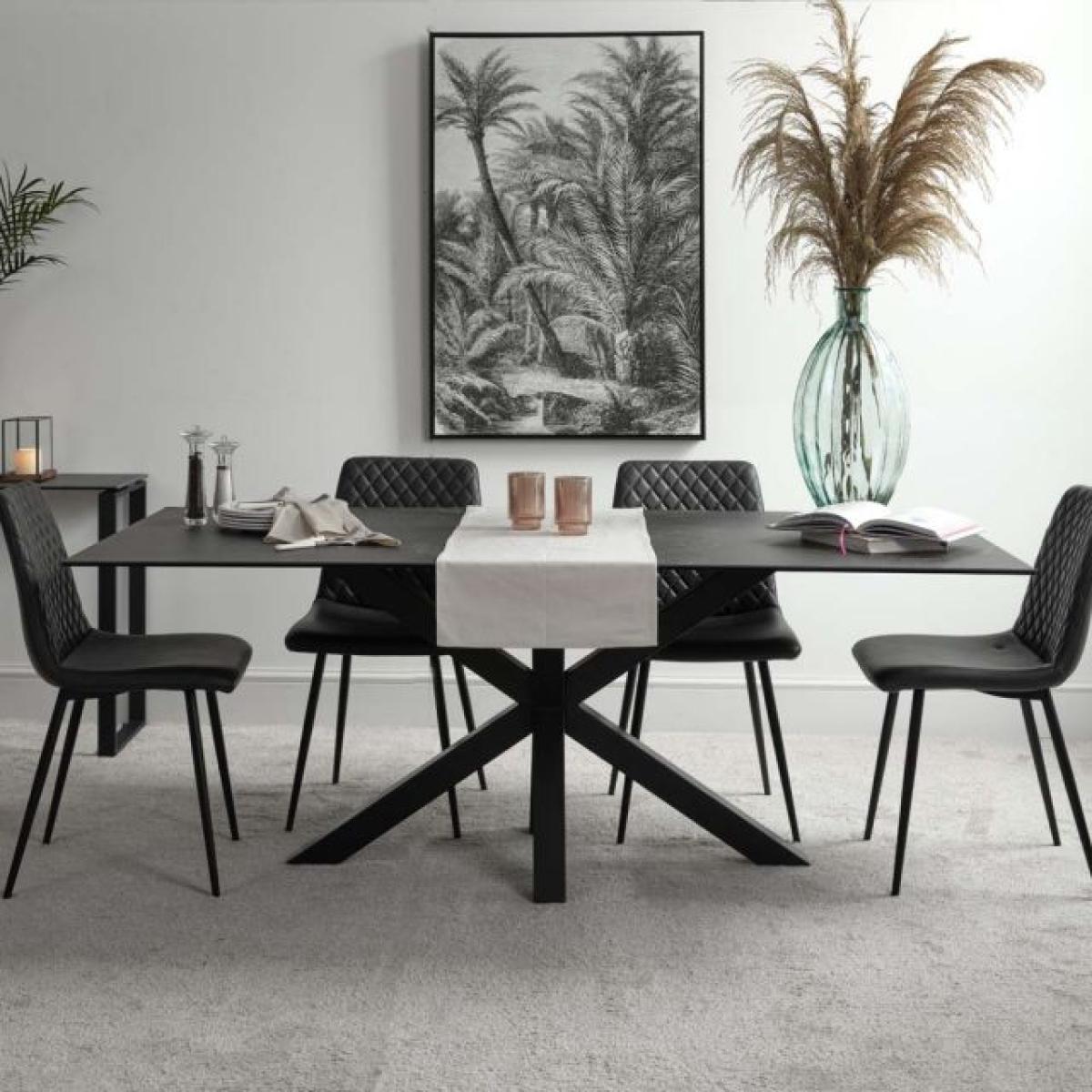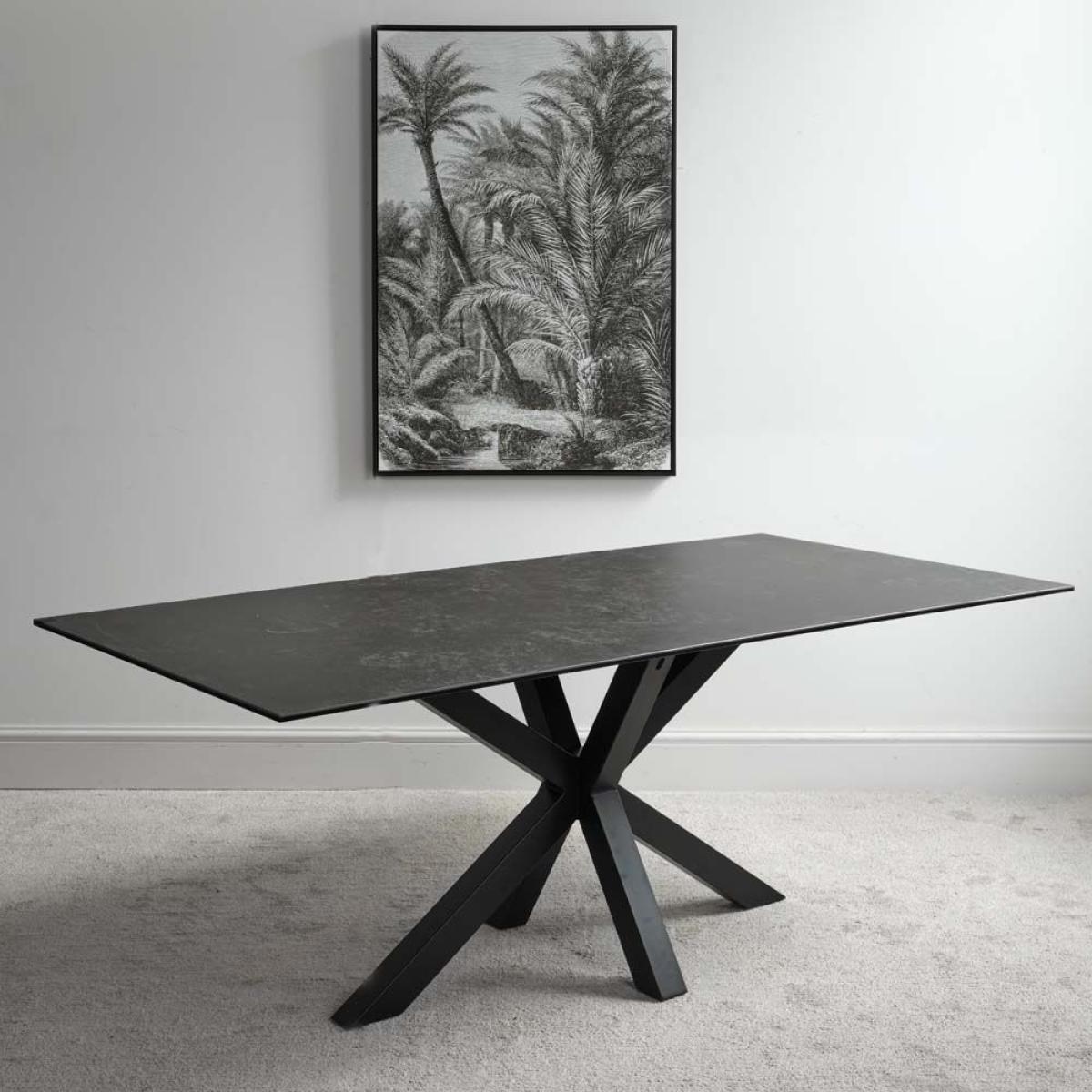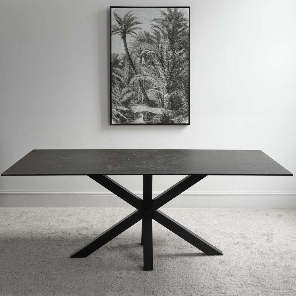 The Eastcote ceramic top dining table is a sleek table that projects a modern air of sophistication. The top surface is a distressed black finish, smooth and cool to the touch, and layered on top of a sheet of tempered glass. The table is supported by imposing star formation black powder-coated metal legs. The ceramic material on the top of this stunning dining table is very hard wearing, and is scratch and stain resistant, unlike a natural stone finish. However, we would still recommend care when using heavy cookware or tableware to not drag items across it. Dimensions: W100cm x H76cm x L200cm Ceramic top Heavy duty metal legs. Simple self assembly