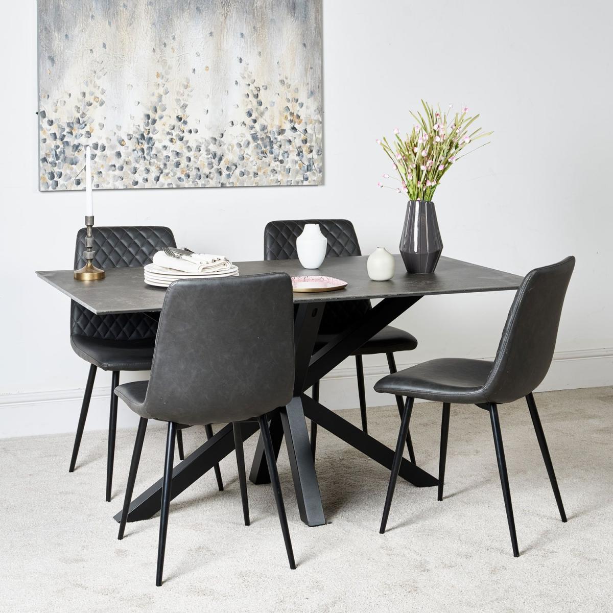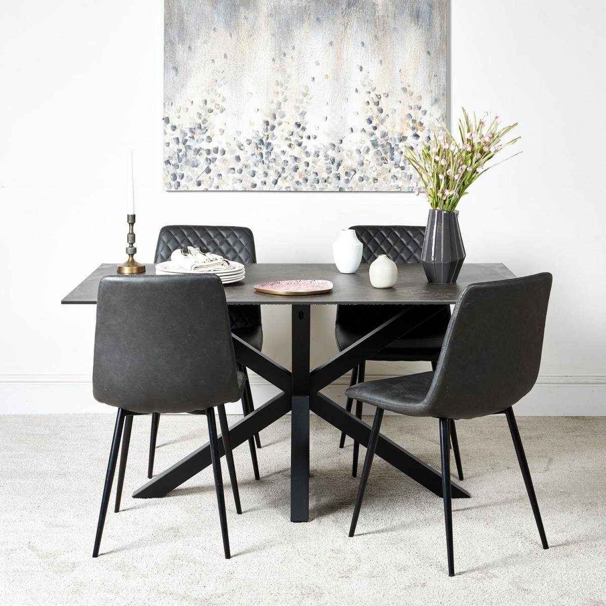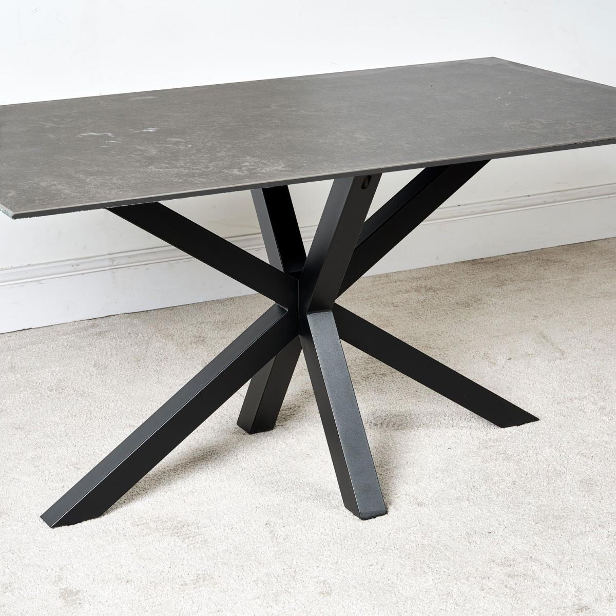 The Eastcote ceramic top dining table is a super modern table that projects an air of minimal chic. The top surface is a slate effect black finish, smooth and cool to the touch, and layered on top of a sheet of tempered glass. The table is supported by imposing star formation black powder-coated metal legs. The ceramic material on the top of this stunning dining table is very hard wearing, and is scratch and stain resistant, unlike a natural stone finish. However, we would still recommend care when using heavy cookware or tableware to not drag items across it.