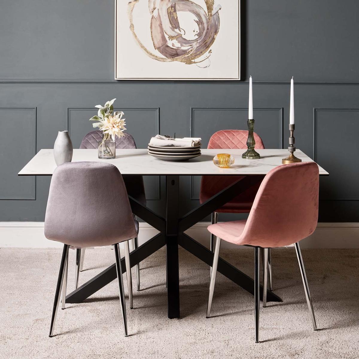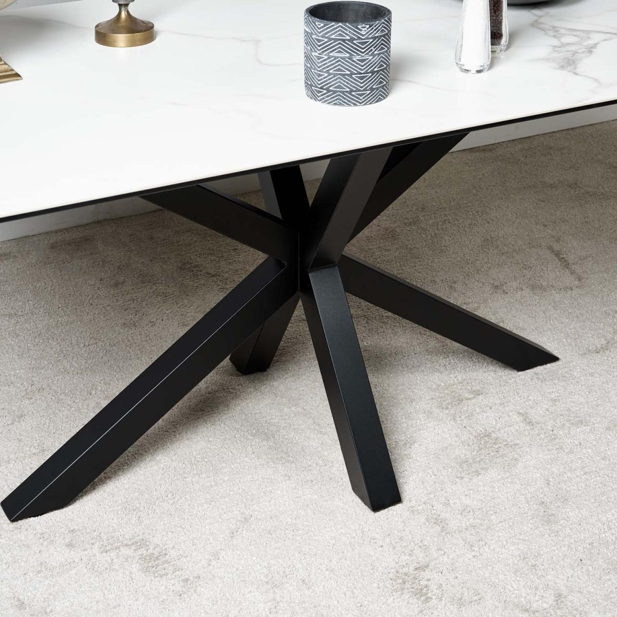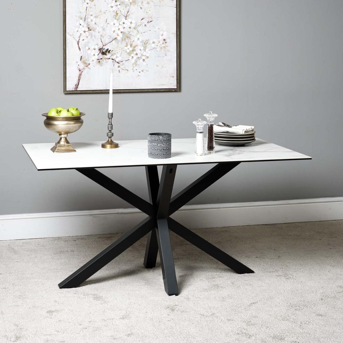 The Eastcote ceramic top dining table is an ultra modern table that projects an air of sophistication. The top surface is a marble effect white finish, smooth and cool to the touch, and layered on top of a sheet of tempered glass. The table is supported by imposing star formation black powder-coated metal legs. The ceramic material on the top of this stunning dining table is very hard wearing, and is scratch and stain resistant, unlike a natural stone finish. However, we would still recommend care when using heavy cookware or tableware to not drag items across it.