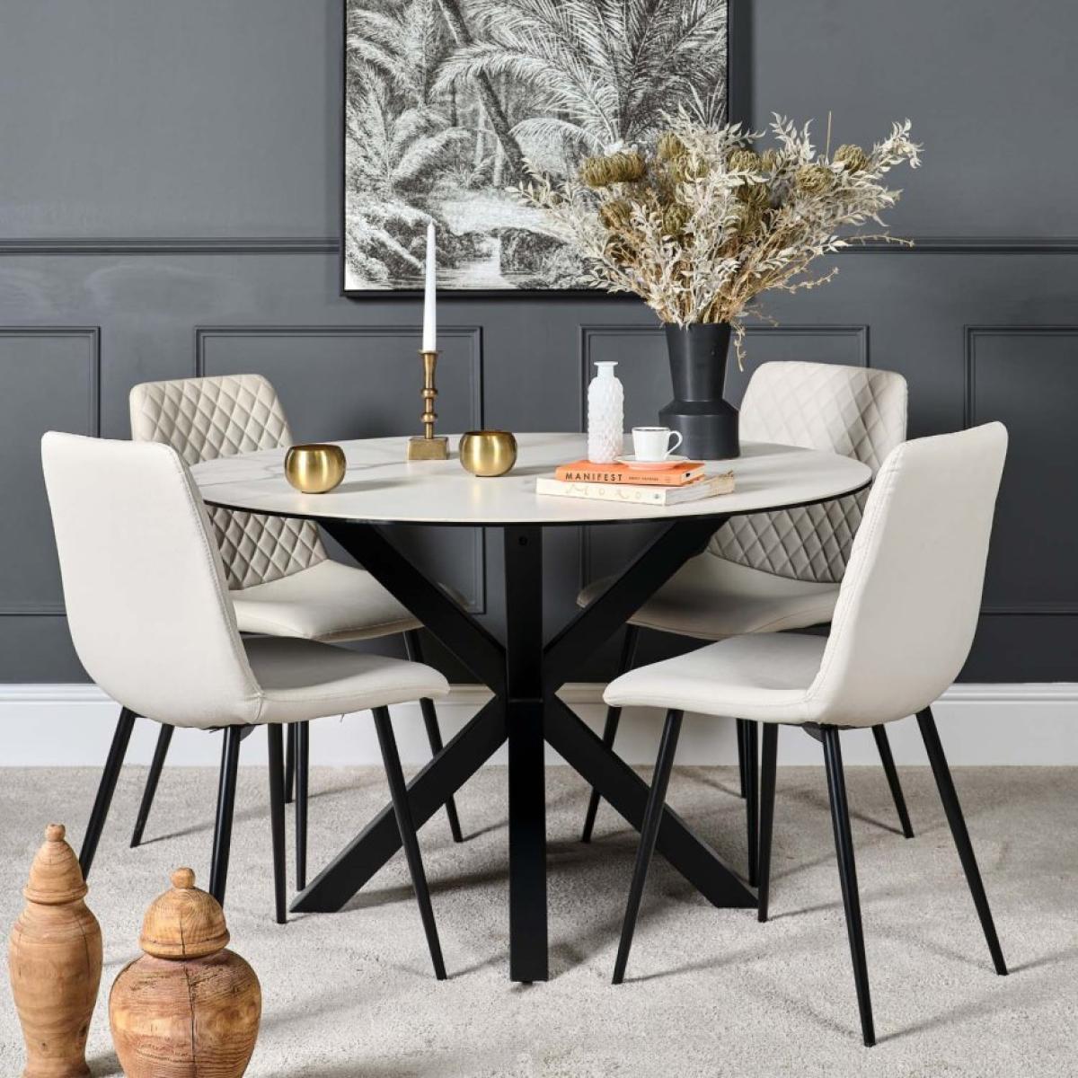 The Eastcote round ceramic top dining table is a new addition to our Eastcote range.. The surface is a slate effect white finish, layered on top of a sheet of tempered glass for an ultra modern finish. Supported by imposing star formation black powder-coated metal legs, and a round top, this table is ideal for any contemporary dining room. The ceramic material on the top of this stunning dining table is very hard wearing, and is scratch and stain resistant. However, we would still recommend care when using heavy cookware or tableware to not drag items across it. This table is also available in a black top finish. *Also available in black. *W:119cm D:119cm H:75.5cm *Ceramic top *Heavy duty metal legs *Simple self assembly