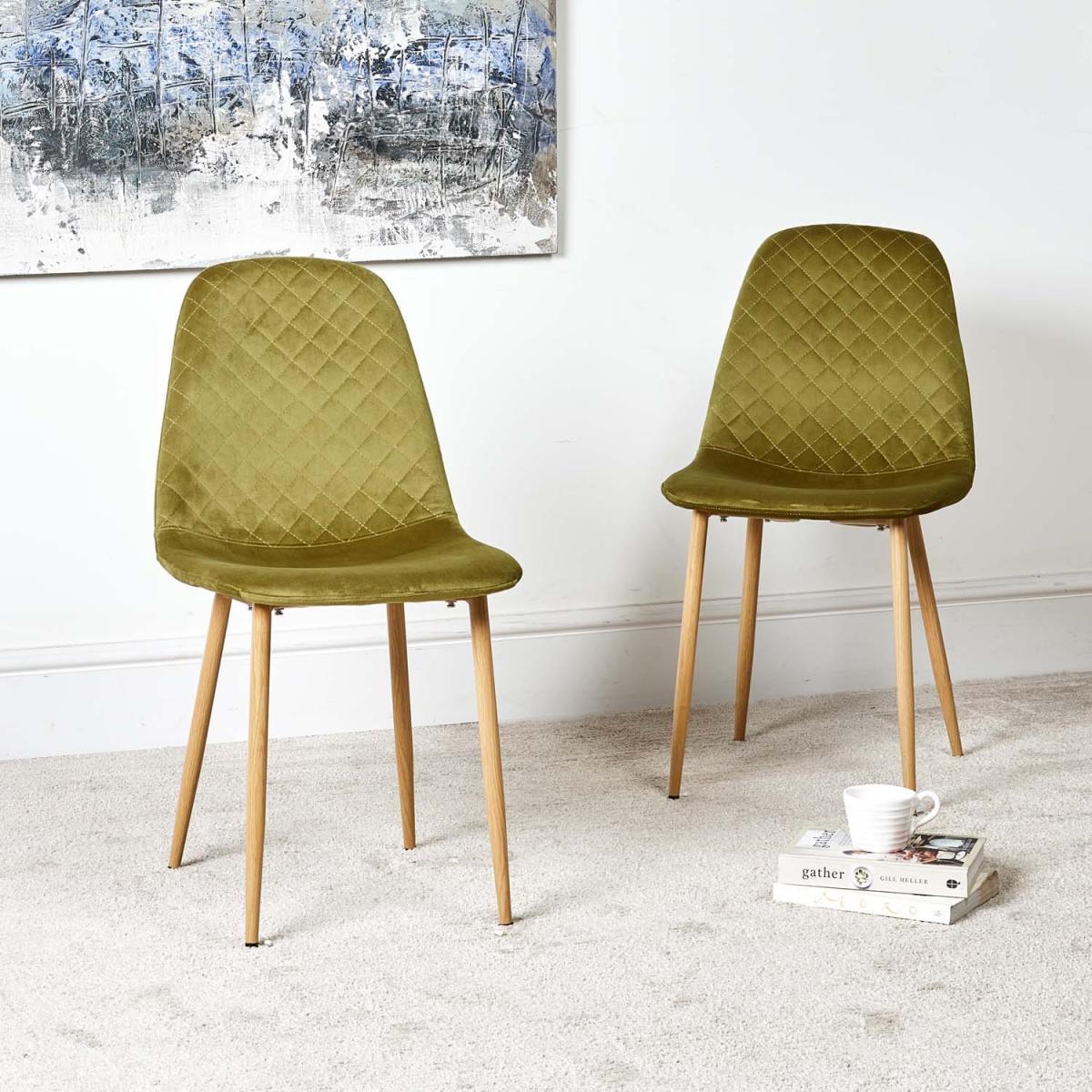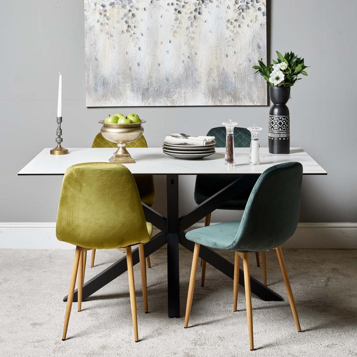 Bring modern style and a pop of colour to your dining area with the Eastcote white dining table, and the light and dark green Archie dining chairs with wood legs.