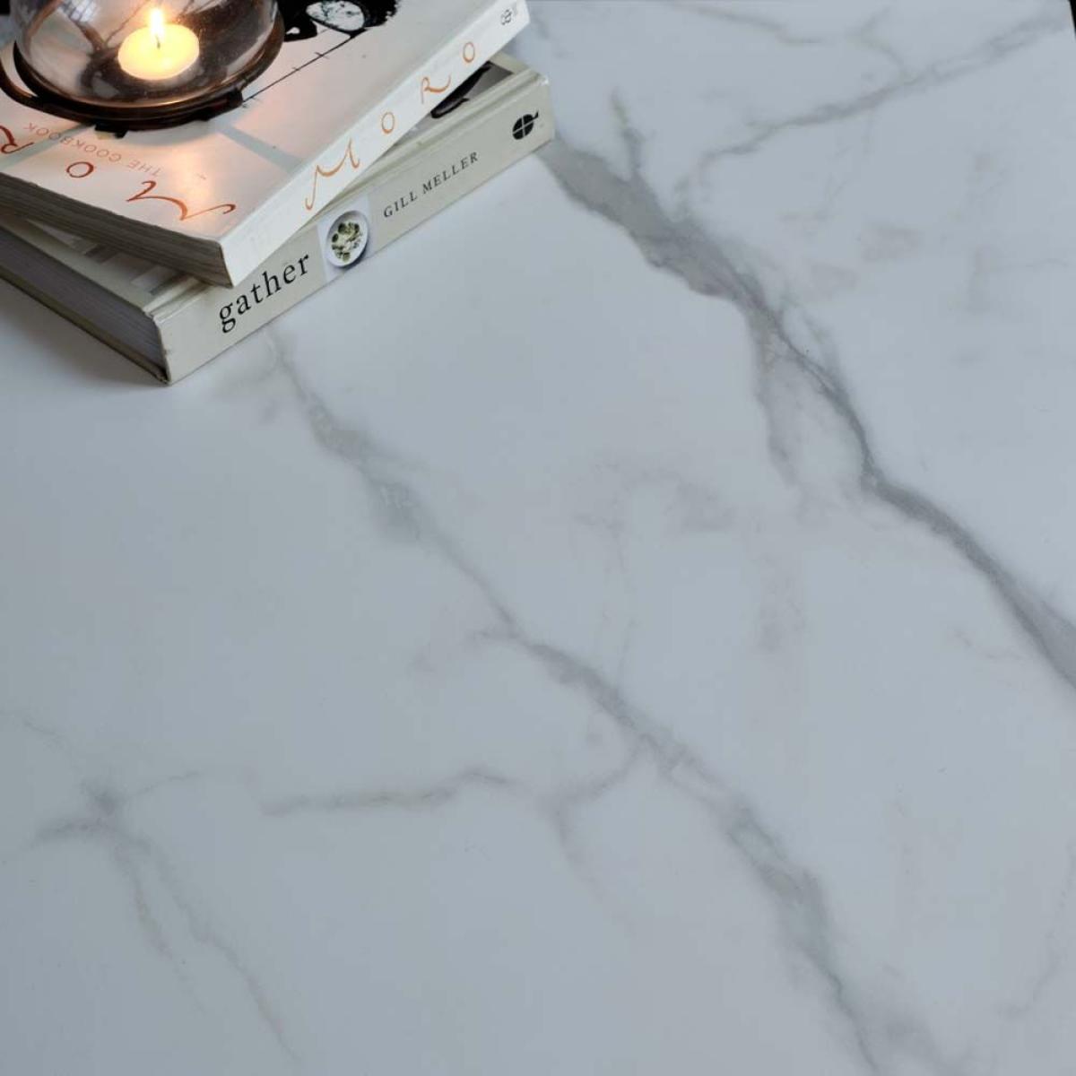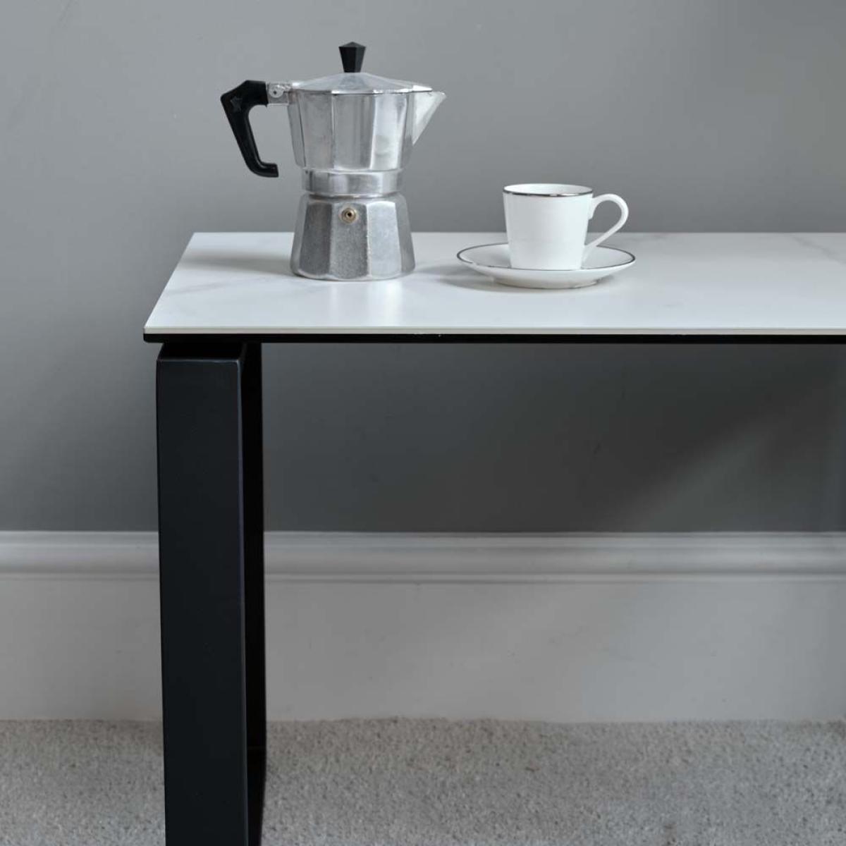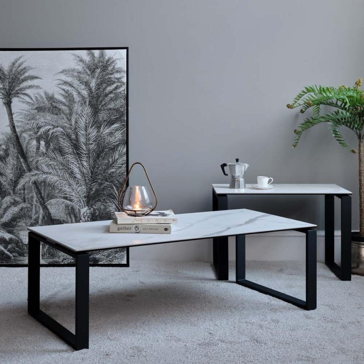 The Eastcote Coffee amp; Lamp Table set is simply the perfect pairing. Two great pieces of modern furniture that compliment each other perfectly. Both ceramic topped the two tables have a smooth surface in a marble effect ceramic white finish, and layered on top of a sheet of tempered glass. The tables are supported by two black powder-coated metal hoop legs. The ceramic material on the top of these tables is very hard wearing, and is scratch and stain resistant, unlike a natural stone finish. However, we would recommend care when using heavy and rough finish items to not drag things across it. Lamp Table Dimensions: W40cm x H45cm x L69cm. Coffee Table Dimensions: W55cm x H38cm x L115cm Ceramic top Heavy duty metal legs. Simple self assembly
