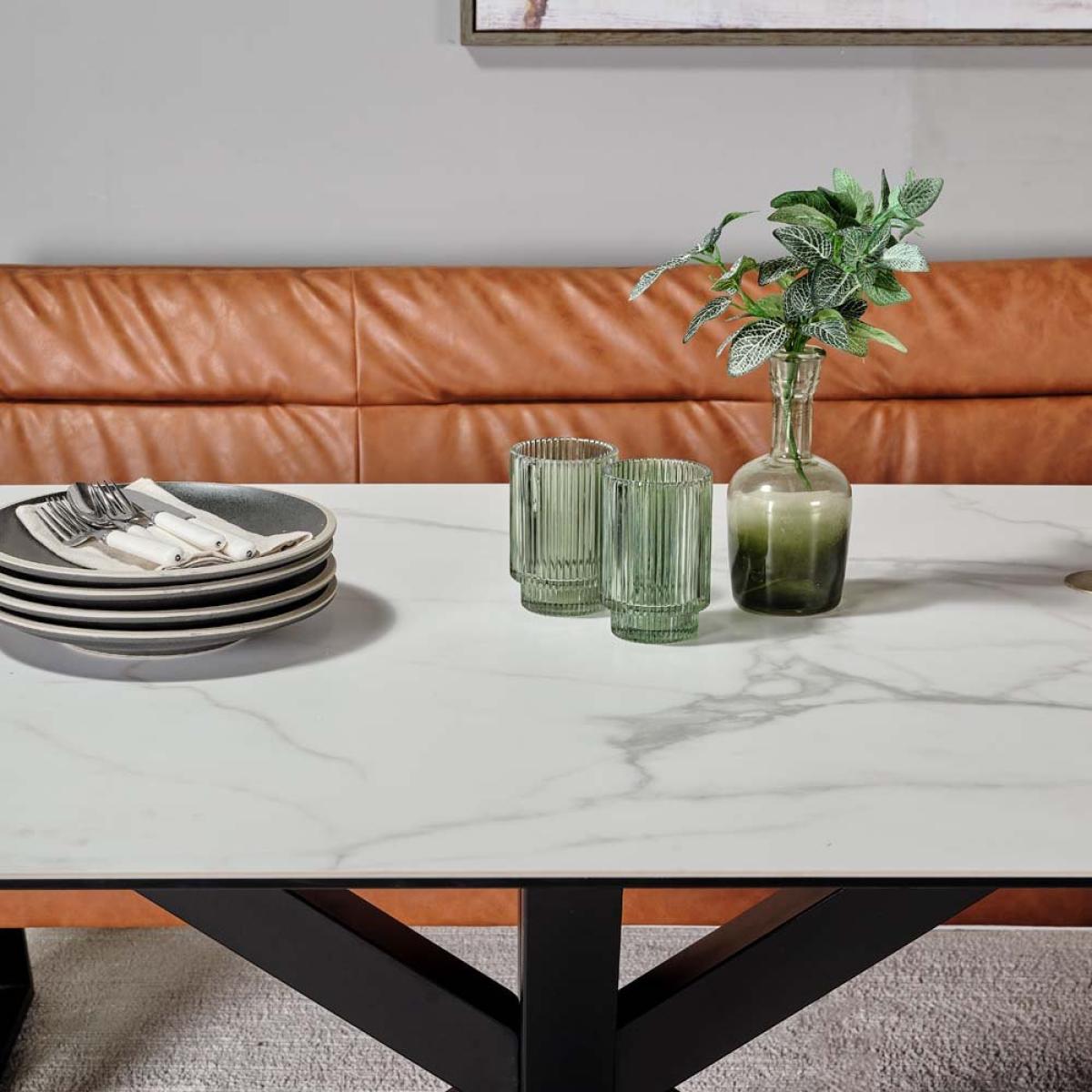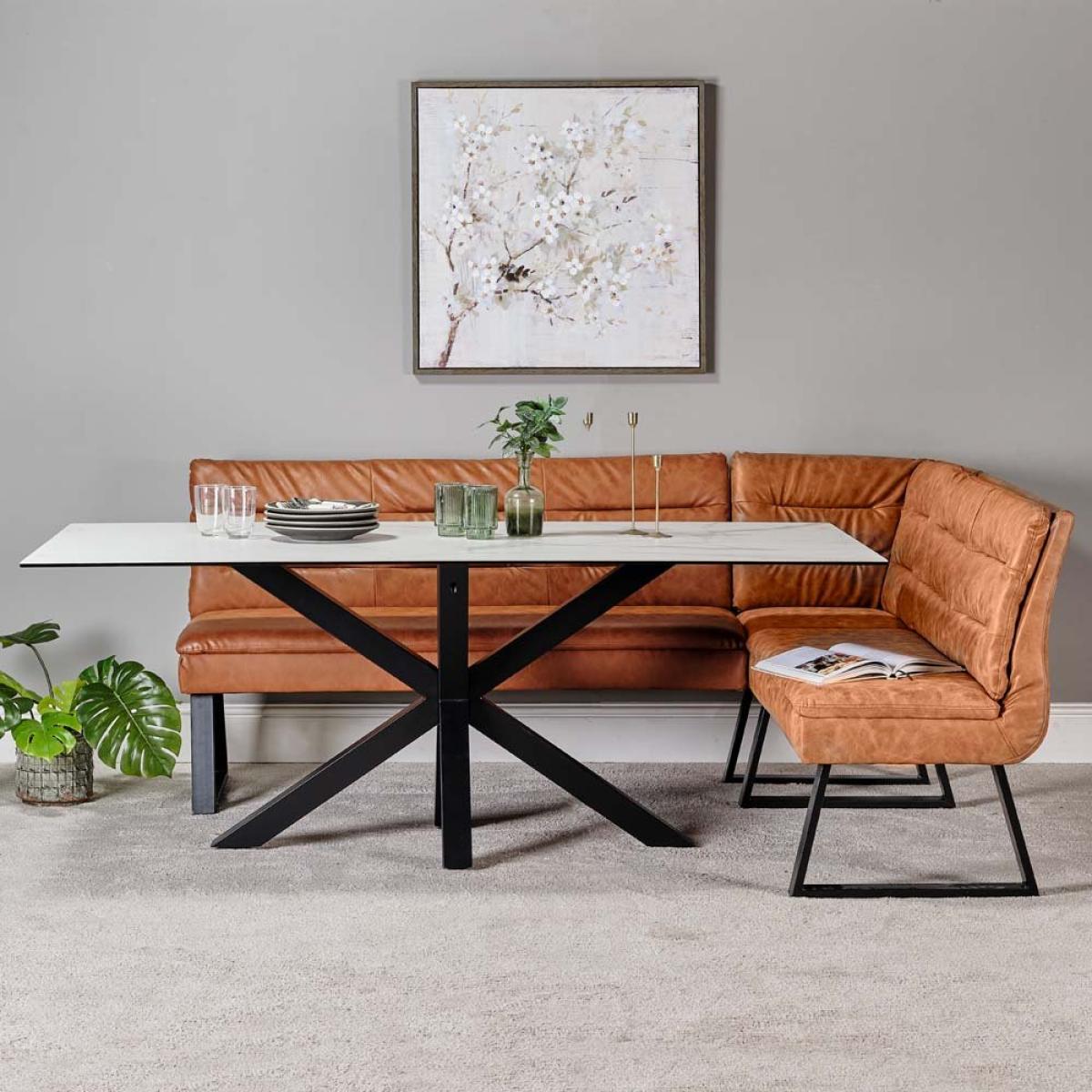 This amazing Bundle includes the 200cm Eastcote Dining Table and Industrial Corner Bench. The Dining table has a hard-wearing Ceramic top which is both scratch and stain resistant. Supported by Black coated metal legs in a star formation. It is Complimented beautifully by the Industrial Corner Bench in Tan Leather effect, the perfect setting for socialising and communal dining.