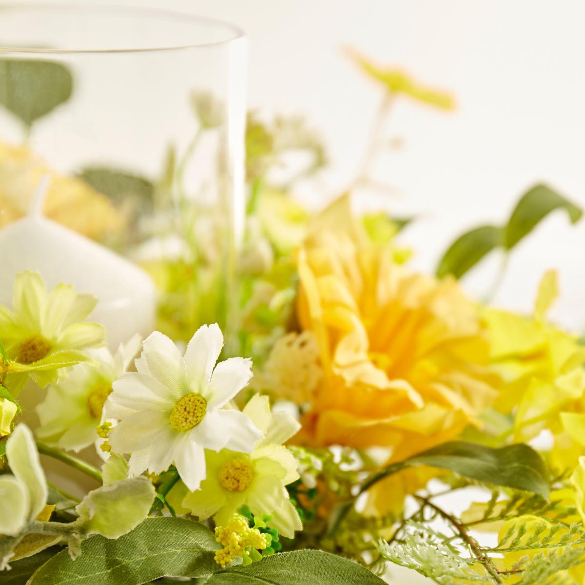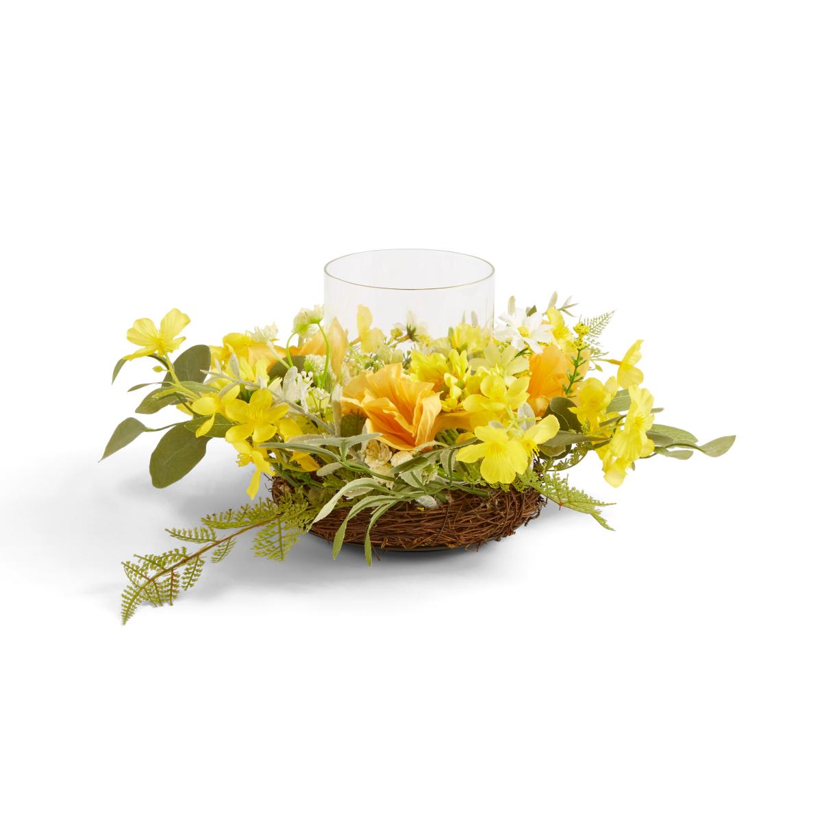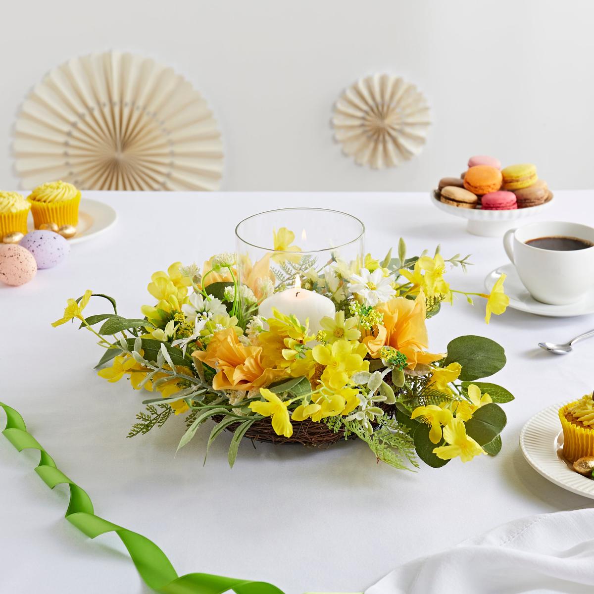 * Easter design* Artificial Daffodils* Great for a table display Display candles in a bright and joyous way this Easter with the Easter Candle Holder with Daffodils. Perfect for adding a spot of nature to your table.