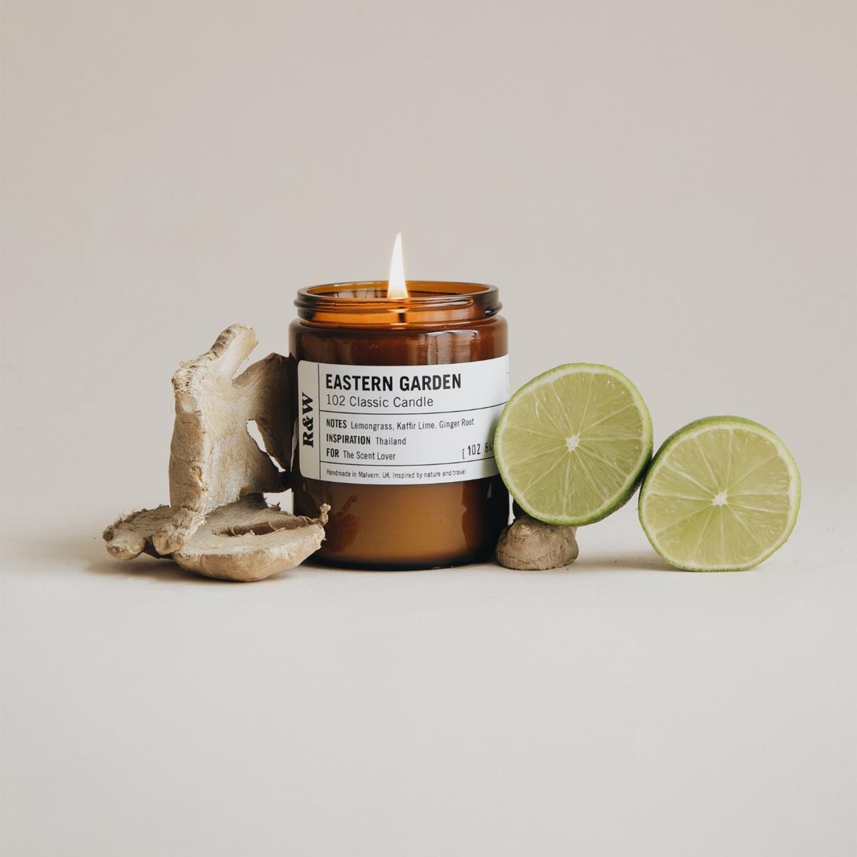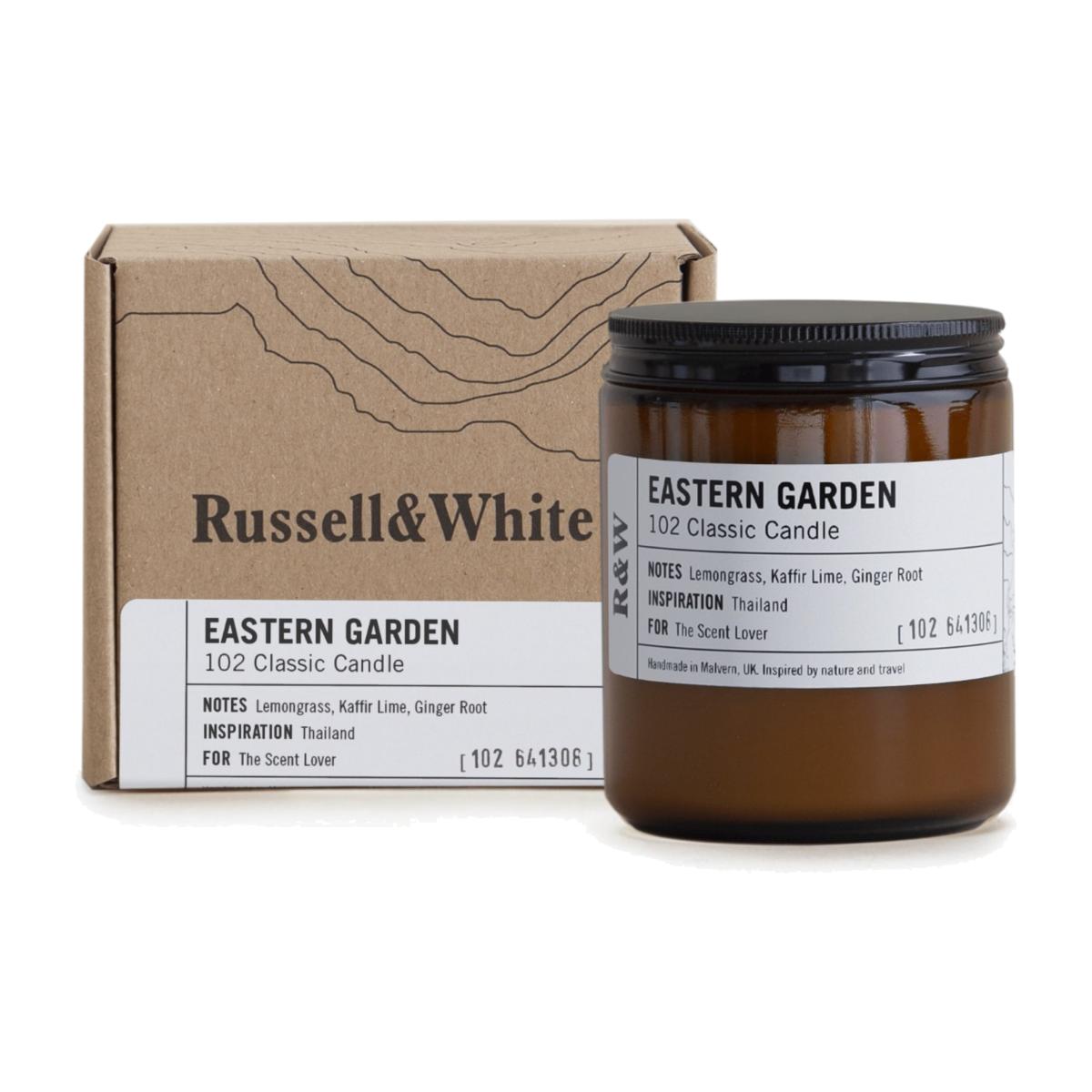 Citrusy lemongrass and pungent kaffir lime rind blend together with fresh ginger root and earthy patchouli to create a bright and rich scent, evoking the aroma of a wild Southeast Asian garden. Our most-popular size, the classic candle fits all occasions and fragrances every type of room or space. Made using 100% soy wax and set in an amber glass jar with a single cotton/linen mix wick, topped with an aluminium screw top lid. Enclosed within a signature Russell & White box, inspired by the hills in our hometown of Malvern.