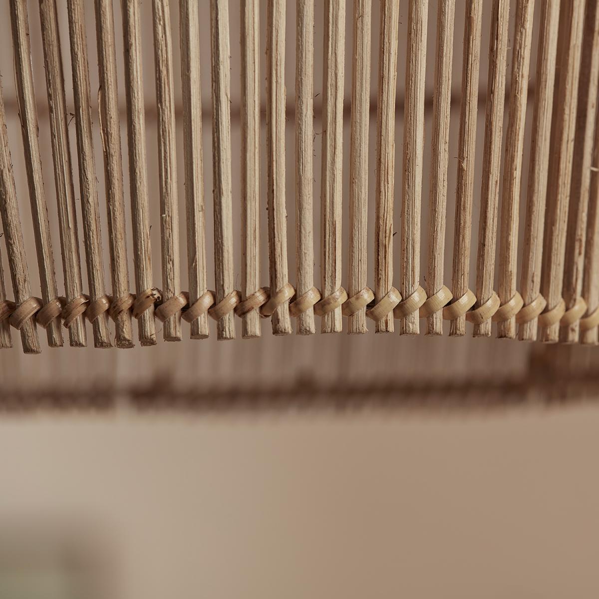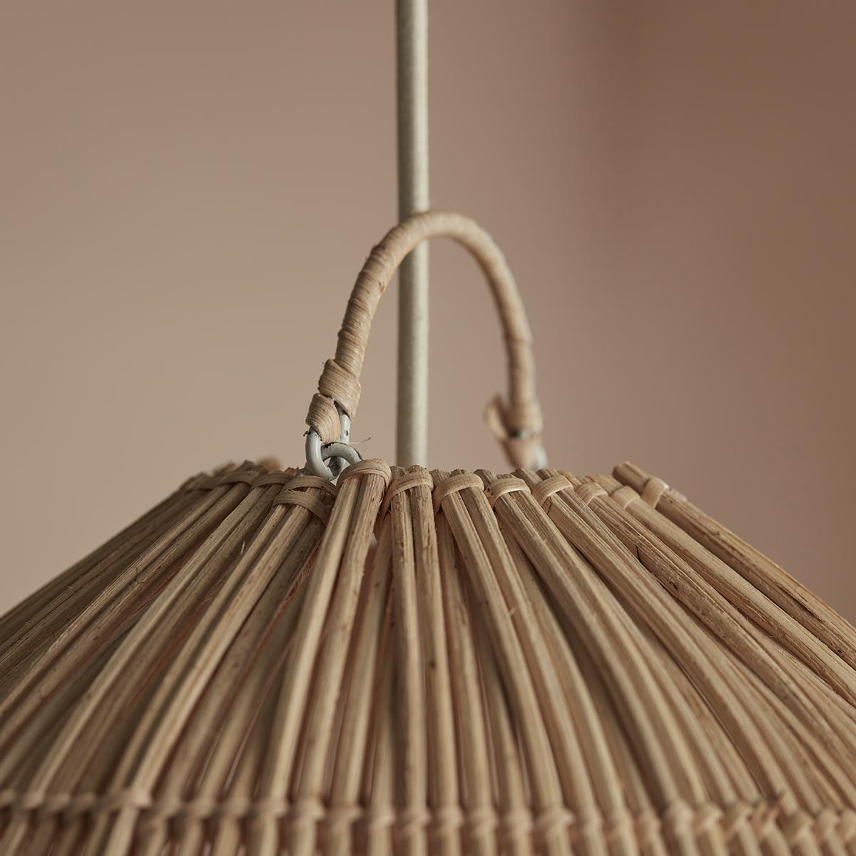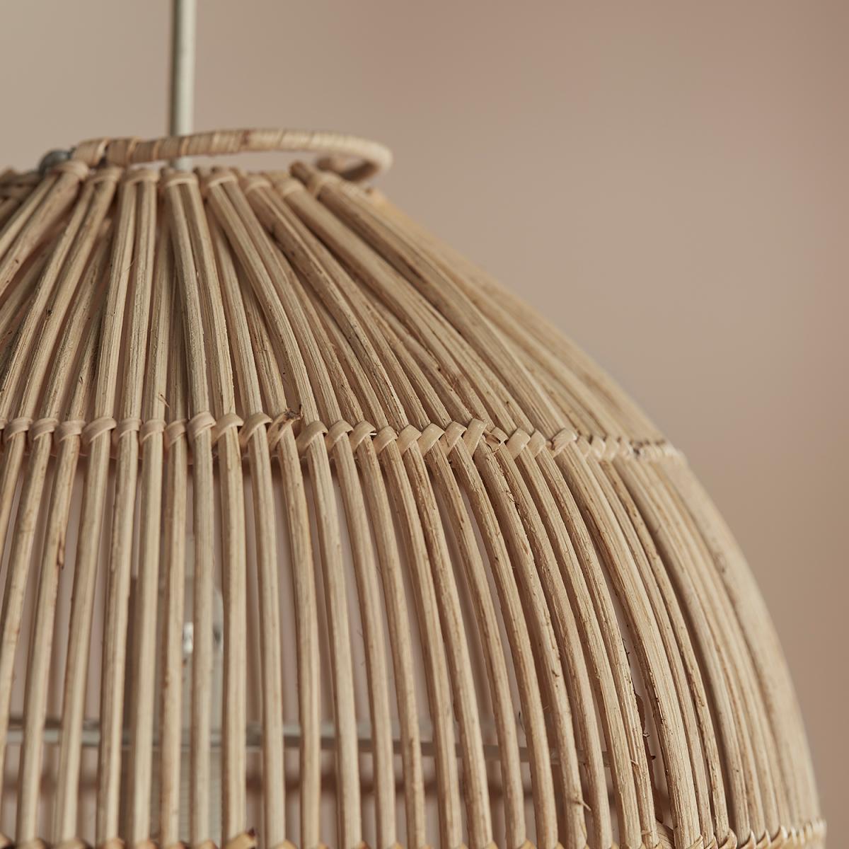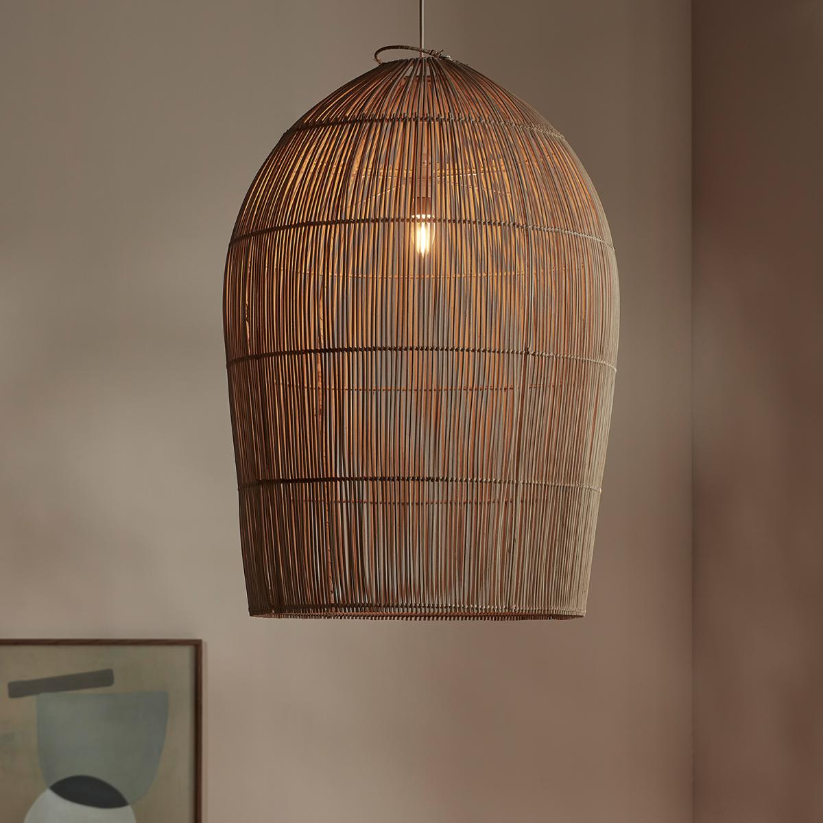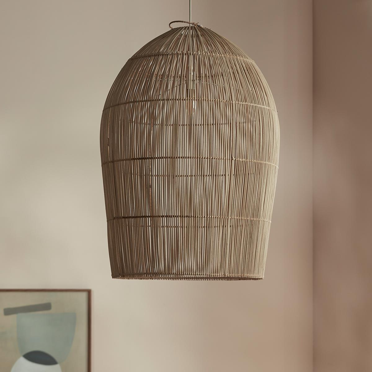 Hone your home lighting with the beautiful curves and playful shape of this Indo-chic Eastern Lampshade in natural tones the largest out of a set of 3. This intriguing birdcage lampshade design is made from natural rattan and will fill a room with warm ambience but also breathe character and culture into the home. This basket lampshade doesn't just offer fantastic looks but also a warming story backed by ethically responsible standards. These are lovingly handmade in Indonesia by women who are in turn supported by a sustainable entrepreneur program. This allows the makers to live and work within their communities saving any need to move to the city away from their families. The materials used are all eco-sourced vegan friendly and renewable as such each one is a little unique in their construction but no less beautiful. Electricals not included.