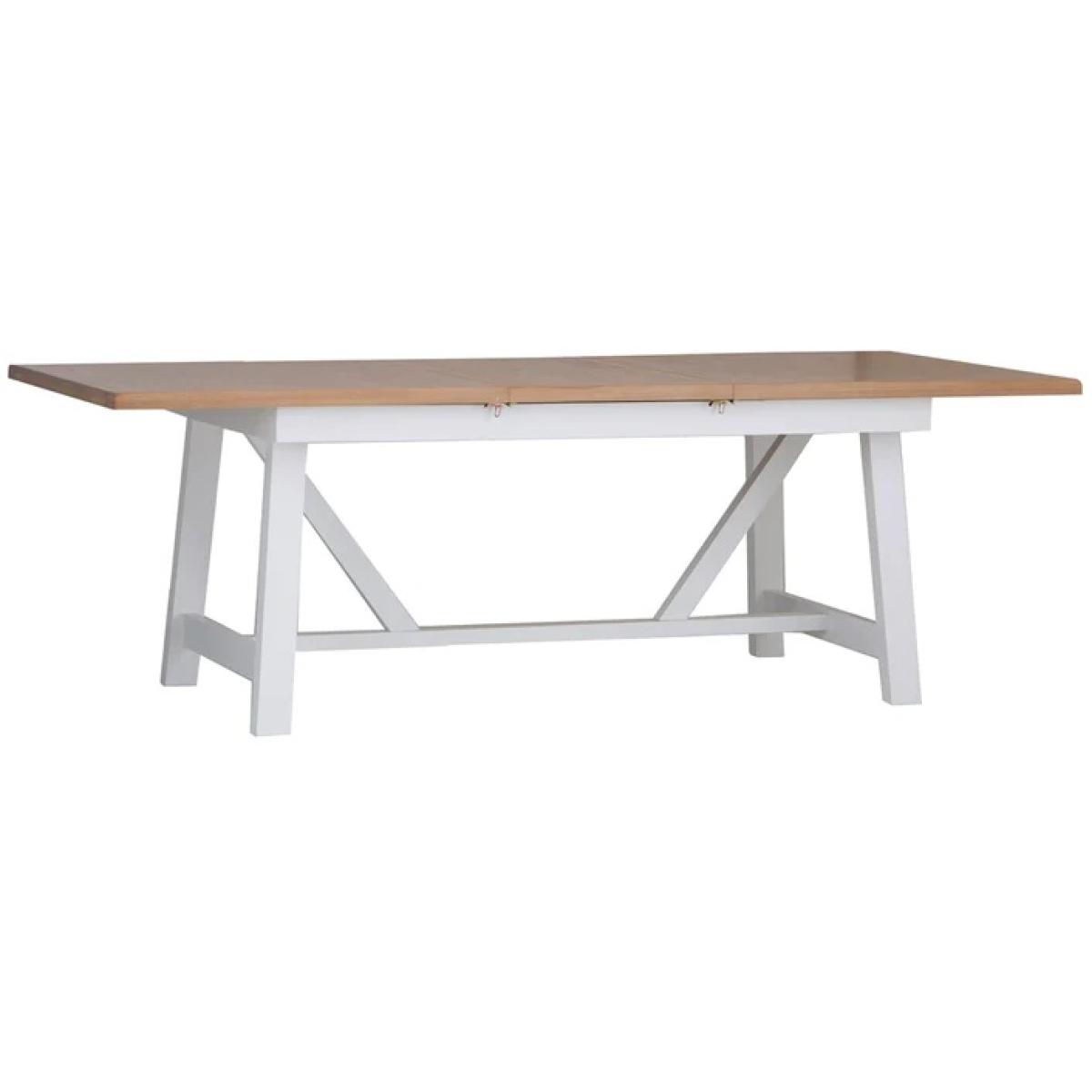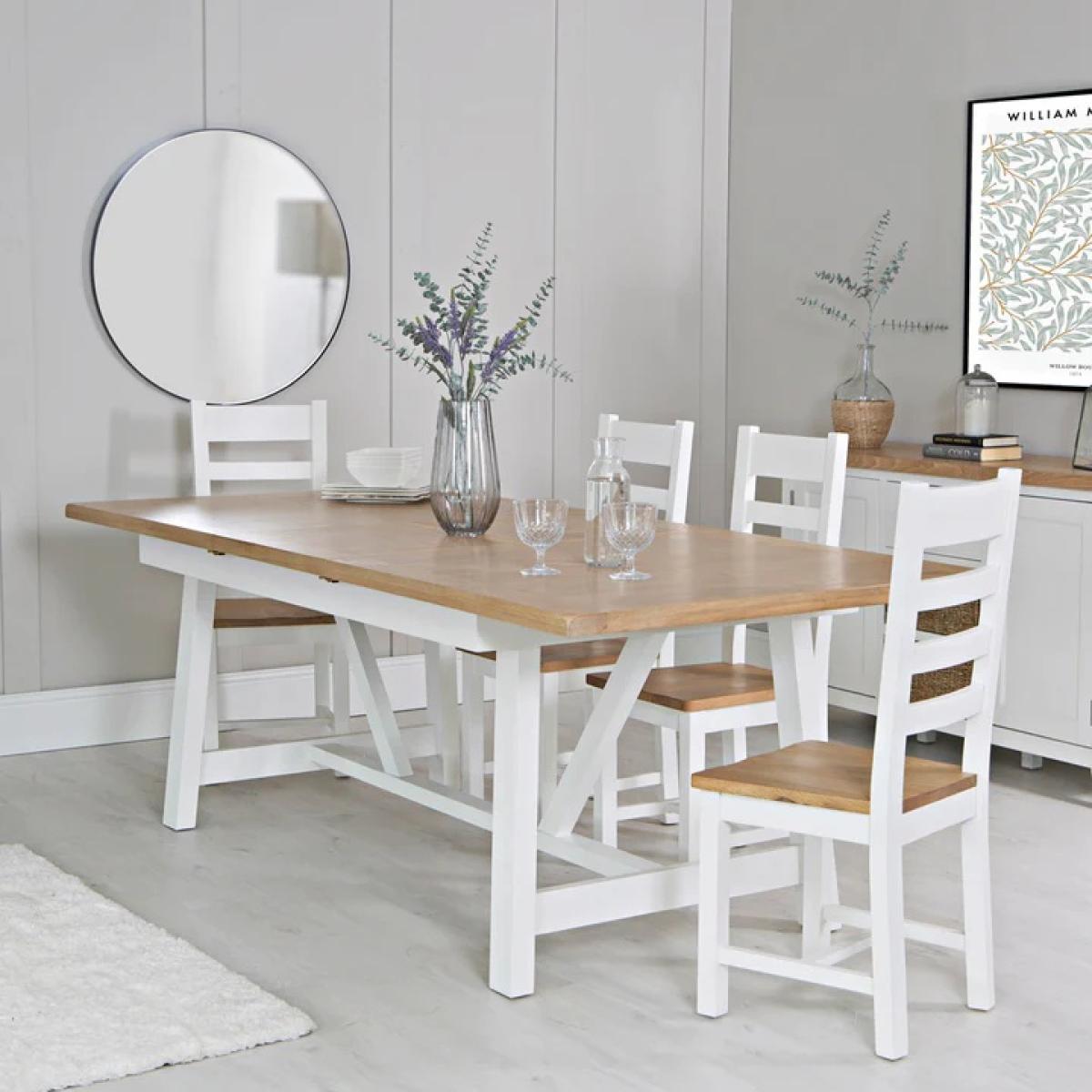 With washed oak tops and a beautifully painted finish and chrome elements, this dining collection seamlessly blends rustic warmth with contemporary design, adding a classic but stylish feel to any dining space. The Easton 1.2m Butterfly Extending Dining Table in White features butterfly mechanism and aluminium ball bearing runner for smooth extending action. This range is also available in Grey. Features: Assembly Required: Assembly Required Butterfly Mechanism Aluminium ball bearing runner for smooth extending action Clips to lock in extended or standard position Quality Oak Top for Durability Modern Style Country Design Made From Solid Oak, Pine & Real Veneer Dimensions: Height: 78cm Width: 180cm / 235cm Depth: 100cm All screens vary in colour reproduction and whilst every effort has been made to display the colour as accurately as possible it is for guidance only.