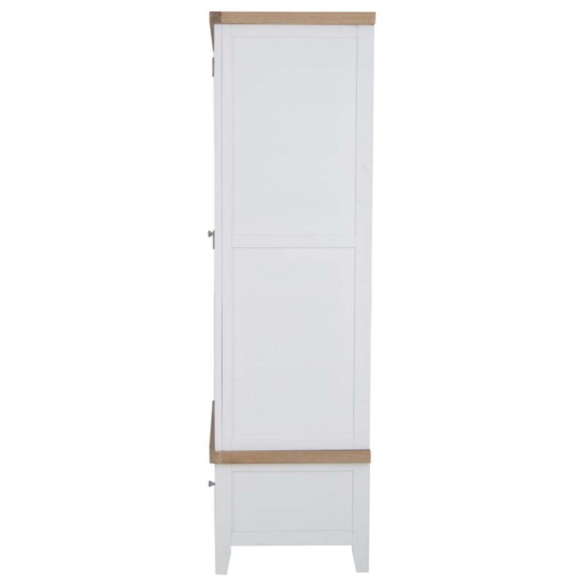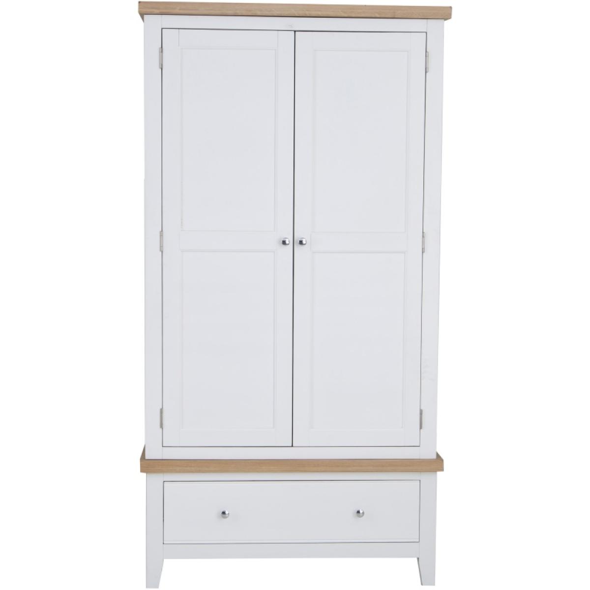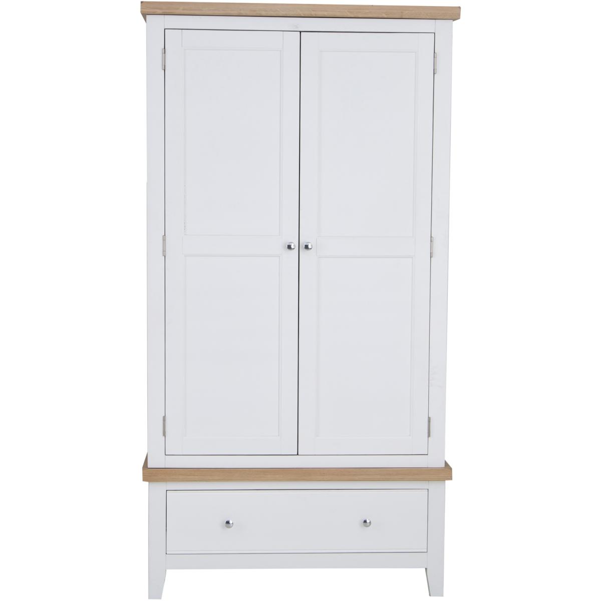 With washed oak tops and a beautifully painted finish and chrome elements, this bedroom collection seamlessly blends rustic warmth with contemporary design, adding a classic but stylish feel to any bedroom. The Easton 2 Door Wardrobe in White features chrome handles and a hardwood hanging rail. This range is also available in Grey. Features: Assembly required. Chrome Handles Hardwood Hanging Rail Clean Internal Finish Available in a White or Grey Finish. Quality Oak Top for Durability Modern Style Country Design Made From Solid Oak, Pine & Real Veneer Dimensions: Height: 190cm Width: 100cm Depth: 55cm All screens vary in colour reproduction and whilst every effort has been made to display the colour as accurately as possible it is for guidance only.